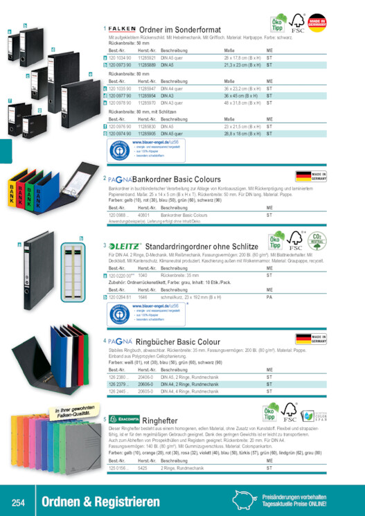 b a d c f g 1 Ordner im Sonderformat Mit aufgeklebtem Rückenschild. Mit Hebelmechanik. Mit Griffloch. Material: Hartpappe. Farbe: schwarz. Rückenbreite: 50 mm Best.-Nr. Herst.-Nr. Beschreibung Maße ME a 120 1034 90 11285921 DIN A5 quer 28 x 17,8 cm (B x H) ST b 120 0973 90 11285889 DIN A5 21,3 x 23 cm (B x H) ST e Rückenbreite: 80 mm Best.-Nr. Herst.-Nr. Beschreibung c 120 1035 90 11285947 DIN A4 quer d 120 0977 90 11285954 DIN A3 e 120 0978 90 11285970 DIN A3 quer Maße 36 x 23,2 cm (B x H) 36 x 45 cm (B x H) 48 x 31,8 cm (B x H) ME ST ST ST Rückenbreite: 80 mm, mit Schlitzen Best.-Nr. Herst.-Nr. Beschreibung f 120 0976 90 11285830 DIN A5 g 120 0974 90 11285905 DIN A5 quer Maße 23 x 21,5 cm (B x H) 28,8 x 18 cm (B x H) ME ST ST 2 Bankordner Basic Colours Bankordner in buchbinderischer Verarbeitung zur Ablage von Kontoauszügen. Mit Rückenprägung und laminiertem Papiereinband. Maße: 25 x 14 x 5 cm (B x H x T). Rückenbreite: 50 mm. Für DIN lang. Material: Pappe. Farben: gelb (10), rot (30), blau (50), grün (60), schwarz (90) Best.-Nr. Herst.-Nr. Beschreibung ME 120 0988 .. 40801 Bankordner Basic Colours Anwendungsbeispiel(e). Lieferung erfolgt ohne Inhalt/Deko. ST * b a 3 Standardringordner ohne Schlitze Für DIN A4. 2 Ringe, D-Mechanik. Mit Reißmechanik. Fassungsvermögen: 200 Bl. (80 g/m²). Mit Blattniederhalter. Mit Deckblatt. Mit Kantenschutz. Klimaneutral produziert. Kaschierung außen mit Wolkenmarmor. Material: Graupappe, recycelt. Best.-Nr. Herst.-Nr. Beschreibung ME a 120 0220 00** 1040 Rückenbreite: 35 mm Zubehör: Ordnerrückenetikett, Farbe: grau, Inhalt: 10 Etik./Pack. ST Best.-Nr. Herst.-Nr. Beschreibung ME b 120 0294 81 1646 schmal/kurz, 23 x 192 mm (B x H) PA * 4 Ringbücher Basic Colour Stabiles Ringbuch, abwaschbar. Rückenbreite: 35 mm. Fassungsvermögen: 200 Bl. (80 g/m²). Material: Pappe. Einband aus Polypropylen Cellophanierung. Farben: weiß (01), rot (30), blau (50), grün (60), schwarz (90) Best.-Nr. Herst.-Nr. Beschreibung ME 126 2380 .. 20406-0 DIN A5, 2 Ringe, Rundmechanik ST 126 2379 .. 20606-0 DIN A4, 2 Ringe, Rundmechanik ST 126 2445 .. 20605-0 DIN A4, 4 Ringe, Rundmechanik ST InFaIhlkreern-gQeuwaolihtäntt.en 5 Ringhefter Dieser Ringhefter besteht aus einem homogenen, edlen Material, ohne Zusatz von Kunststoff. Flexibel und strapazierfähig, ist er für den regelmäßigen Gebrauch geeignet. Dank des geringen Gewichts ist er leicht zu transportieren. Auch zum Abheften von Prospekthüllen und Registern geeignet. Rückenbreite: 20 mm. Für DIN A4. Fassungsvermögen: 140 Bl. (80 g/m²). Mit Gummizugverschluss. Material: Colorspankarton. Farben: gelb (10), orange (20), rot (30), rosa (32), violett (40), blau (50), türkis (57), grün (60), lindgrün (62), grau (80) Best.-Nr. Herst.-Nr. Beschreibung ME 125 0156 .. 5425 2 Ringe, Rundmechanik ST 254 Ordnen & Registrieren Preisänderungen vorbehalten Tagesaktuelle Preise ONLINE!