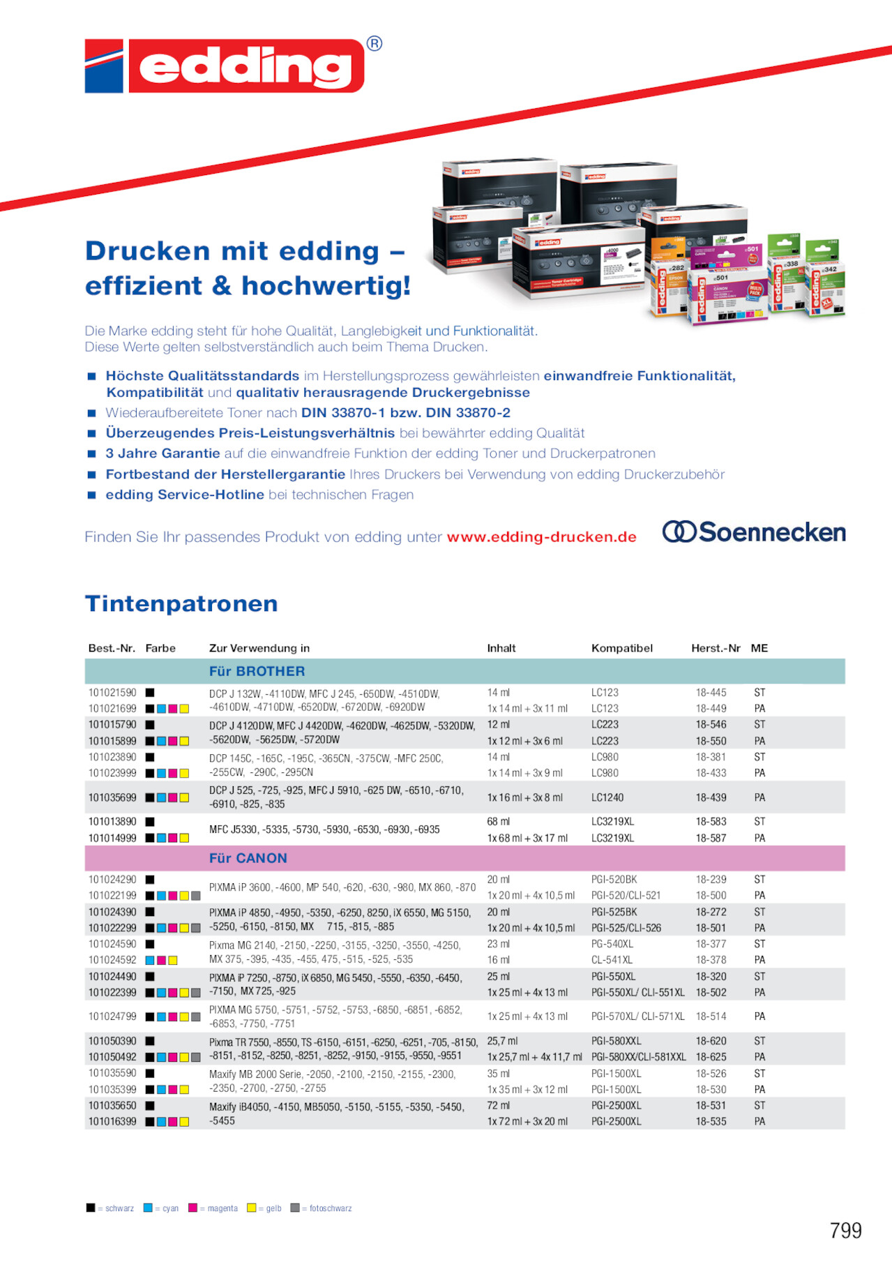Drucken mit edding – effizient & hochwertig! Die Marke edding steht für hohe Qualität, Langlebigkeit und Funktionalität. Diese Werte gelten selbstverständlich auch beim Thema Drucken. Höchste Qualitätsstandards im Herstellungsprozess gewährleisten einwandfreie Funktionalität, Kompatibilität und qualitativ herausragende Druckergebnisse Wiederaufbereitete Toner nach DIN 33870-1 bzw. DIN 33870-2 Überzeugendes Preis-Leistungsverhältnis bei bewährter edding Qualität 3 Jahre Garantie auf die einwandfreie Funktion der edding Toner und Druckerpatronen Fortbestand der Herstellergarantie Ihres Druckers bei Verwendung von edding Druckerzubehör edding Service-Hotline bei technischen Fragen Finden Sie Ihr passendes Produkt von edding unter www.edding-drucken.de Tintenpatronen Best.-Nr. Farbe 101021590 101021699 101015790 101015899 101023890 101023999 101035699 101013890 101014999 101024290 101022199 101024390 101022299 101024590 101024592 101024490 101022399 101024799 101050390 101050492 101035590 101035399 101035650 101016399 Zur Verwendung in Inhalt Kompatibel Herst.-Nr ME Für BROTHER DCP J 132W, -4110DW, MFC J 245, -650DW, -4510DW, -4610DW, -4710DW, -6520DW, -6720DW, -6920DW DCP J 4120DW, MFC J 4420DW, -4620DW, -4625DW, -5320DW, -5620DW, -5625DW, -5720DW DCP 145C, -165C, -195C, -365CN, -375CW, -MFC 250C, -255CW, -290C, -295CN DCP J 525, -725, -925, MFC J 5910, -625 DW, -6510, -6710, -6910, -825, -835 MFC J5330, -5335, -5730, -5930, -6530, -6930, -6935 14 ml 1x 14 ml + 3x 11 ml 12 ml 1x 12 ml + 3x 6 ml 14 ml 1x 14 ml + 3x 9 ml 1x 16 ml + 3x 8 ml 68 ml 1x 68 ml + 3x 17 ml LC123 LC123 LC223 LC223 LC980 LC980 LC1240 LC3219XL LC3219XL 18-445 18-449 18-546 18-550 18-381 18-433 18-439 18-583 18-587 ST PA ST PA ST PA PA ST PA Für CANON PIXMA iP 3600, -4600, MP 540, -620, -630, -980, MX 860, -870 20 ml 1x 20 ml + 4x 10,5 ml PGI-520BK PGI-520/CLI-521 18-239 18-500 PIXMA iP 4850, -4950, -5350, -6250, 8250, iX 6550, MG 5150, 20 ml PGI-525BK -5250, -6150, -8150, MX 715, -815, -885 1x 20 ml + 4x 10,5 ml PGI-525/CLI-526 18-272 18-501 Pixma MG 2140, -2150, -2250, -3155, -3250, -3550, -4250, MX 375, -395, -435, -455, 475, -515, -525, -535 23 ml 16 ml PG-540XL CL-541XL 18-377 18-378 PIXMA iP 7250, -8750, iX 6850, MG 5450, -5550, -6350, -6450, -7150, MX 725, -925 25 ml 1x 25 ml + 4x 13 ml PGI-550XL 18-320 PGI-550XL/ CLI-551XL 18-502 PIXMA MG 5750, -5751, -5752, -5753, -6850, -6851, -6852, -6853, -7750, -7751 1x 25 ml + 4x 13 ml PGI-570XL/ CLI-571XL 18-514 Pixma TR 7550, -8550, TS -6150, -6151, -6250, -6251, -705, -8150, 25,7 ml PGI-580XXL 18-620 -8151, -8152, -8250, -8251, -8252, -9150, -9155, -9550, -9551 1x 25,7 ml + 4x 11,7 ml PGI-580XX/CLI-581XXL 18-625 Maxify MB 2000 Serie, -2050, -2100, -2150, -2155, -2300, -2350, -2700, -2750, -2755 35 ml 1x 35 ml + 3x 12 ml PGI-1500XL PGI-1500XL 18-526 18-530 Maxify iB4050, -4150, MB5050, -5150, -5155, -5350, -5450, -5455 72 ml 1x 72 ml + 3x 20 ml PGI-2500XL PGI-2500XL 18-531 18-535 ST PA ST PA ST PA ST PA PA ST PA ST PA ST PA = schwarz = cyan = magenta = gelb = fotoschwarz 799