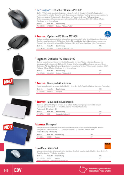 916 EDV 1 Optische PC Maus Pro Fit® Die Pro Fit®-Serie bietet zuverlässig die Leistung und den Komfort, die Benutzer im Geschäftsalltag brauchen. Hochempfindlicher, optischer Sensor für exakte Cursorsteuerung und präzises Tracking. Spezielle daumengesteuerte Webbrowsernavigation für die schnellere Durchführung von Aufgaben im Browser. Für Rechtshänder. Systemvoraussetzung: Windows®, Mac universell. Anschluss: USB-A. Auflösung: 800/1.200/1.600 dpi. 5 Tasten. Kabellänge: 1,8 m. Farbe: schwarz. Best.-Nr. Herst.-Nr. Beschreibung ME 780 0069 90 K72369EU Optische PC Maus Pro Fit® ST 2 Optische PC Maus MC-300 Geräuscharme Haupttasten ermöglichen störungsfreies und entspanntes Arbeiten ohne Klickgeräusche. Gummierte Oberfläche sorgt für verbesserte Griffigkeit und Komfort. Für Linkshänder, Rechtshänder. Systemvoraussetzung: Windows®, Mac universell. Anschluss: USB-A. Auflösung: 1.200 dpi. 3 Tasten. Kabellänge: 1,8 m. Farbe: schwarz. Best.-Nr. Herst.-Nr. Beschreibung ME 785 0342 90 00182606 Optische PC Maus MC-300 ST 3 Optische PC Maus B100 Dank der angenehmen und flachen Form liegt die Maus gut in der Hand. Flüssige und präzise Steuerung des Mauszeigers. Sofort einsatzbereit: Schließen Sie die Maus einfach an einen USB-Anschluss an und schon können Sie loslegen. Für Linkshänder, Rechtshänder. Systemvoraussetzung: Windows®, Mac universell. Anschluss: USB-A. Auflösung: 800 dpi. 3 Tasten. Kabellänge: 1,8 m. Farbe: schwarz. Best.-Nr. Herst.-Nr. Beschreibung 780 2978 90 910-003357 Optische PC Maus B100 ME ST 4 Mauspad Aluminium Absolut wasserfest, leicht zu reinigen. Maße: 22 x 0,3 x 18 cm (B x H x T). Rutschfest. Material: Aluminium. Farbe: silber. Best.-Nr. Herst.-Nr. 187 0420 94 00054781 Beschreibung Mauspad ME ST 5 Mauspad in Lederoptik Bietet eine optimale Gleitfähigkeit der Maus. Ist für nahezu alle Maustypen geeignet und leicht zu reinigen. Maße: 22 x 0,3 x 18 cm (B x H x T). Rutschfest. Material: Polyurethan/Naturgummi. Farben: weiß (01), schwarz (90) Best.-Nr. Herst.-Nr. Beschreibung ME 187 2373 .. 0005 Mauspad in Lederoptik ST 6 Mauspad Mauspad als praktischer Begleiter: ob im Büro oder im Home Office. Für eine optimale Gleitfähigkeit der Maus. Mausgerechte Oberfläche. Maße: 22,3 x 0,3 x 18,3 cm (B x H x T). Rutschfest. Material: Jersey. Farben: blau (50), schwarz (90) Best.-Nr. Herst.-Nr. Beschreibung ME 187 2544 .. 0005417 Mauspad ST 7 Mauspad Mit abgerundeten Kanten. Mit veloursähnlicher Oberfläche. Extraflach, fusselfrei. Maße: 30 x 0,2 x 20 cm (B x H x T). Rutschfest. Material: PVC. Farbe: dunkelblau. Best.-Nr. Herst.-Nr. Beschreibung ME 187 2352 50 570007 Mauspad Anwendungsbeispiel(e). Lieferung erfolgt ohne Inhalt/Deko. ST Preisänderungen vorbehalten Tagesaktuelle Preise ONLINE!
