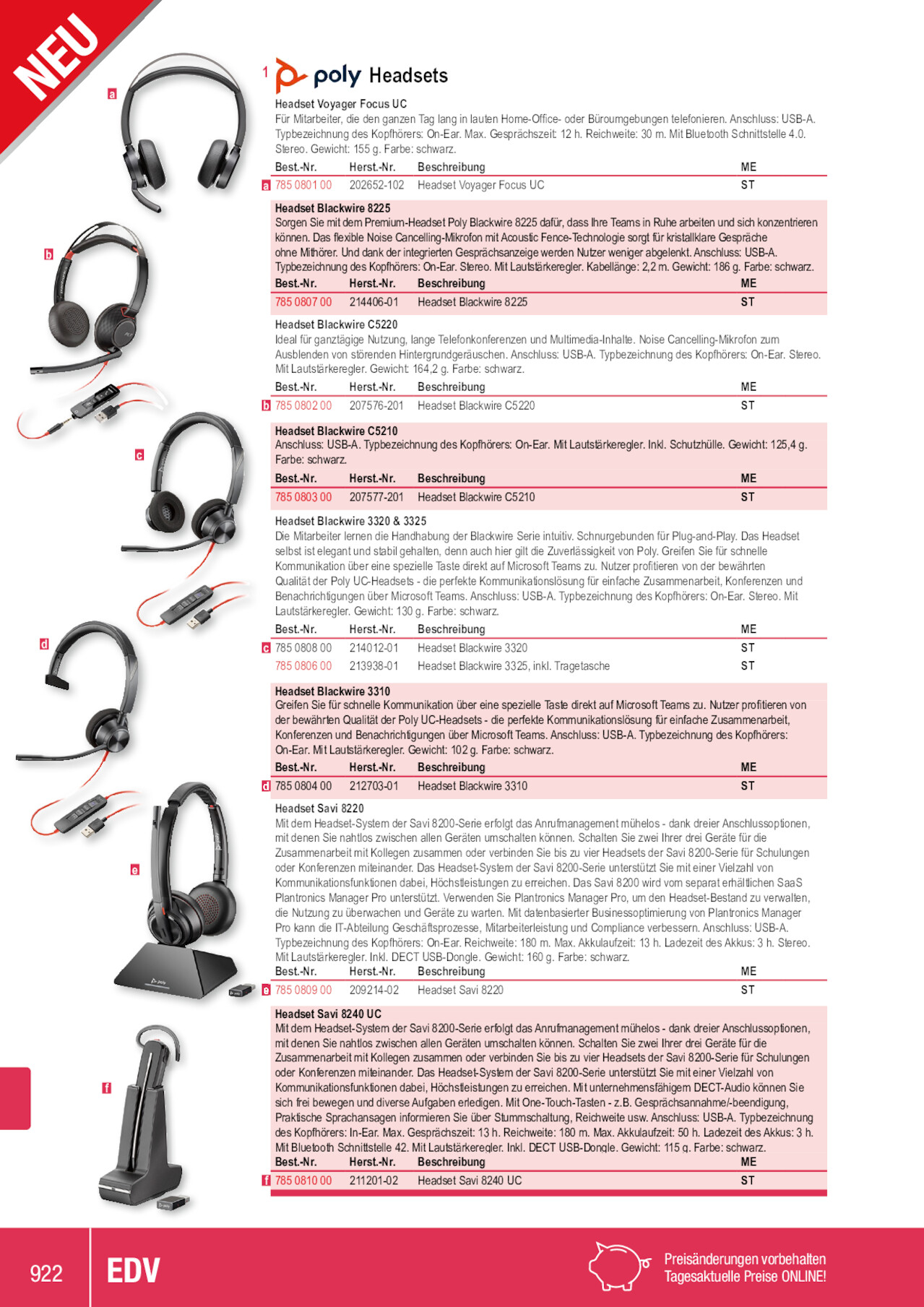 a b c d e f 922 EDV 1 Headsets Headset Voyager Focus UC Für Mitarbeiter, die den ganzen Tag lang in lauten Home-Office- oder Büroumgebungen telefonieren. Anschluss: USB-A. Typbezeichnung des Kopfhörers: On-Ear. Max. Gesprächszeit: 12 h. Reichweite: 30 m. Mit Bluetooth Schnittstelle 4.0. Stereo. Gewicht: 155 g. Farbe: schwarz. Best.-Nr. Herst.-Nr. Beschreibung ME a 785 0801 00 202652-102 Headset Voyager Focus UC ST Headset Blackwire 8225 Sorgen Sie mit dem Premium-Headset Poly Blackwire 8225 dafür, dass Ihre Teams in Ruhe arbeiten und sich konzentrieren können. Das flexible Noise Cancelling-Mikrofon mit Acoustic Fence-Technologie sorgt für kristallklare Gespräche ohne Mithörer. Und dank der integrierten Gesprächsanzeige werden Nutzer weniger abgelenkt. Anschluss: USB-A. Typbezeichnung des Kopfhörers: On-Ear. Stereo. Mit Lautstärkeregler. Kabellänge: 2,2 m. Gewicht: 186 g. Farbe: schwarz. Best.-Nr. Herst.-Nr. Beschreibung ME 785 0807 00 214406-01 Headset Blackwire 8225 ST Headset Blackwire C5220 Ideal für ganztägige Nutzung, lange Telefonkonferenzen und Multimedia-Inhalte. Noise Cancelling-Mikrofon zum Ausblenden von störenden Hintergrundgeräuschen. Anschluss: USB-A. Typbezeichnung des Kopfhörers: On-Ear. Stereo. Mit Lautstärkeregler. Gewicht: 164,2 g. Farbe: schwarz. Best.-Nr. Herst.-Nr. Beschreibung ME b 785 0802 00 207576-201 Headset Blackwire C5220 ST Headset Blackwire C5210 Anschluss: USB-A. Typbezeichnung des Kopfhörers: On-Ear. Mit Lautstärkeregler. Inkl. Schutzhülle. Gewicht: 125,4 g. Farbe: schwarz. Best.-Nr. Herst.-Nr. Beschreibung ME 785 0803 00 207577-201 Headset Blackwire C5210 ST Headset Blackwire 3320 & 3325 Die Mitarbeiter lernen die Handhabung der Blackwire Serie intuitiv. Schnurgebunden für Plug-and-Play. Das Headset selbst ist elegant und stabil gehalten, denn auch hier gilt die Zuverlässigkeit von Poly. Greifen Sie für schnelle Kommunikation über eine spezielle Taste direkt auf Microsoft Teams zu. Nutzer profitieren von der bewährten Qualität der Poly UC-Headsets - die perfekte Kommunikationslösung für einfache Zusammenarbeit, Konferenzen und Benachrichtigungen über Microsoft Teams. Anschluss: USB-A. Typbezeichnung des Kopfhörers: On-Ear. Stereo. Mit Lautstärkeregler. Gewicht: 130 g. Farbe: schwarz. Best.-Nr. Herst.-Nr. Beschreibung ME c 785 0808 00 214012-01 Headset Blackwire 3320 ST 785 0806 00 213938-01 Headset Blackwire 3325, inkl. Tragetasche ST Headset Blackwire 3310 Greifen Sie für schnelle Kommunikation über eine spezielle Taste direkt auf Microsoft Teams zu. Nutzer profitieren von der bewährten Qualität der Poly UC-Headsets - die perfekte Kommunikationslösung für einfache Zusammenarbeit, Konferenzen und Benachrichtigungen über Microsoft Teams. Anschluss: USB-A. Typbezeichnung des Kopfhörers: On-Ear. Mit Lautstärkeregler. Gewicht: 102 g. Farbe: schwarz. Best.-Nr. Herst.-Nr. Beschreibung ME d 785 0804 00 212703-01 Headset Blackwire 3310 ST Headset Savi 8220 Mit dem Headset-System der Savi 8200-Serie erfolgt das Anrufmanagement mühelos - dank dreier Anschlussoptionen, mit denen Sie nahtlos zwischen allen Geräten umschalten können. Schalten Sie zwei Ihrer drei Geräte für die Zusammenarbeit mit Kollegen zusammen oder verbinden Sie bis zu vier Headsets der Savi 8200-Serie für Schulungen oder Konferenzen miteinander. Das Headset-System der Savi 8200-Serie unterstützt Sie mit einer Vielzahl von Kommunikationsfunktionen dabei, Höchstleistungen zu erreichen. Das Savi 8200 wird vom separat erhältlichen SaaS Plantronics Manager Pro unterstützt. Verwenden Sie Plantronics Manager Pro, um den Headset-Bestand zu verwalten, die Nutzung zu überwachen und Geräte zu warten. Mit datenbasierter Businessoptimierung von Plantronics Manager Pro kann die IT-Abteilung Geschäftsprozesse, Mitarbeiterleistung und Compliance verbessern. Anschluss: USB-A. Typbezeichnung des Kopfhörers: On-Ear. Reichweite: 180 m. Max. Akkulaufzeit: 13 h. Ladezeit des Akkus: 3 h. Stereo. Mit Lautstärkeregler. Inkl. DECT USB-Dongle. Gewicht: 160 g. Farbe: schwarz. Best.-Nr. Herst.-Nr. Beschreibung ME e 785 0809 00 209214-02 Headset Savi 8220 ST Headset Savi 8240 UC Mit dem Headset-System der Savi 8200-Serie erfolgt das Anrufmanagement mühelos - dank dreier Anschlussoptionen, mit denen Sie nahtlos zwischen allen Geräten umschalten können. Schalten Sie zwei Ihrer drei Geräte für die Zusammenarbeit mit Kollegen zusammen oder verbinden Sie bis zu vier Headsets der Savi 8200-Serie für Schulungen oder Konferenzen miteinander. Das Headset-System der Savi 8200-Serie unterstützt Sie mit einer Vielzahl von Kommunikationsfunktionen dabei, Höchstleistungen zu erreichen. Mit unternehmensfähigem DECT-Audio können Sie sich frei bewegen und diverse Aufgaben erledigen. Mit One-Touch-Tasten - z.B. Gesprächsannahme/-beendigung, Praktische Sprachansagen informieren Sie über Stummschaltung, Reichweite usw. Anschluss: USB-A. Typbezeichnung des Kopfhörers: In-Ear. Max. Gesprächszeit: 13 h. Reichweite: 180 m. Max. Akkulaufzeit: 50 h. Ladezeit des Akkus: 3 h. Mit Bluetooth Schnittstelle 42. Mit Lautstärkeregler. Inkl. DECT USB-Dongle. Gewicht: 115 g. Farbe: schwarz. Best.-Nr. Herst.-Nr. Beschreibung ME f 785 0810 00 211201-02 Headset Savi 8240 UC ST Preisänderungen vorbehalten Tagesaktuelle Preise ONLINE!