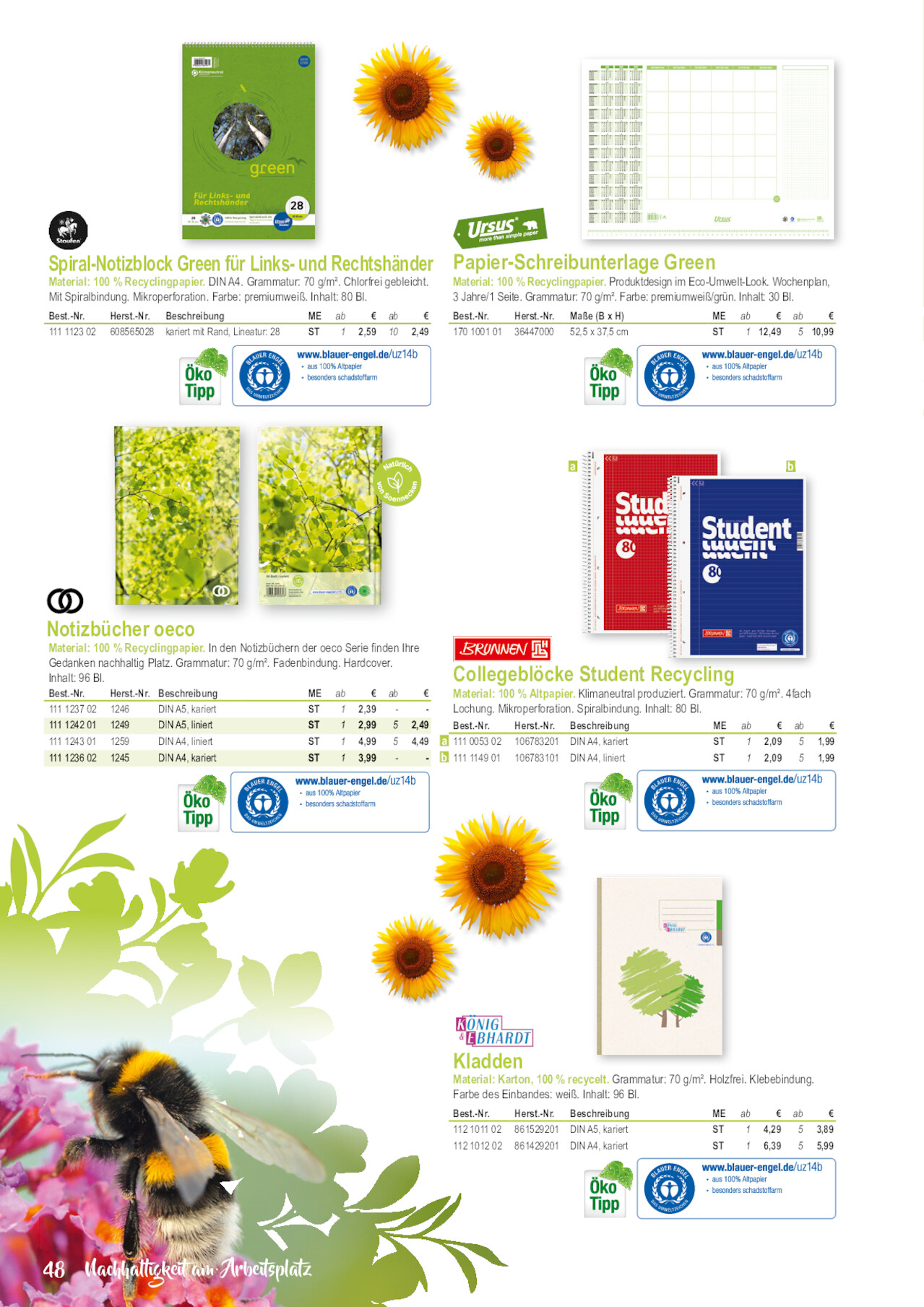 Spiral-Notizblock Green für Links- und Rechtshänder Material: 100 % Recyclingpapier. DIN A4. Grammatur: 70 g/m². Chlorfrei gebleicht. Mit Spiralbindung. Mikroperforation. Farbe: premiumweiß. Inhalt: 80 Bl. Best.-Nr. Herst.-Nr. Beschreibung 111 1123 02 608565028 kariert mit Rand, Lineatur: 28 ME ab € ab € ST 1 2,59 10 2,49 Papier-Schreibunterlage Green Material: 100 % Recyclingpapier. Produktdesign im Eco-Umwelt-Look. Wochenplan, 3 Jahre/1 Seite. Grammatur: 70 g/m². Farbe: premiumweiß/grün. Inhalt: 30 Bl. Best.-Nr. Herst.-Nr. Maße (B x H) 170 1001 01 36447000 52,5 x 37,5 cm ME ab € ab € ST 1 12,49 5 10,99 ab Notizbücher oeco Material: 100 % Recyclingpapier. In den Notizbüchern der oeco Serie finden Ihre Gedanken nachhaltig Platz. Grammatur: 70 g/m². Fadenbindung. Hardcover. Inhalt: 96 Bl. Best.-Nr. Herst.-Nr. Beschreibung ME ab € ab € 111 1237 02 1246 DIN A5, kariert ST 1 2,39 - - 111 1242 01 1249 DIN A5, liniert ST 1 2,99 5 2,49 111 1243 01 1259 DIN A4, liniert ST 1 4,99 5 4,49 111 1236 02 1245 DIN A4, kariert ST 1 3,99 - - Collegeblöcke Student Recycling Material: 100 % Altpapier. Klimaneutral produziert. Grammatur: 70 g/m². 4fach Lochung. Mikroperforation. Spiralbindung. Inhalt: 80 Bl. Best.-Nr. Herst.-Nr. Beschreibung ME ab € ab € a 111 0053 02 106783201 DIN A4, kariert ST 1 2,09 5 1,99 b 111 1149 01 106783101 DIN A4, liniert ST 1 2,09 5 1,99 48 Nachhaltigkeit am Arbeitsplatz Kladden Material: Karton, 100 % recycelt. Grammatur: 70 g/m². Holzfrei. Klebebindung. Farbe des Einbandes: weiß. Inhalt: 96 Bl. Best.-Nr. Herst.-Nr. Beschreibung 112 1011 02 861529201 DIN A5, kariert ME ab € ab € ST 1 4,29 5 3,89 112 1012 02 861429201 DIN A4, kariert ST 1 6,39 5 5,99
