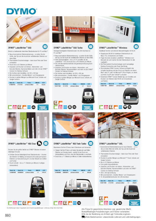 DYMO® LabelWriter™ 550 Einfach zu bedienender tintenfreier Etikettendrucker für PC und Mac® • Neue Automatische Etikettenerkennung – so sehen Sie die Größe, den Typ und die Anzahl der verbleibenden Etiketten auf einen Blick • Thermodirekt-Drucktechnologie – keine teure Tinte oder Toner erforderlich • Druckt bis zu 62 Etiketten pro Minute • Anpassen und Drucken von Adress-, Aktenordner- und Barcode-Etiketten, Namensschildern und mehr mit der DYMO® Connect for Desktop-Software • Die Grafiken sind kristallklar, mit 300 x 300 dpi • Mit automatischem „Standby-Modus“ zum Energiesparen • Drucken in großen Mengen aus Microsoft Excel, Outlook und Google Contacts Best.-Nr. Herst.-Nr. Farbe MM/VE €/ST 124380700 2112722 schwarz/silber 1/1 139,90 DYMO® LabelWriter™ 550 Turbo Hochgeschwindigkeits-Etikettendrucker mit LAN-Anschluss für PC und Mac® • Neue Automatische Etikettenerkennung – so sehen Sie die Größe, den Typ und die Anzahl der verbleibenden Etiketten auf einen Blick • Hohe Geschwindigkeit – bis zu 45 % schneller als der LabelWriter™ 550 und druckt bis zu 90 Etiketten pro Minute • Die LAN-Netzwerkkonnektivität die gemeinsame Nutzung durch mehrere Nutzer • Anpassen und Drucken von Adress-, Aktenordner- und Barcode-Etiketten, Namensschildern und mehr mit der DYMO® Connect for Desktop-Software • Die Grafiken sind kristallklar, mit 300 x 300 dpi • Mit automatischem „Standby-Modus“ zum Energiesparen • Drucken in großen Mengen aus Microsoft Excel, Outlook und Google Contacts Best.-Nr. Herst.-Nr. Farbe MM/VE €/ST 133017400 2112723 schwarz/silber 1/1 199,90 DYMO® LabelWriter™ Wireless Kabelloser Komfort und einfache Netzwerkfreigabe mit WLAN • Eingebautes WLAN für kabellosen Etikettendruck von Macs, PCs, Smartphones und Tablets • Fügen Sie einen einzelnen LabelWriter™ Wireless in ein Netzwerk ein und machen Sie den Etikettendruck für alle zugänglich • Die Thermodirekt-Drucktechnologie macht kostspielige Desktop-Druckertinte oder Toner überflüssig • Die kostenlose DYMO Connect Software ermöglicht die schnelle Gestaltung und den Druck von Etiketten von einem Mac® oder PC, oder mit Microsoft® Office-Plugins, um direkt aus Word, Excel® oder Outlook® zu drucken • Kostenlose DYMO® Connect Mobile App zum Erstellen und Drucken von Etiketten über WLAN von Smartphones und Tablets Best.-Nr. Herst.-Nr. Farbe MM/VE €/ST 133007190 2000931 schwarz/silber 1/1 179,90 FUNKTIONIERT NUR MIT ORIGINAL ETIKETTEN FONCTIONNE UNIQUEMENT AVEC DES FUNKTIONIERT NUR MIT ORIGINAL ETIKETTEN FONCTIONNE UNIQUEMENT AVEC DES DYMO® LabelWriter™ 450 Duo Drucken Sie die größte Vielfalt von DYMO® Etiketten mit einem vielseitigen Drucker • Erhöhen Sie die Vielseitigkeit Ihres Etikettendrucks – drucken Sie Etiketten für Mailing und Versand (LW) sowie permanente Etiketten zur Kennzeichnung (D1) in einer Vielzahl von Größen und Farben • Druckt schnell – bis zu 71 Etiketten pro Minute (4-zeiliges Adressetikett). Best.-Nr. Herst.-Nr. Farbe MM/VE €/ST 124380490 S0838920 schwarz/silber 1/1 256,00 DYMO® LabelWriter™ 450 Twin Turbo Maximieren Sie Ihre Effizienz beim Etikettieren und Versenden • Steigern Sie Ihre Effizienz und haben Sie jederzeit zwei Rollen Etiketten zum Drucken bereit – perfekt für den Druck von Adressetiketten und Porto, ohne die Etikettenrollen zu wechseln • Druckt bis zu 71 Etiketten pro Minute (4-Zeilen-Adressetiketten) Best.-Nr. Herst.-Nr. Farbe MM/VE €/ST 124380690 S0838870 schwarz/silber 1/1 264,00 DYMO® LabelWriter™ 5XL • Automatische Etikettenerkennung für neue Etiketten – sehen Sie auf einen Blick die Größe, den Typ und die Anzahl der verbleibenden Etiketten • Thermodirekt-Drucktechnologie – keine teure Tinte oder Toner erforderlich • Drucken in großen Mengen aus Microsoft™ Excel, Outlook und Google Contacts • Bis zu 53 Etiketten pro Minute • Extra große Versandetiketten • Anpassen und Drucken von Adress-, Aktenordner- und Barcode-Etiketten, Namensschildern und mehr mit DYMO® Connect for Desktop Software • 300 x 300 dpi Auflösung • Mit automatischem „Standby-Modus“ zum Energiesparen • XL-Versandetikettendrucker mit LAN-Anschluss Best.-Nr. Herst.-Nr. Farbe MM/VE €/ST 133017300 2112725 schwarz/silber 1/1 259,00 Die Abbildungen dieser Doppelseite sind Anwendungsabbildungen. Lieferung erfolgt ohne Inhalt/Deko. 860 Bürotechnik FUNKTIONIERT NUR MIT ORIGINAL ETIKETTEN FONCTIONNE UNIQUEMENT AVEC DES Alle Preise für gewerbliche Abnehmer zzgl. gesetzlicher MwSt. RBiothtestbRoefofitbedeeBdrienBsgetteseltlenPlurluemnismgäenvrod:nearAbuwrntgiekeiecnlhnuenngddgPTefIa.rreLrFgtiaieüesrmfsäbeacnerzkordedtveiuetorseruublnenleedrghgLaPeälinrneteezfenevisnr.obe.rebOdeiNnhgLauIlNntegEne!n.