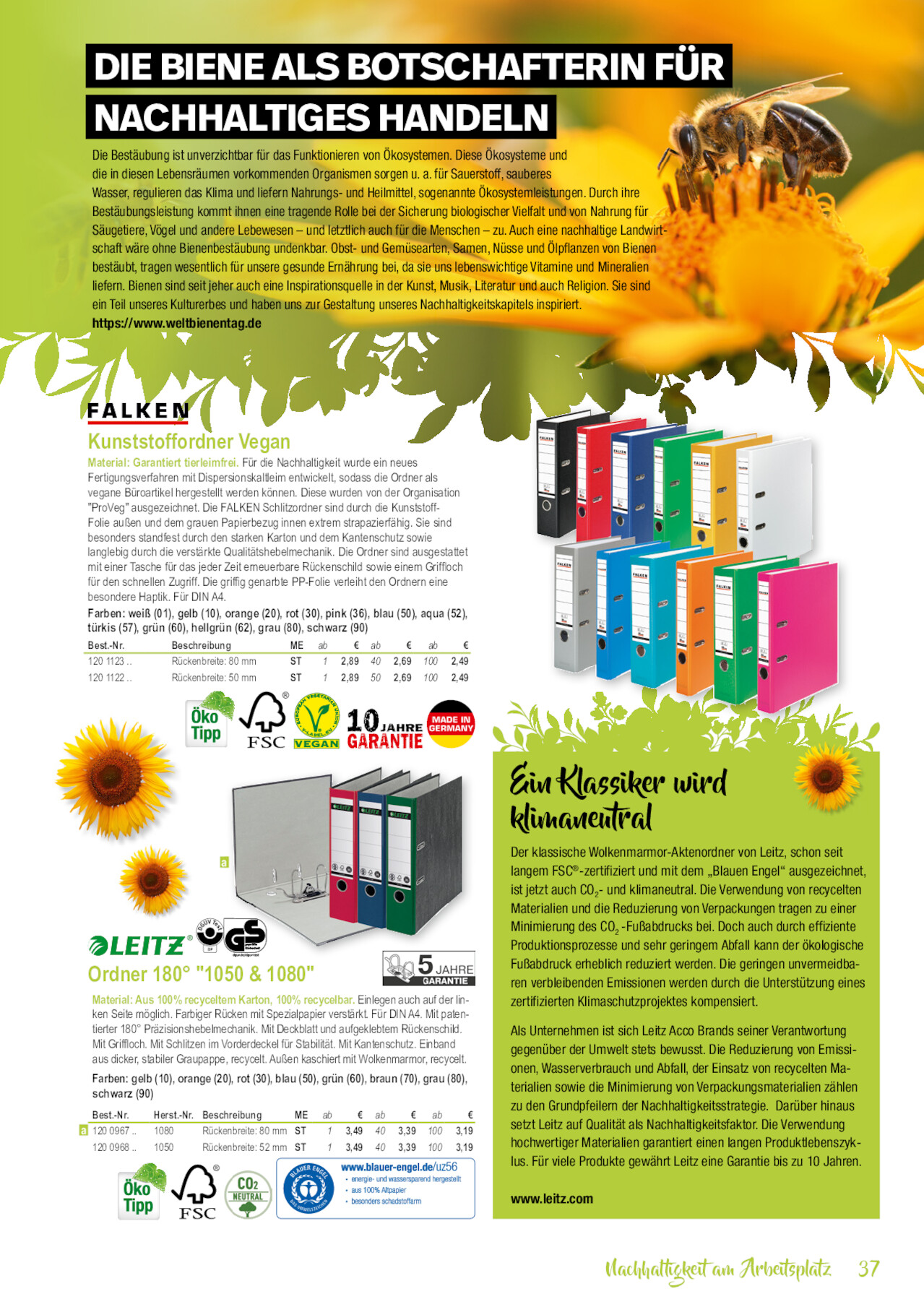 DIE BIENE ALS BOTSCHAFTERIN FÜR NACHHALTIGES HANDELN Die Bestäubung ist unverzichtbar für das Funktionieren von Ökosystemen. Diese Ökosysteme und die in diesen Lebensräumen vorkommenden Organismen sorgen u. a. für Sauerstoff, sauberes Wasser, regulieren das Klima und liefern Nahrungs- und Heilmittel, sogenannte Ökosystemleistungen. Durch ihre Bestäubungsleistung kommt ihnen eine tragende Rolle bei der Sicherung biologischer Vielfalt und von Nahrung für Säugetiere, Vögel und andere Lebewesen – und letztlich auch für die Menschen – zu. Auch eine nachhaltige Landwirtschaft wäre ohne Bienenbestäubung undenkbar. Obst- und Gemüsearten, Samen, Nüsse und Ölp anzen von Bienen bestäubt, tragen wesentlich für unsere gesunde Ernährung bei, da sie uns lebenswichtige Vitamine und Mineralien liefern. Bienen sind seit jeher auch eine Inspirationsquelle in der Kunst, Musik, Literatur und auch Religion. Sie sind ein Teil unseres Kulturerbes und haben uns zur Gestaltung unseres Nachhaltigkeitskapitels inspiriert. https://www.weltbienentag.de Kunststoffordner Vegan Material: Garantiert tierleimfrei. Für die Nachhaltigkeit wurde ein neues Fertigungsverfahren mit Dispersionskaltleim entwickelt, sodass die Ordner als vegane Büroartikel hergestellt werden können. Diese wurden von der Organisation "ProVeg" ausgezeichnet. Die FALKEN Schlitzordner sind durch die KunststoffFolie außen und dem grauen Papierbezug innen extrem strapazierfähig. Sie sind besonders standfest durch den starken Karton und dem Kantenschutz sowie langlebig durch die verstärkte Qualitätshebelmechanik. Die Ordner sind ausgestattet mit einer Tasche für das jeder Zeit erneuerbare Rückenschild sowie einem Griffloch für den schnellen Zugriff. Die griffig genarbte PP-Folie verleiht den Ordnern eine besondere Haptik. Für DIN A4. Farben: weiß (01), gelb (10), orange (20), rot (30), pink (36), blau (50), aqua (52), türkis (57), grün (60), hellgrün (62), grau (80), schwarz (90) Best.-Nr. Beschreibung ME ab € ab € ab € 120 1123 .. Rückenbreite: 80 mm ST 1 2,89 40 2,69 100 2,49 120 1122 .. Rückenbreite: 50 mm ST 1 2,89 50 2,69 100 2,49 a Ordner 180° "1050 & 1080" Material: Aus 100% recyceltem Karton, 100% recycelbar. Einlegen auch auf der linken Seite möglich. Farbiger Rücken mit Spezialpapier verstärkt. Für DIN A4. Mit patentierter 180° Präzisionshebelmechanik. Mit Deckblatt und aufgeklebtem Rückenschild. Mit Griffloch. Mit Schlitzen im Vorderdeckel für Stabilität. Mit Kantenschutz. Einband aus dicker, stabiler Graupappe, recycelt. Außen kaschiert mit Wolkenmarmor, recycelt. Farben: gelb (10), orange (20), rot (30), blau (50), grün (60), braun (70), grau (80), schwarz (90) Best.-Nr. a 120 0967 .. 120 0968 .. Herst.-Nr. Beschreibung ME ab € ab € ab € 1080 Rückenbreite: 80 mm ST 1 3,49 40 3,39 100 3,19 1050 Rückenbreite: 52 mm ST 1 3,49 40 3,39 100 3,19 Ein Klassiker wird klimaneutral Der klassische Wolkenmarmor-Aktenordner von Leitz, schon seit langem FSC®-zerti ziert und mit dem „Blauen Engel“ ausgezeichnet, ist jetzt auch CO2- und klimaneutral. Die Verwendung von recycelten Materialien und die Reduzierung von Verpackungen tragen zu einer Minimierung des CO2 -Fußabdrucks bei. Doch auch durch ef ziente Produktionsprozesse und sehr geringem Abfall kann der ökologische Fußabdruck erheblich reduziert werden. Die geringen unvermeidbaren verbleibenden Emissionen werden durch die Unterstützung eines zerti zierten Klimaschutzprojektes kompensiert. Als Unternehmen ist sich Leitz Acco Brands seiner Verantwortung gegenüber der Umwelt stets bewusst. Die Reduzierung von Emissionen, Wasserverbrauch und Abfall, der Einsatz von recycelten Materialien sowie die Minimierung von Verpackungsmaterialien zählen zu den Grundpfeilern der Nachhaltigkeitsstrategie. Darüber hinaus setzt Leitz auf Qualität als Nachhaltigkeitsfaktor. Die Verwendung hochwertiger Materialien garantiert einen langen Produktlebenszyklus. Für viele Produkte gewährt Leitz eine Garantie bis zu 10 Jahren. www.leitz.com Nachhaltigkeit am Arbeitsplatz 37 120112220 120112257 120112362 120096770 120112310 120112230 120112236 120112290 120096750 120096830 120112280 120112330 120096860 120112390 120096810 120096730 120112252 120096850 120096820 120112360 120112320 120112262 120096880 120096890 120112380 120112301 120112250 120112357 120096870 120112260 120096790 120112210 120096720 120096780 120096760 120112201 120112336 120096710 120112352 120112350