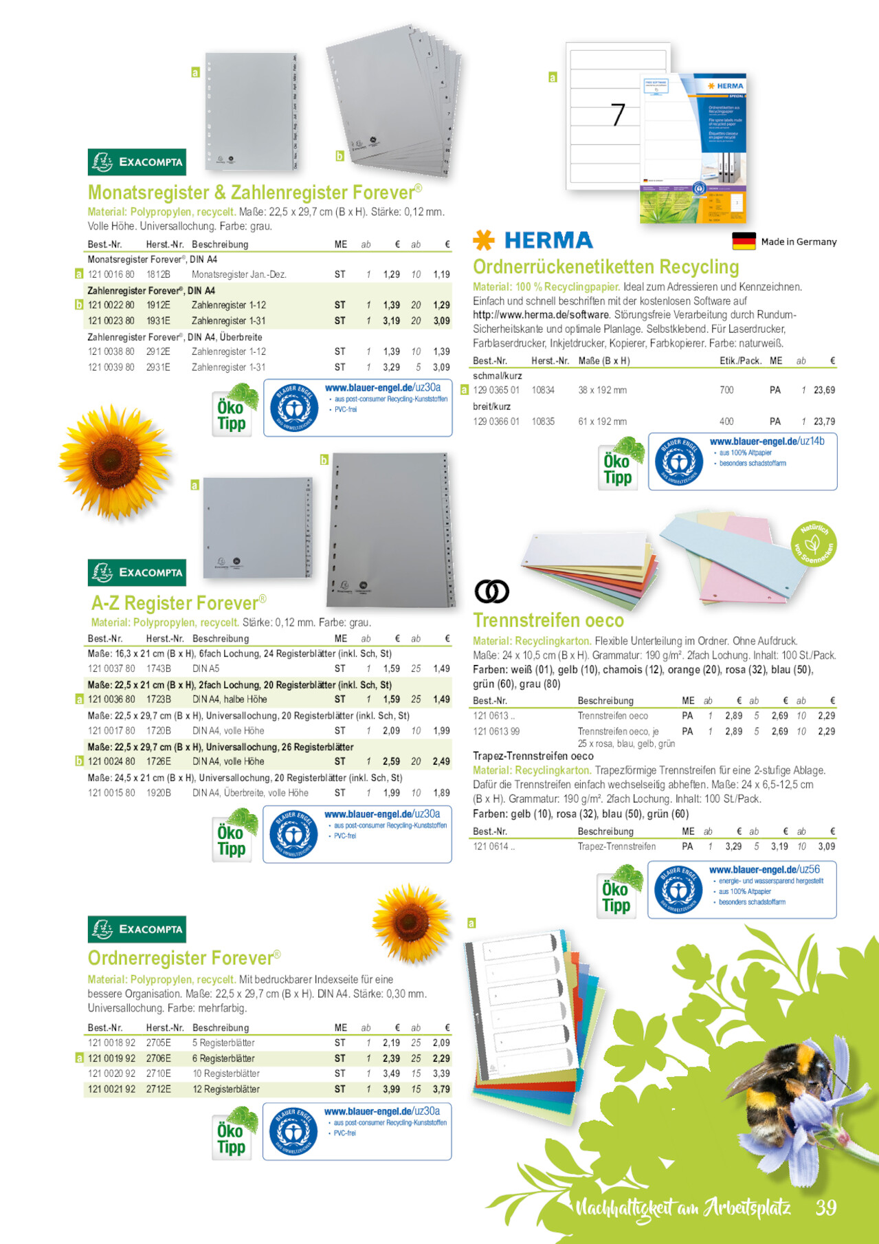 aa b Monatsregister & Zahlenregister Forever® Material: Polypropylen, recycelt. Maße: 22,5 x 29,7 cm (B x H). Stärke: 0,12 mm. Volle Höhe. Universallochung. Farbe: grau. Best.-Nr. Herst.-Nr. Beschreibung Monatsregister Forever®, DIN A4 a 121 0016 80 1812B Monatsregister Jan.-Dez. ME ab € ab € ST 1 1,29 10 1,19 Zahlenregister Forever®, DIN A4 b 121 0022 80 1912E Zahlenregister 1-12 121 0023 80 1931E Zahlenregister 1-31 ST 1 1,39 20 1,29 ST 1 3,19 20 3,09 Zahlenregister Forever®, DIN A4, Überbreite 121 0038 80 2912E Zahlenregister 1-12 121 0039 80 2931E Zahlenregister 1-31 ST 1 1,39 10 1,39 ST 1 3,29 5 3,09 Ordnerrückenetiketten Recycling Material: 100 % Recyclingpapier. Ideal zum Adressieren und Kennzeichnen. Einfach und schnell beschriften mit der kostenlosen Software auf http://www.herma.de/software. Störungsfreie Verarbeitung durch RundumSicherheitskante und optimale Planlage. Selbstklebend. Für Laserdrucker, Farblaserdrucker, Inkjetdrucker, Kopierer, Farbkopierer. Farbe: naturweiß. Best.-Nr. Herst.-Nr. Maße (B x H) Etik./Pack. ME ab € schmal/kurz a 129 0365 01 10834 38 x 192 mm 700 PA 1 23,69 breit/kurz 129 0366 01 10835 61 x 192 mm 400 PA 1 23,79 b a A-Z Register Forever® Material: Polypropylen, recycelt. Stärke: 0,12 mm. Farbe: grau. Best.-Nr. Herst.-Nr. Beschreibung ME ab € ab Maße: 16,3 x 21 cm (B x H), 6fach Lochung, 24 Registerblätter (inkl. Sch, St) 121 0037 80 1743B DIN A5 ST 1 1,59 25 Maße: 22,5 x 21 cm (B x H), 2fach Lochung, 20 Registerblätter (inkl. Sch, St) a 121 0036 80 1723B DIN A4, halbe Höhe ST 1 1,59 25 Maße: 22,5 x 29,7 cm (B x H), Universallochung, 20 Registerblätter (inkl. Sch, St) 121 0017 80 1720B DIN A4, volle Höhe ST 1 2,09 10 Maße: 22,5 x 29,7 cm (B x H), Universallochung, 26 Registerblätter b 121 0024 80 1726E DIN A4, volle Höhe ST 1 2,59 20 Maße: 24,5 x 21 cm (B x H), Universallochung, 20 Registerblätter (inkl. Sch, St) 121 0015 80 1920B DIN A4, Überbreite, volle Höhe ST 1 1,99 10 € 1,49 1,49 1,99 2,49 1,89 Trennstreifen oeco Material: Recyclingkarton. Flexible Unterteilung im Ordner. Ohne Aufdruck. Maße: 24 x 10,5 cm (B x H). Grammatur: 190 g/m². 2fach Lochung. Inhalt: 100 St./Pack. Farben: weiß (01), gelb (10), chamois (12), orange (20), rosa (32), blau (50), grün (60), grau (80) Best.-Nr. 121 0613 .. Beschreibung Trennstreifen oeco ME ab € ab € ab € PA 1 2,89 5 2,69 10 2,29 121 0613 99 Trennstreifen oeco, je PA 1 2,89 5 2,69 10 2,29 25 x rosa, blau, gelb, grün Trapez-Trennstreifen oeco Material: Recyclingkarton. Trapezförmige Trennstreifen für eine 2-stufige Ablage. Dafür die Trennstreifen einfach wechselseitig abheften. Maße: 24 x 6,5-12,5 cm (B x H). Grammatur: 190 g/m². 2fach Lochung. Inhalt: 100 St./Pack. Farben: gelb (10), rosa (32), blau (50), grün (60) Best.-Nr. 121 0614 .. Beschreibung Trapez-Trennstreifen ME ab € ab € ab € PA 1 3,29 5 3,19 10 3,09 a Ordnerregister Forever® Material: Polypropylen, recycelt. Mit bedruckbarer Indexseite für eine bessere Organisation. Maße: 22,5 x 29,7 cm (B x H). DIN A4. Stärke: 0,30 mm. Universallochung. Farbe: mehrfarbig. Best.-Nr. 121 0018 92 a 121 0019 92 121 0020 92 121 0021 92 Herst.-Nr. Beschreibung 2705E 5 Registerblätter 2706E 6 Registerblätter 2710E 10 Registerblätter 2712E 12 Registerblätter ME ab € ab € ST 1 2,19 25 2,09 ST 1 2,39 25 2,29 ST 1 3,49 15 3,39 ST 1 3,99 15 3,79 Nachhaltigkeit am Arbeitsplatz 39 121001992 121061301 121061380 121061450 121001892 121002380 121061410 121001580 121002092 121001680 121002480 121061320 129036601 121061460 121002192 121003780 121002280 121061350 129036501 121061360 121061332 121003680 121003980 121061312 121001780 121061399 121061310 121061432 121003880