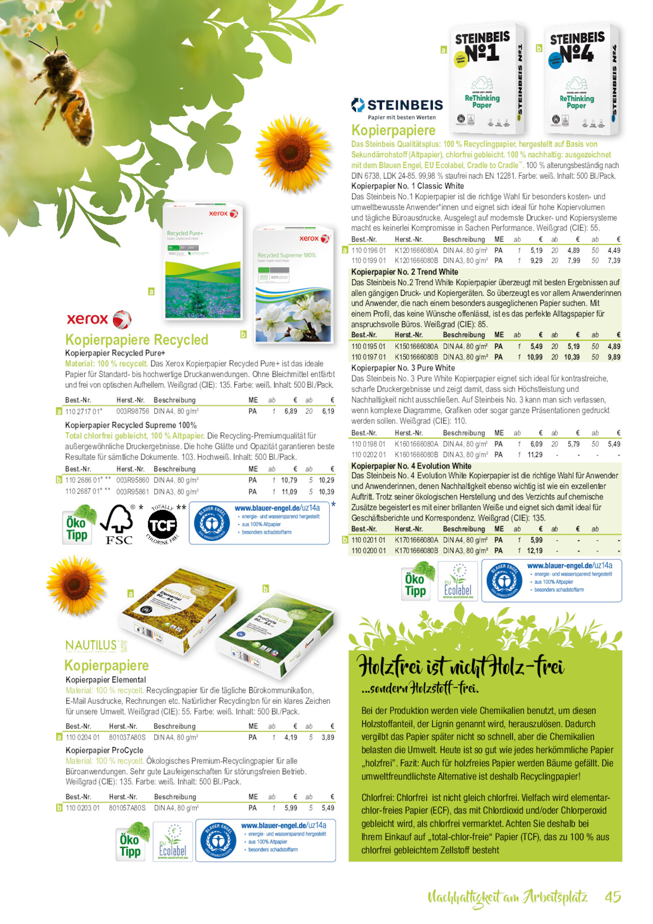 ab Kopierpapiere Das Steinbeis Qualitätsplus: 100 % Recyclingpapier, hergestellt auf Basis von Sekundärrohstoff (Altpapier), chlorfrei gebleicht. 100 % nachhaltig: ausgezeichnet mit dem Blauen Engel, EU Ecolabel, Cradle to Cradle™. 100 % alterungsbeständig nach DIN 6738, LDK 24-85. 99,98 % staufrei nach EN 12281. Farbe: weiß. Inhalt: 500 Bl./Pack. Kopierpapier No. 1 Classic White Das Steinbeis No.1 Kopierpapier ist die richtige Wahl für besonders kosten- und umweltbewusste Anwender*innen und eignet sich ideal für hohe Kopiervolumen und tägliche Büroausdrucke. Ausgelegt auf modernste Drucker- und Kopiersysteme macht es keinerlei Kompromisse in Sachen Performance. Weißgrad (CIE): 55. Best.-Nr. Herst.-Nr. Beschreibung ME ab € ab € ab € a 110 0196 01 K1201666080A DIN A4, 80 g/m² PA 1 5,19 20 4,89 50 4,49 110 0199 01 K1201666080B DIN A3, 80 g/m² PA 1 9,29 20 7,99 50 7,39 Kopierpapier No. 2 Trend White Das Steinbeis No.2 Trend White Kopierpapier überzeugt mit besten Ergebnissen auf a allen gängigen Druck- und Kopiergeräten. So überzeugt es vor allem Anwenderinnen und Anwender, die nach einem besonders ausgeglichenen Papier suchen. Mit einem Profil, das keine Wünsche offenlässt, ist es das perfekte Alltagspapier für Kopierpapiere Recycled b Kopierpapier Recycled Pure+ Material: 100 % recycelt. Das Xerox Kopierpapier Recycled Pure+ ist das ideale Papier für Standard- bis hochwertige Druckanwendungen. Ohne Bleichmittel entfärbt und frei von optischen Aufhellern. Weißgrad (CIE): 135. Farbe: weiß. Inhalt: 500 Bl./Pack. anspruchsvolle Büros. Weißgrad (CIE): 85. Best.-Nr. Herst.-Nr. Beschreibung ME ab € ab € ab € 110 0195 01 K1501666080A DIN A4, 80 g/m² PA 1 5,49 20 5,19 50 4,89 110 0197 01 K1501666080B DIN A3, 80 g/m² PA 1 10,99 20 10,39 50 9,89 Kopierpapier No. 3 Pure White Das Steinbeis No. 3 Pure White Kopierpapier eignet sich ideal für kontrastreiche, scharfe Druckergebnisse und zeigt damit, dass sich Höchstleistung und Best.-Nr. a 110 2717 01* Herst.-Nr. Beschreibung 003R98756 DIN A4, 80 g/m² ME ab € ab € PA 1 6,89 20 6,19 Kopierpapier Recycled Supreme 100% Total chlorfrei gebleicht, 100 % Altpapier. Die Recycling-Premiumqualität für außergewöhnliche Druckergebnisse. Die hohe Glätte und Opazität garantieren beste Resultate für sämtliche Dokumente. 103. Hochweiß. Inhalt: 500 Bl./Pack. Best.-Nr. Herst.-Nr. Beschreibung b 110 2686 01* ** 003R95860 DIN A4, 80 g/m² 110 2687 01* ** 003R95861 DIN A3, 80 g/m² ME ab € ab € PA 1 10,79 5 10,29 PA 1 11,09 5 10,39 * ** * Nachhaltigkeit nicht ausschließen. Auf Steinbeis No. 3 kann man sich verlassen, wenn komplexe Diagramme, Grafiken oder sogar ganze Präsentationen gedruckt werden sollen. Weißgrad (CIE): 110. Best.-Nr. Herst.-Nr. Beschreibung ME ab € ab € ab € 110 0198 01 K1601666080A DIN A4, 80 g/m² PA 1 6,09 20 5,79 50 5,49 110 0202 01 K1601666080B DIN A3, 80 g/m² PA 1 11,29 - -- - Kopierpapier No. 4 Evolution White Das Steinbeis No. 4 Evolution White Kopierpapier ist die richtige Wahl für Anwender und Anwenderinnen, denen Nachhaltigkeit ebenso wichtig ist wie ein exzellenter Auftritt. Trotz seiner ökologischen Herstellung und des Verzichts auf chemische Zusätze begeistert es mit einer brillanten Weiße und eignet sich damit ideal für Geschäftsberichte und Korrespondenz. Weißgrad (CIE): 135. Best.-Nr. Herst.-Nr. Beschreibung ME ab € ab € ab b 110 0201 01 K1701666080A DIN A4, 80 g/m² PA 1 5,99 - -- - 110 0200 01 K1701666080B DIN A3, 80 g/m² PA 1 12,19 - -- - ab Kopierpapiere Kopierpapier Elemental Material: 100 % recycelt. Recyclingpapier für die tägliche Bürokommunikation, E-Mail Ausdrucke, Rechnungen etc. Natürlicher Recyclington für ein klares Zeichen für unsere Umwelt. Weißgrad (CIE): 55. Farbe: weiß. Inhalt: 500 Bl./Pack. Best.-Nr. Herst.-Nr. Beschreibung a 110 0204 01 801037A80S DIN A4, 80 g/m² ME ab € ab PA 1 4,19 5 Kopierpapier ProCycle Material: 100 % recycelt. Ökologisches Premium-Recyclingpapier für alle Büroanwendungen. Sehr gute Laufeigenschaften für störungsfreien Betrieb. Weißgrad (CIE): 135. Farbe: weiß. Inhalt: 500 Bl./Pack. € 3,89 Best.-Nr. Herst.-Nr. Beschreibung b 110 0203 01 801057A80S DIN A4, 80 g/m² ME ab € ab € PA 1 5,99 5 5,49 Holzfrei ist nicht Holz-frei ...sondern Holzstoff-frei. Bei der Produktion werden viele Chemikalien benutzt, um diesen Holzstoffanteil, der Lignin genannt wird, herauszulösen. Dadurch vergilbt das Papier später nicht so schnell, aber die Chemikalien belasten die Umwelt. Heute ist so gut wie jedes herkömmliche Papier „holzfrei”. Fazit: Auch für holzfreies Papier werden Bäume gefällt. Die umweltfreundlichste Alternative ist deshalb Recyclingpapier! Chlorfrei: Chlorfrei ist nicht gleich chlorfrei. Vielfach wird elementarchlor-freies Papier (ECF), das mit Chlordioxid und/oder Chlorperoxid gebleicht wird, als chlorfrei vermarktet. Achten Sie deshalb bei Ihrem Einkauf auf „total-chlor-freie“ Papier (TCF), das zu 100 % aus chlorfrei gebleichtem Zellstoff besteht Nachhaltigkeit am Arbeitsplatz 45 110019501 110019601 110019701 110268701 110019801 110019901 110020301 110020001 110268601 110020101 110020401 110271701 110020201