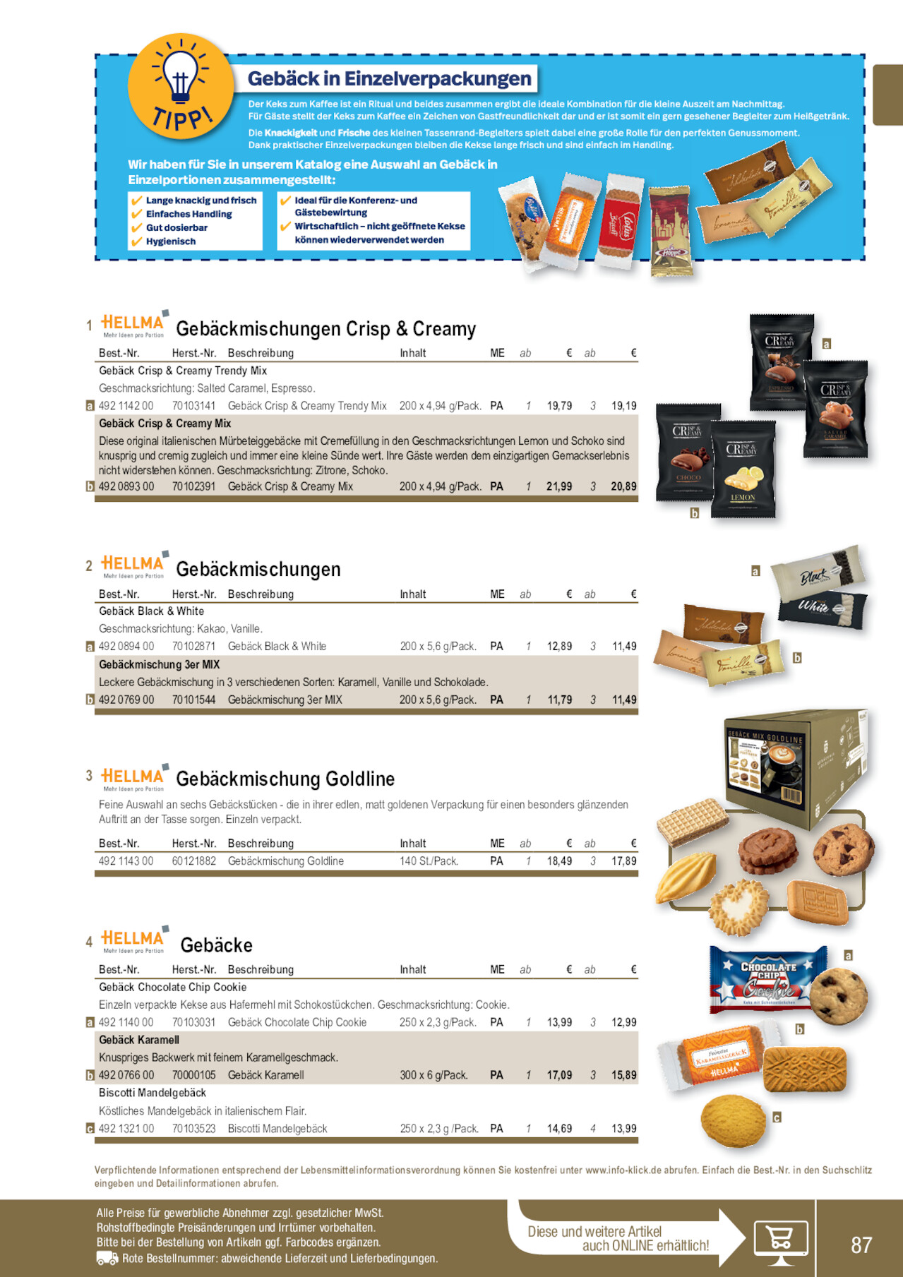 Wir haben für Sie in unserem Katalog eine Auswahl an Gebäck in Einzelportionen zusammengestellt: ✔✔ ✔ ✔✔ ✔ 1 Gebäckmischungen Crisp & Creamy Best.-Nr. Herst.-Nr. Beschreibung Inhalt ME ab € ab € Gebäck Crisp & Creamy Trendy Mix Geschmacksrichtung: Salted Caramel, Espresso. a 492 1142 00 70103141 Gebäck Crisp & Creamy Trendy Mix 200 x 4,94 g/Pack. PA 1 19,79 3 19,19 Gebäck Crisp & Creamy Mix Diese original italienischen Mürbeteiggebäcke mit Cremefüllung in den Geschmacksrichtungen Lemon und Schoko sind knusprig und cremig zugleich und immer eine kleine Sünde wert. Ihre Gäste werden dem einzigartigen Gemackserlebnis nicht widerstehen können. Geschmacksrichtung: Zitrone, Schoko. b 492 0893 00 70102391 Gebäck Crisp & Creamy Mix 200 x 4,94 g/Pack. PA 1 21,99 3 20,89 b a 2 Gebäckmischungen Best.-Nr. Herst.-Nr. Beschreibung Inhalt ME ab € ab € Gebäck Black & White Geschmacksrichtung: Kakao, Vanille. a 492 0894 00 70102871 Gebäck Black & White 200 x 5,6 g/Pack. PA 1 12,89 3 11,49 Gebäckmischung 3er MIX Leckere Gebäckmischung in 3 verschiedenen Sorten: Karamell, Vanille und Schokolade. b 492 0769 00 70101544 Gebäckmischung 3er MIX 200 x 5,6 g/Pack. PA 1 11,79 3 11,49 a b 3 Gebäckmischung Goldline Feine Auswahl an sechs Gebäckstücken - die in ihrer edlen, matt goldenen Verpackung für einen besonders glänzenden Auftritt an der Tasse sorgen. Einzeln verpackt. Best.-Nr. Herst.-Nr. Beschreibung 492 1143 00 60121882 Gebäckmischung Goldline Inhalt 140 St./Pack. ME ab € ab € PA 1 18,49 3 17,89 4 Gebäcke Best.-Nr. Herst.-Nr. Beschreibung Inhalt ME ab Gebäck Chocolate Chip Cookie Einzeln verpackte Kekse aus Hafermehl mit Schokostückchen. Geschmacksrichtung: Cookie. a 492 1140 00 70103031 Gebäck Chocolate Chip Cookie 250 x 2,3 g/Pack. PA 1 Gebäck Karamell Knuspriges Backwerk mit feinem Karamellgeschmack. b 492 0766 00 70000105 Gebäck Karamell 300 x 6 g/Pack. PA 1 Biscotti Mandelgebäck Köstliches Mandelgebäck in italienischem Flair. c 492 1321 00 70103523 Biscotti Mandelgebäck 250 x 2,3 g /Pack. PA 1 € ab 13,99 3 17,09 3 14,69 4 € 12,99 15,89 13,99 a b c Verpflichtende Informationen entsprechend der Lebensmittelinformationsverordnung können Sie kostenfrei unter www.info-klick.de abrufen. Einfach die Best.-Nr. in den Suchschlitz eingeben und Detailinformationen abrufen. Alle Preise für gewerbliche Abnehmer zzgl. gesetzlicher MwSt. Rohstoffbedingte Preisänderungen und Irrtümer vorbehalten. Bitte bei der Bestellung von Artikeln ggf. Farbcodes ergänzen. Rote Bestellnummer: abweichende Lieferzeit und Lieferbedingungen. Diese und weitere Artikel auch ONLINE erhältlich! 87 492076600 492089300 492076900 492132100 492114000 492089400 492114200 492114300