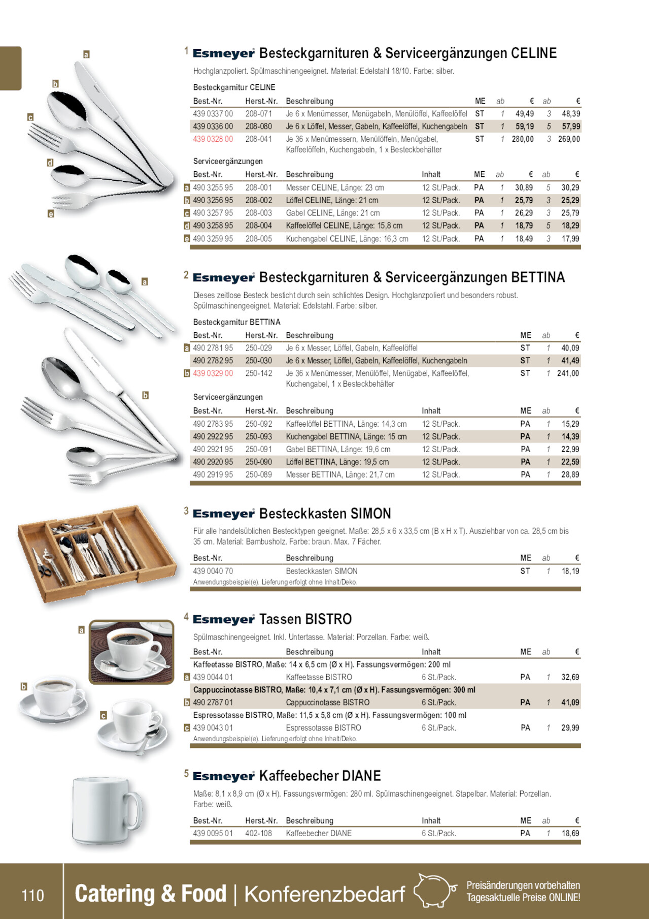 a b c d e 1 Besteckgarnituren & Serviceergänzungen CELINE Hochglanzpoliert. Spülmaschinengeeignet. Material: Edelstahl 18/10. Farbe: silber. Besteckgarnitur CELINE Best.-Nr. Herst.-Nr. 439 0337 00 208-071 439 0336 00 208-080 439 0328 00 208-041 Serviceergänzungen Best.-Nr. Herst.-Nr. a 490 3255 95 208-001 b 490 3256 95 208-002 c 490 3257 95 208-003 d 490 3258 95 208-004 e 490 3259 95 208-005 Beschreibung Je 6 x Menümesser, Menügabeln, Menülöffel, Kaffeelöffel Je 6 x Löffel, Messer, Gabeln, Kaffeelöffel, Kuchengabeln Je 36 x Menümessern, Menülöffeln, Menügabel, Kaffeelöffeln, Kuchengabeln, 1 x Besteckbehälter Beschreibung Messer CELINE, Länge: 23 cm Löffel CELINE, Länge: 21 cm Gabel CELINE, Länge: 21 cm Kaffeelöffel CELINE, Länge: 15,8 cm Kuchengabel CELINE, Länge: 16,3 cm Inhalt 12 St./Pack. 12 St./Pack. 12 St./Pack. 12 St./Pack. 12 St./Pack. ME ST ST ST ME PA PA PA PA PA ab € 1 49,49 1 59,19 1 280,00 ab € 1 30,89 1 25,79 1 26,29 1 18,79 1 18,49 ab € 3 48,39 5 57,99 3 269,00 ab € 5 30,29 3 25,29 3 25,79 5 18,29 3 17,99 a2 Besteckgarnituren & Serviceergänzungen BETTINA Dieses zeitlose Besteck besticht durch sein schlichtes Design. Hochglanzpoliert und besonders robust. Spülmaschinengeeignet. Material: Edelstahl. Farbe: silber. Besteckgarnitur BETTINA Best.-Nr. Herst.-Nr. Beschreibung a 490 2781 95 250-029 Je 6 x Messer, Löffel, Gabeln, Kaffeelöffel 490 2782 95 250-030 Je 6 x Messer, Löffel, Gabeln, Kaffeelöffel, Kuchengabeln b 439 0329 00 250-142 Je 36 x Menümesser, Menülöffel, Menügabel, Kaffeelöffel, Kuchengabel, 1 x Besteckbehälter b Serviceergänzungen Best.-Nr. Herst.-Nr. Beschreibung Inhalt 490 2783 95 250-092 Kaffeelöffel BETTINA, Länge: 14,3 cm 12 St./Pack. 490 2922 95 250-093 Kuchengabel BETTINA, Länge: 15 cm 12 St./Pack. 490 2921 95 250-091 Gabel BETTINA, Länge: 19,6 cm 12 St./Pack. 490 2920 95 250-090 Löffel BETTINA, Länge: 19,5 cm 12 St./Pack. 490 2919 95 250-089 Messer BETTINA, Länge: 21,7 cm 12 St./Pack. ME ab € ST 1 40,09 ST 1 41,49 ST 1 241,00 ME ab € PA 1 15,29 PA 1 14,39 PA 1 22,99 PA 1 22,59 PA 1 28,89 3 Besteckkasten SIMON Für alle handelsüblichen Bestecktypen geeignet. Maße: 28,5 x 6 x 33,5 cm (B x H x T). Ausziehbar von ca. 28,5 cm bis 35 cm. Material: Bambusholz. Farbe: braun. Max. 7 Fächer. Best.-Nr. Beschreibung 439 0040 70 Besteckkasten SIMON Anwendungsbeispiel(e). Lieferung erfolgt ohne Inhalt/Deko. ME ab € ST 1 18,19 a b c 4 Tassen BISTRO Spülmaschinengeeignet. Inkl. Untertasse. Material: Porzellan. Farbe: weiß. Best.-Nr. Beschreibung Inhalt Kaffeetasse BISTRO, Maße: 14 x 6,5 cm (Ø x H). Fassungsvermögen: 200 ml a 439 0044 01 Kaffeetasse BISTRO 6 St./Pack. Cappuccinotasse BISTRO, Maße: 10,4 x 7,1 cm (Ø x H). Fassungsvermögen: 300 ml b 490 2787 01 Cappuccinotasse BISTRO 6 St./Pack. Espressotasse BISTRO, Maße: 11,5 x 5,8 cm (Ø x H). Fassungsvermögen: 100 ml c 439 0043 01 Espressotasse BISTRO 6 St./Pack. Anwendungsbeispiel(e). Lieferung erfolgt ohne Inhalt/Deko. ME ab € PA 1 32,69 PA 1 41,09 PA 1 29,99 5 Kaffeebecher DIANE Maße: 8,1 x 8,9 cm (Ø x H). Fassungsvermögen: 280 ml. Spülmaschinengeeignet. Stapelbar. Material: Porzellan. Farbe: weiß. Best.-Nr. Herst.-Nr. Beschreibung 439 0095 01 402-108 Kaffeebecher DIANE Inhalt 6 St./Pack. ME ab € PA 1 18,69 110 Catering & Food | Konferenzbedarf Preisänderungen vorbehalten Tagesaktuelle Preise ONLINE! 439004070 490292195 490278701 490278195 490325595 439004301 490325995 490292295 439032900 490278395 439004401 439033600 490325795 439009501 439033700 490291995 490325895 490325695 439032800 490292095 490278295