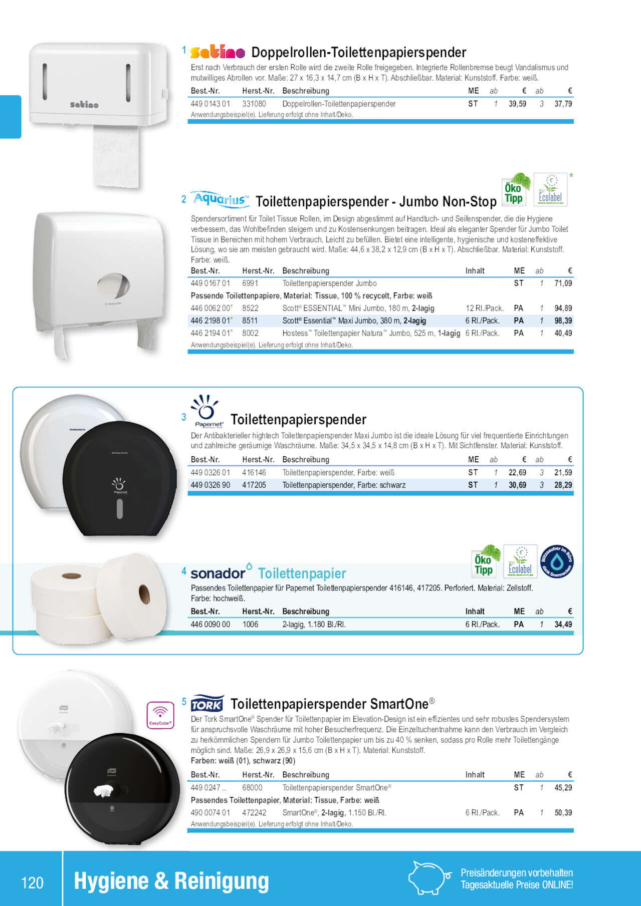 1 Doppelrollen-Toilettenpapierspender Erst nach Verbrauch der ersten Rolle wird die zweite Rolle freigegeben. Integrierte Rollenbremse beugt Vandalismus und mutwilliges Abrollen vor. Maße: 27 x 16,3 x 14,7 cm (B x H x T). Abschließbar. Material: Kunststoff. Farbe: weiß. Best.-Nr. Herst.-Nr. Beschreibung ME ab € ab € 449 0143 01 331080 Doppelrollen-Toilettenpapierspender Anwendungsbeispiel(e). Lieferung erfolgt ohne Inhalt/Deko. ST 1 39,59 3 37,79 * 2 Toilettenpapierspender - Jumbo Non-Stop Spendersortiment für Toilet Tissue Rollen, im Design abgestimmt auf Handtuch- und Seifenspender, die die Hygiene verbessern, das Wohlbefinden steigern und zu Kostensenkungen beitragen. Ideal als eleganter Spender für Jumbo Toilet Tissue in Bereichen mit hohem Verbrauch. Leicht zu befüllen. Bietet eine intelligente, hygienische und kosteneffektive Lösung, wo sie am meisten gebraucht wird. Maße: 44,6 x 38,2 x 12,9 cm (B x H x T). Abschließbar. Material: Kunststoff. Farbe: weiß. Best.-Nr. Herst.-Nr. Beschreibung Inhalt ME ab € 449 0167 01 6991 Toilettenpapierspender Jumbo ST 1 71,09 Passende Toilettenpapiere, Material: Tissue, 100 % recycelt, Farbe: weiß 446 0062 00* 8522 Scott® ESSENTIAL™ Mini Jumbo, 180 m, 2-lagig 12 Rl./Pack. PA 1 94,89 446 2198 01* 8511 Scott® Essential™ Maxi Jumbo, 380 m, 2-lagig 6 Rl./Pack. PA 1 98,39 446 2194 01* 8002 Hostess™ Toilettenpapier Natura™ Jumbo, 525 m, 1-lagig 6 Rl./Pack. PA 1 40,49 Anwendungsbeispiel(e). Lieferung erfolgt ohne Inhalt/Deko. 3 Toilettenpapierspender Der Antibakterieller hightech Toilettenpapierspender Maxi Jumbo ist die ideale Lösung für viel frequentierte Einrichtungen und zahlreiche geräumige Waschräume. Maße: 34,5 x 34,5 x 14,8 cm (B x H x T). Mit Sichtfenster. Material: Kunststoff. Best.-Nr. Herst.-Nr. Beschreibung ME ab € ab € 449 0326 01 416146 Toilettenpapierspender, Farbe: weiß ST 1 22,69 3 21,59 449 0326 90 417205 Toilettenpapierspender, Farbe: schwarz ST 1 30,69 3 28,29 4 Toilettenpapier Passendes Toilettenpapier für Papernet Toilettenpapierspender 416146, 417205. Perforiert. Material: Zellstoff. Farbe: hochweiß. Best.-Nr. Herst.-Nr. Beschreibung Inhalt ME ab 446 0090 00 1006 2-lagig, 1.180 Bl./Rl. 6 Rl./Pack. PA 1 € 34,49 5 Toilettenpapierspender SmartOne® Der Tork SmartOne® Spender für Toilettenpapier im Elevation-Design ist ein effizientes und sehr robustes Spendersystem für anspruchsvolle Waschräume mit hoher Besucherfrequenz. Die Einzeltuchentnahme kann den Verbrauch im Vergleich zu herkömmlichen Spendern für Jumbo Toilettenpapier um bis zu 40 % senken, sodass pro Rolle mehr Toilettengänge möglich sind. Maße: 26,9 x 26,9 x 15,6 cm (B x H x T). Material: Kunststoff. Farben: weiß (01), schwarz (90) Best.-Nr. Herst.-Nr. Beschreibung Inhalt ME ab € 449 0247 .. 68000 Toilettenpapierspender SmartOne® ST 1 45,29 Passendes Toilettenpapier, Material: Tissue, Farbe: weiß 490 0074 01 472242 SmartOne®, 2-lagig, 1.150 Bl./Rl. Anwendungsbeispiel(e). Lieferung erfolgt ohne Inhalt/Deko. 6 Rl./Pack. PA 1 50,39 120 Hygiene & Reinigung Preisänderungen vorbehalten Tagesaktuelle Preise ONLINE! 490007401 446219801 446219401 449014301 446006200 449024790 449032601 449024701 449032690 449016701