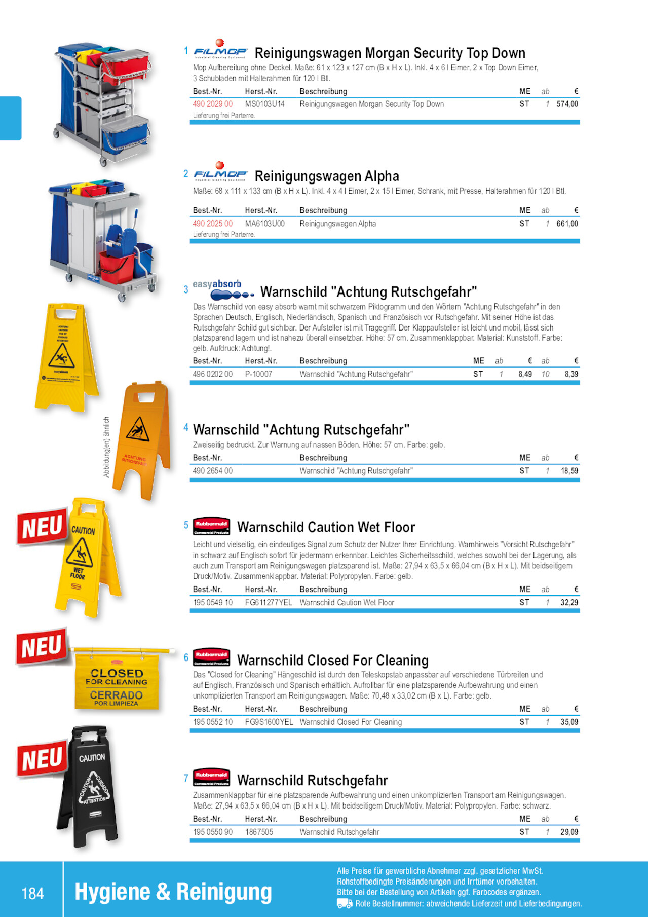 1 Reinigungswagen Morgan Security Top Down Mop Aufbereitung ohne Deckel. Maße: 61 x 123 x 127 cm (B x H x L). Inkl. 4 x 6 l Eimer, 2 x Top Down Eimer, 3 Schubladen mit Halterahmen für 120 l Btl. Best.-Nr. Herst.-Nr. Beschreibung ME ab € 490 2029 00 MS0103U14 Reinigungswagen Morgan Security Top Down ST 1 574,00 Lieferung frei Parterre. 2 Reinigungswagen Alpha Maße: 68 x 111 x 133 cm (B x H x L). Inkl. 4 x 4 l Eimer, 2 x 15 l Eimer, Schrank, mit Presse, Halterahmen für 120 l Btl. Best.-Nr. Herst.-Nr. 490 2025 00 MA6103U00 Lieferung frei Parterre. Beschreibung Reinigungswagen Alpha ME ab € ST 1 661,00 Abbildung(en) ähnlich 3 Warnschild "Achtung Rutschgefahr" Das Warnschild von easy absorb warnt mit schwarzem Piktogramm und den Wörtern "Achtung Rutschgefahr" in den Sprachen Deutsch, Englisch, Niederländisch, Spanisch und Französisch vor Rutschgefahr. Mit seiner Höhe ist das Rutschgefahr Schild gut sichtbar. Der Aufsteller ist mit Tragegriff. Der Klappaufsteller ist leicht und mobil, lässt sich platzsparend lagern und ist nahezu überall einsetzbar. Höhe: 57 cm. Zusammenklappbar. Material: Kunststoff. Farbe: gelb. Aufdruck: Achtung!. Best.-Nr. Herst.-Nr. Beschreibung ME ab € ab € 496 0202 00 P-10007 Warnschild "Achtung Rutschgefahr" ST 1 8,49 10 8,39 4 Warnschild "Achtung Rutschgefahr" Zweiseitig bedruckt. Zur Warnung auf nassen Böden. Höhe: 57 cm. Farbe: gelb. Best.-Nr. Beschreibung 490 2654 00 Warnschild "Achtung Rutschgefahr" ME ab € ST 1 18,59 5 Warnschild Caution Wet Floor Leicht und vielseitig, ein eindeutiges Signal zum Schutz der Nutzer Ihrer Einrichtung. Warnhinweis "Vorsicht Rutschgefahr" in schwarz auf Englisch sofort für jedermann erkennbar. Leichtes Sicherheitsschild, welches sowohl bei der Lagerung, als auch zum Transport am Reinigungswagen platzsparend ist. Maße: 27,94 x 63,5 x 66,04 cm (B x H x L). Mit beidseitigem Druck/Motiv. Zusammenklappbar. Material: Polypropylen. Farbe: gelb. Best.-Nr. Herst.-Nr. Beschreibung ME ab € 195 0549 10 FG611277YEL Warnschild Caution Wet Floor ST 1 32,29 6 Warnschild Closed For Cleaning Das "Closed for Cleaning" Hängeschild ist durch den Teleskopstab anpassbar auf verschiedene Türbreiten und auf Englisch, Französisch und Spanisch erhältlich. Aufrollbar für eine platzsparende Aufbewahrung und einen unkomplizierten Transport am Reinigungswagen. Maße: 70,48 x 33,02 cm (B x L). Farbe: gelb. Best.-Nr. Herst.-Nr. Beschreibung ME ab 195 0552 10 FG9S1600YEL Warnschild Closed For Cleaning ST 1 € 35,09 7 Warnschild Rutschgefahr Zusammenklappbar für eine platzsparende Aufbewahrung und einen unkomplizierten Transport am Reinigungswagen. Maße: 27,94 x 63,5 x 66,04 cm (B x H x L). Mit beidseitigem Druck/Motiv. Material: Polypropylen. Farbe: schwarz. Best.-Nr. Herst.-Nr. Beschreibung ME ab € 195 0550 90 1867505 Warnschild Rutschgefahr ST 1 29,09 184 Hygiene & Reinigung Alle Preise für gewerbliche Abnehmer zzgl. gesetzlicher MwSt. Rohstoffbedingte Preisänderungen undPIrrretüismäenrdveorrbuenhgaeltnenv.orbehalten Bitte bei der Bestellung von Artikeln ggfT.aFgaerbscaokdteuseellregäPnrzeeins.e ONLINE! Rote Bestellnummer: abweichende Lieferzeit und Lieferbedingungen. 195054910 195055090 490202900 490202500 496020200 195055210 490265400