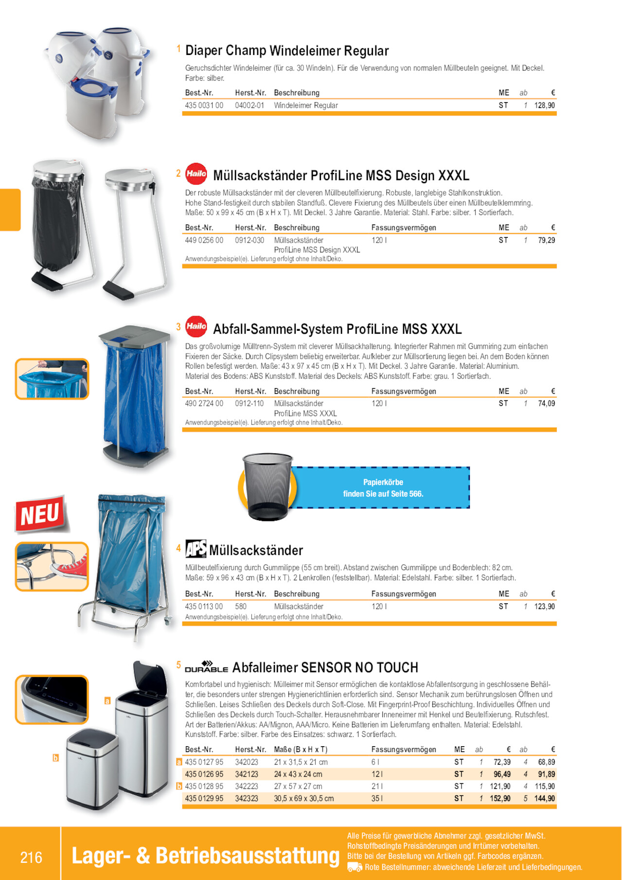 1 Diaper Champ Windeleimer Regular Geruchsdichter Windeleimer (für ca. 30 Windeln). Für die Verwendung von normalen Müllbeuteln geeignet. Mit Deckel. Farbe: silber. Best.-Nr. Herst.-Nr. Beschreibung 435 0031 00 04002-01 Windeleimer Regular ME ab € ST 1 128,90 2 Müllsackständer ProfiLine MSS Design XXXL Der robuste Müllsackständer mit der cleveren Müllbeutelfixierung. Robuste, langlebige Stahlkonstruktion. Hohe Stand-festigkeit durch stabilen Standfuß. Clevere Fixierung des Müllbeutels über einen Müllbeutelklemmring. Maße: 50 x 99 x 45 cm (B x H x T). Mit Deckel. 3 Jahre Garantie. Material: Stahl. Farbe: silber. 1 Sortierfach. Best.-Nr. Herst.-Nr. Beschreibung 449 0256 00 0912-030 Müllsackständer ProfiLine MSS Design XXXL Anwendungsbeispiel(e). Lieferung erfolgt ohne Inhalt/Deko. Fassungsvermögen 120 l ME ab € ST 1 79,29 3 Abfall-Sammel-System ProfiLine MSS XXXL Das großvolumige Mülltrenn-System mit cleverer Müllsackhalterung. Integrierter Rahmen mit Gummiring zum einfachen Fixieren der Säcke. Durch Clipsystem beliebig erweiterbar. Aufkleber zur Müllsortierung liegen bei. An dem Boden können Rollen befestigt werden. Maße: 43 x 97 x 45 cm (B x H x T). Mit Deckel. 3 Jahre Garantie. Material: Aluminium. Material des Bodens: ABS Kunststoff. Material des Deckels: ABS Kunststoff. Farbe: grau. 1 Sortierfach. Best.-Nr. Herst.-Nr. Beschreibung 490 2724 00 0912-110 Müllsackständer ProfiLine MSS XXXL Anwendungsbeispiel(e). Lieferung erfolgt ohne Inhalt/Deko. Fassungsvermögen 120 l ME ab € ST 1 74,09 Papierkörbe finden Sie auf Seite 566. 4 Müllsackständer Müllbeutelfixierung durch Gummilippe (55 cm breit). Abstand zwischen Gummilippe und Bodenblech: 82 cm. Maße: 59 x 96 x 43 cm (B x H x T). 2 Lenkrollen (feststellbar). Material: Edelstahl. Farbe: silber. 1 Sortierfach. Best.-Nr. Herst.-Nr. Beschreibung 435 0113 00 580 Müllsackständer Anwendungsbeispiel(e). Lieferung erfolgt ohne Inhalt/Deko. Fassungsvermögen 120 l ME ab € ST 1 123,90 a b 5 Abfalleimer SENSOR NO TOUCH Komfortabel und hygienisch: Mülleimer mit Sensor ermöglichen die kontaktlose Abfallentsorgung in geschlossene Behälter, die besonders unter strengen Hygienerichtlinien erforderlich sind. Sensor Mechanik zum berührungslosen Öffnen und Schließen. Leises Schließen des Deckels durch Soft-Close. Mit Fingerprint-Proof Beschichtung. Individuelles Öffnen und Schließen des Deckels durch Touch-Schalter. Herausnehmbarer Inneneimer mit Henkel und Beutelfixierung. Rutschfest. Art der Batterien/Akkus: AA/Mignon, AAA/Micro. Keine Batterien im Lieferumfang enthalten. Material: Edelstahl. Kunststoff. Farbe: silber. Farbe des Einsatzes: schwarz. 1 Sortierfach. Best.-Nr. a 435 0127 95 435 0126 95 b 435 0128 95 435 0129 95 Herst.-Nr. 342023 342123 342223 342323 Maße (B x H x T) 21 x 31,5 x 21 cm 24 x 43 x 24 cm 27 x 57 x 27 cm 30,5 x 69 x 30,5 cm Fassungsvermögen 6l 12 l 21 l 35 l ME ab € ab € ST 1 72,39 4 68,89 ST 1 96,49 4 91,89 ST 1 121,90 4 115,90 ST 1 152,90 5 144,90 216 Alle Preise für gewerbliche Abnehmer zzgl. gesetzlicher MwSt. Lager- & Betriebsausstattung Rohstoffbedingte Preisänderungen und Irrtümer vorbehalten. Bitte bei der Bestellung von Artikeln ggf. Farbcodes ergänzen. Rote Bestellnummer: abweichende Lieferzeit und Lieferbedingungen. 490272400 435012695 435003100 449025600 435012795 435011300 435012895 435012995