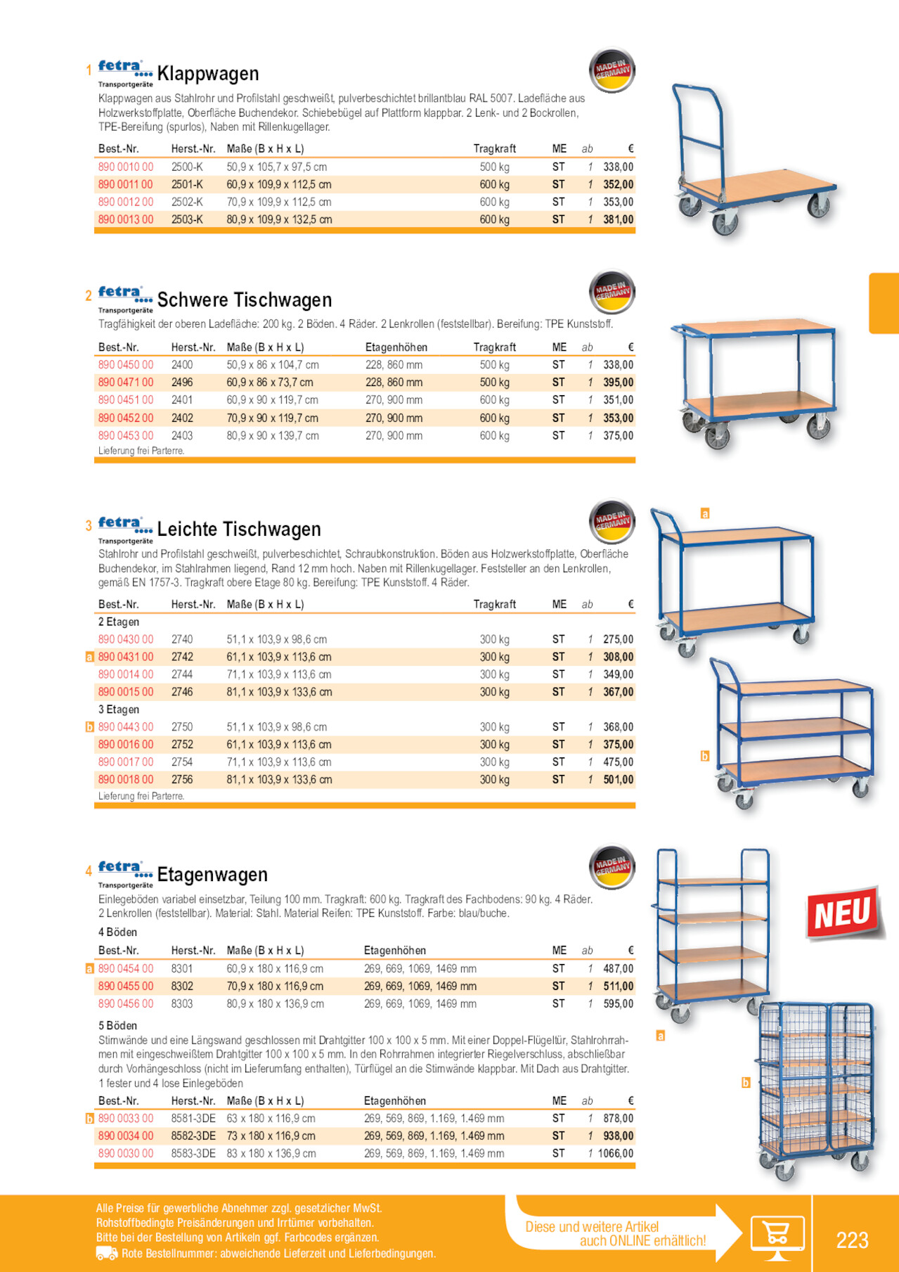 1 Klappwagen Klappwagen aus Stahlrohr und Profilstahl geschweißt, pulverbeschichtet brillantblau RAL 5007. Ladefläche aus Holzwerkstoffplatte, Oberfläche Buchendekor. Schiebebügel auf Plattform klappbar. 2 Lenk- und 2 Bockrollen, TPE-Bereifung (spurlos), Naben mit Rillenkugellager. Best.-Nr. 890 0010 00 890 0011 00 890 0012 00 890 0013 00 Herst.-Nr. 2500-K 2501-K 2502-K 2503-K Maße (B x H x L) 50,9 x 105,7 x 97,5 cm 60,9 x 109,9 x 112,5 cm 70,9 x 109,9 x 112,5 cm 80,9 x 109,9 x 132,5 cm Tragkraft 500 kg 600 kg 600 kg 600 kg ME ab € ST 1 338,00 ST 1 352,00 ST 1 353,00 ST 1 381,00 2 Schwere Tischwagen Tragfähigkeit der oberen Ladefläche: 200 kg. 2 Böden. 4 Räder. 2 Lenkrollen (feststellbar). Bereifung: TPE Kunststoff. Best.-Nr. Herst.-Nr. 890 0450 00 2400 890 0471 00 2496 890 0451 00 2401 890 0452 00 2402 890 0453 00 2403 Lieferung frei Parterre. Maße (B x H x L) 50,9 x 86 x 104,7 cm 60,9 x 86 x 73,7 cm 60,9 x 90 x 119,7 cm 70,9 x 90 x 119,7 cm 80,9 x 90 x 139,7 cm Etagenhöhen 228, 860 mm 228, 860 mm 270, 900 mm 270, 900 mm 270, 900 mm Tragkraft 500 kg 500 kg 600 kg 600 kg 600 kg ME ab € ST 1 338,00 ST 1 395,00 ST 1 351,00 ST 1 353,00 ST 1 375,00 3 Leichte Tischwagen Stahlrohr und Profilstahl geschweißt, pulverbeschichtet, Schraubkonstruktion. Böden aus Holzwerkstoffplatte, Oberfläche Buchendekor, im Stahlrahmen liegend, Rand 12 mm hoch. Naben mit Rillenkugellager. Feststeller an den Lenkrollen, gemäß EN 1757-3. Tragkraft obere Etage 80 kg. Bereifung: TPE Kunststoff. 4 Räder. Best.-Nr. Herst.-Nr. 2 Etagen 890 0430 00 2740 a 890 0431 00 2742 890 0014 00 2744 890 0015 00 2746 3 Etagen b 890 0443 00 2750 890 0016 00 2752 890 0017 00 2754 890 0018 00 2756 Lieferung frei Parterre. Maße (B x H x L) 51,1 x 103,9 x 98,6 cm 61,1 x 103,9 x 113,6 cm 71,1 x 103,9 x 113,6 cm 81,1 x 103,9 x 133,6 cm 51,1 x 103,9 x 98,6 cm 61,1 x 103,9 x 113,6 cm 71,1 x 103,9 x 113,6 cm 81,1 x 103,9 x 133,6 cm Tragkraft 300 kg 300 kg 300 kg 300 kg 300 kg 300 kg 300 kg 300 kg ME ab € ST 1 275,00 ST 1 308,00 ST 1 349,00 ST 1 367,00 ST 1 368,00 ST 1 375,00 ST 1 475,00 ST 1 501,00 a b 4 Etagenwagen Einlegeböden variabel einsetzbar, Teilung 100 mm. Tragkraft: 600 kg. Tragkraft des Fachbodens: 90 kg. 4 Räder. 2 Lenkrollen (feststellbar). Material: Stahl. Material Reifen: TPE Kunststoff. Farbe: blau/buche. 4 Böden Best.-Nr. Herst.-Nr. Maße (B x H x L) Etagenhöhen ME ab € a 890 0454 00 8301 60,9 x 180 x 116,9 cm 269, 669, 1069, 1469 mm ST 1 487,00 890 0455 00 8302 70,9 x 180 x 116,9 cm 269, 669, 1069, 1469 mm ST 1 511,00 890 0456 00 8303 80,9 x 180 x 136,9 cm 269, 669, 1069, 1469 mm ST 1 595,00 5 Böden Stirnwände und eine Längswand geschlossen mit Drahtgitter 100 x 100 x 5 mm. Mit einer Doppel-Flügeltür, Stahlrohrrahmen mit eingeschweißtem Drahtgitter 100 x 100 x 5 mm. In den Rohrrahmen integrierter Riegelverschluss, abschließbar durch Vorhängeschloss (nicht im Lieferumfang enthalten), Türflügel an die Stirnwände klappbar. Mit Dach aus Drahtgitter. 1 fester und 4 lose Einlegeböden Best.-Nr. Herst.-Nr. Maße (B x H x L) Etagenhöhen ME ab € b 890 0033 00 8581-3DE 63 x 180 x 116,9 cm 269, 569, 869, 1.169, 1.469 mm ST 1 878,00 890 0034 00 8582-3DE 73 x 180 x 116,9 cm 269, 569, 869, 1.169, 1.469 mm ST 1 938,00 890 0030 00 8583-3DE 83 x 180 x 136,9 cm 269, 569, 869, 1.169, 1.469 mm ST 1 1066,00 a b Alle Preise für gewerbliche Abnehmer zzgl. gesetzlicher MwSt. Rohstoffbedingte Preisänderungen und Irrtümer vorbehalten. Bitte bei der Bestellung von Artikeln ggf. Farbcodes ergänzen. Rote Bestellnummer: abweichende Lieferzeit und Lieferbedingungen. Diese und weitere Artikel auch ONLINE erhältlich! 223 890001100 890001300 890001600 890045500 890045300 890045600 890001200 890003000 890001500 890001800 890045100 890043000 890003300 890045400 890044300 890001000 890003400 890001700 890001400 890045200 890045000 890043100 890047100