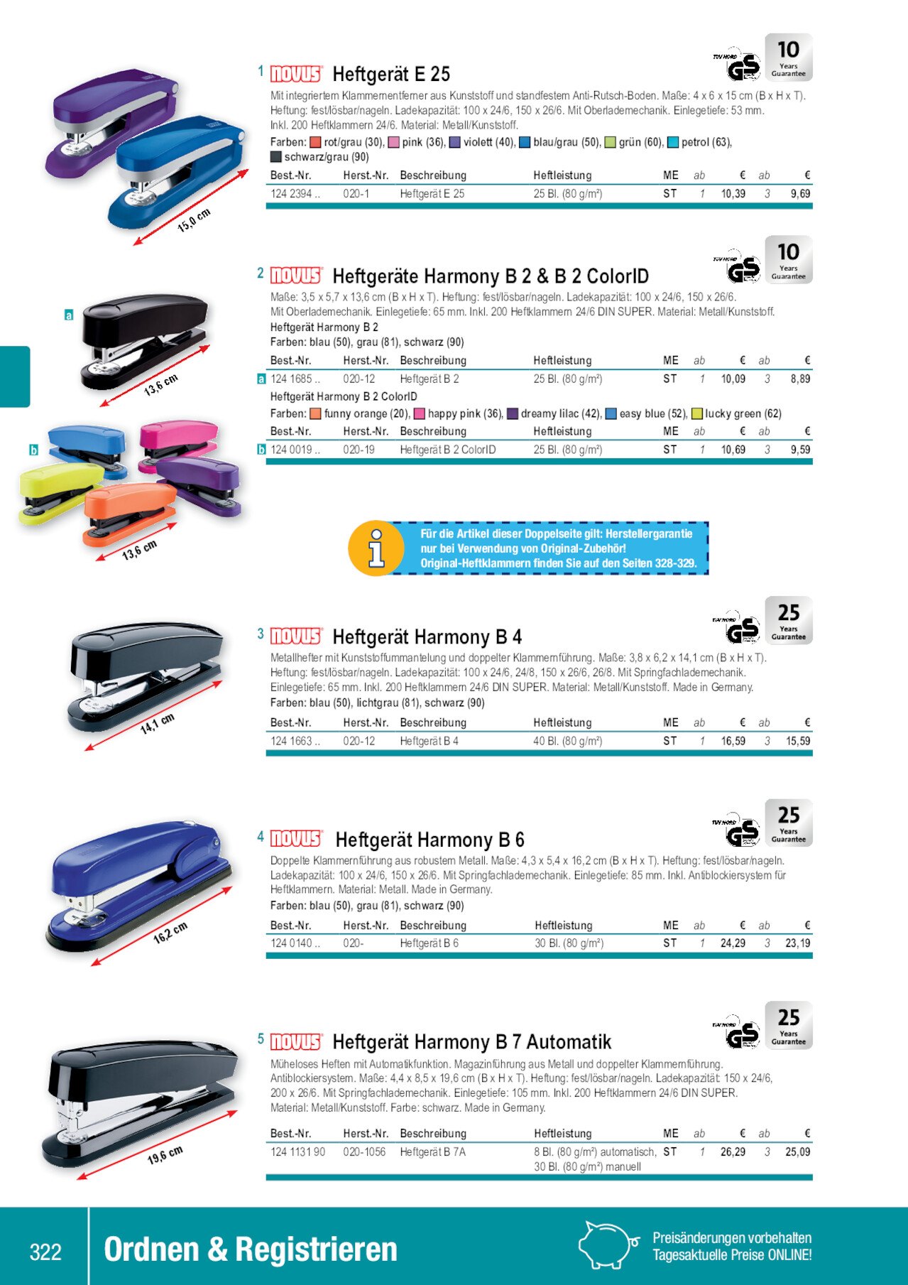 a b 15,0 cm 13,6 cm 1 Heftgerät E 25 Years Guarantee Mit integriertem Klammernentferner aus Kunststoff und standfestem Anti-Rutsch-Boden. Maße: 4 x 6 x 15 cm (B x H x T). Heftung: fest/lösbar/nageln. Ladekapazität: 100 x 24/6, 150 x 26/6. Mit Oberlademechanik. Einlegetiefe: 53 mm. Inkl. 200 Heftklammern 24/6. Material: Metall/Kunststoff. Farben: rot/grau (30), pink (36), violett (40), blau/grau (50), grün (60), petrol (63), schwarz/grau (90) Best.-Nr. Herst.-Nr. Beschreibung Heftleistung ME ab € ab € 124 2394 .. 020-1 Heftgerät E 25 25 Bl. (80 g/m²) ST 1 10,39 3 9,69 2 Heftgeräte Harmony B 2 & B 2 ColorID Years Guarantee Maße: 3,5 x 5,7 x 13,6 cm (B x H x T). Heftung: fest/lösbar/nageln. Ladekapazität: 100 x 24/6, 150 x 26/6. Mit Oberlademechanik. Einlegetiefe: 65 mm. Inkl. 200 Heftklammern 24/6 DIN SUPER. Material: Metall/Kunststoff. Heftgerät Harmony B 2 Farben: blau (50), grau (81), schwarz (90) Best.-Nr. Herst.-Nr. Beschreibung Heftleistung ME ab € ab € a 124 1685 .. 020-12 Heftgerät B 2 25 Bl. (80 g/m²) ST 1 10,09 3 8,89 Heftgerät Harmony B 2 ColorID Farben: funny orange (20), happy pink (36), dreamy lilac (42), easy blue (52), lucky green (62) Best.-Nr. Herst.-Nr. Beschreibung Heftleistung ME ab € ab € b 124 0019 .. 020-19 Heftgerät B 2 ColorID 25 Bl. (80 g/m²) ST 1 10,69 3 9,59 13,6 cm 14,1 cm Für die Artikel dieser Doppelseite gilt: Herstellergarantie nur bei Verwendung von Original-Zubehör! Original-Heftklammern finden Sie auf den Seiten 328-329. 3 Heftgerät Harmony B 4 Metallhefter mit Kunststoffummantelung und doppelter Klammernführung. Maße: 3,8 x 6,2 x 14,1 cm (B x H x T). Heftung: fest/lösbar/nageln. Ladekapazität: 100 x 24/6, 24/8, 150 x 26/6, 26/8. Mit Springfachlademechanik. Einlegetiefe: 65 mm. Inkl. 200 Heftklammern 24/6 DIN SUPER. Material: Metall/Kunststoff. Made in Germany. Farben: blau (50), lichtgrau (81), schwarz (90) Best.-Nr. Herst.-Nr. Beschreibung Heftleistung ME ab € ab 124 1663 .. 020-12 Heftgerät B 4 40 Bl. (80 g/m²) ST 1 16,59 3 € 15,59 16,2 cm 4 Heftgerät Harmony B 6 Doppelte Klammernführung aus robustem Metall. Maße: 4,3 x 5,4 x 16,2 cm (B x H x T). Heftung: fest/lösbar/nageln. Ladekapazität: 100 x 24/6, 150 x 26/6. Mit Springfachlademechanik. Einlegetiefe: 85 mm. Inkl. Antiblockiersystem für Heftklammern. Material: Metall. Made in Germany. Farben: blau (50), grau (81), schwarz (90) Best.-Nr. Herst.-Nr. Beschreibung Heftleistung ME ab € ab € 124 0140 .. 020- Heftgerät B 6 30 Bl. (80 g/m²) ST 1 24,29 3 23,19 19,6 cm 5 Heftgerät Harmony B 7 Automatik Müheloses Heften mit Automatikfunktion. Magazinführung aus Metall und doppelter Klammernführung. Antiblockiersystem. Maße: 4,4 x 8,5 x 19,6 cm (B x H x T). Heftung: fest/lösbar/nageln. Ladekapazität: 150 x 24/6, 200 x 26/6. Mit Springfachlademechanik. Einlegetiefe: 105 mm. Inkl. 200 Heftklammern 24/6 DIN SUPER. Material: Metall/Kunststoff. Farbe: schwarz. Made in Germany. Best.-Nr. Herst.-Nr. Beschreibung 124 1131 90 020-1056 Heftgerät B 7A Heftleistung ME ab € ab € 8 Bl. (80 g/m²) automatisch, ST 1 26,29 3 25,09 30 Bl. (80 g/m²) manuell 322 Ordnen & Registrieren Preisänderungen vorbehalten Tagesaktuelle Preise ONLINE! 124239440 124239450 124014081 124166350 124168581 124001942 124113190 124001936 124239430 124001920 124166390 124239460 124014090 124168550 124168590 124001962 124001952 124239436 124014050 124166381 124239490 124239463