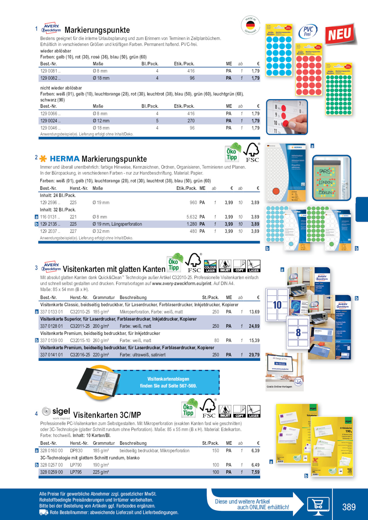 1 Markierungspunkte Bestens geeignet für die interne Urlaubsplanung und zum Erinnern von Terminen in Zeitplanbüchern. Erhältlich in verschiedenen Größen und kräftigen Farben. Permanent haftend. PVC-frei. wieder ablösbar Farben: gelb (10), rot (30), rosé (36), blau (50), grün (60) Best.-Nr. Maße Bl./Pack. Etik./Pack. 129 0081 .. Ø 8 mm 4 416 129 0082 .. Ø 18 mm 4 96 ME PA PA ab 1 1 nicht wieder ablösbar Farben: weiß (01), gelb (10), leuchtorange (28), rot (30), leuchtrot (38), blau (50), grün (60), leuchtgrün (68), schwarz (90) Best.-Nr. Maße Bl./Pack. Etik./Pack. ME ab 129 0066 .. Ø 8 mm 4 416 PA 1 129 0024 .. Ø 12 mm 5 270 PA 1 129 0046 .. Ø 18 mm 4 96 PA 1 Anwendungsbeispiel(e). Lieferung erfolgt ohne Inhalt/Deko. € 1,79 1,79 € 1,79 1,79 1,79 2 Markierungspunkte Immer und überall unentbehrlich: farbige Hinweise, Kennzeichnen, Ordnen, Organisieren, Terminieren und Planen. In der Büropackung, in verschiedenen Farben - nur zur Handbeschriftung. Material: Papier. Farben: weiß (01), gelb (10), leuchtorange (28), rot (30), leuchtrot (38), blau (50), grün (60) Best.-Nr. Herst.-Nr. Maße Etik./Pack. ME ab € ab Inhalt: 24 Bl./Pack. 129 2596 .. 225 Ø 19 mm 960 PA 1 3,99 10 Inhalt: 32 Bl./Pack. a 116 0131 .. 221 Ø 8 mm 5.632 PA 1 3,99 10 b 129 2135 .. 225 Ø 19 mm, Längsperforation 1.280 PA 1 3,99 10 129 2037 .. 227 Ø 32 mm 480 PA 1 3,99 10 Anwendungsbeispiel(e). Lieferung erfolgt ohne Inhalt/Deko. € 3,89 3,89 3,89 3,89 b 3 Visitenkarten mit glatten Kanten Mit absolut glatten Kanten dank Quick&Clean™ Technologie außer Artikel C32010-25. Professionelle Visitenkarten einfach und schnell selbst gestalten und drucken. Formatvorlagen auf www.avery-zweckform.eu/print. Auf DIN A4. Maße: 85 x 54 mm (B x H). Best.-Nr. Herst.-Nr. Grammatur Beschreibung St./Pack. ME ab € Visitenkarte Classic, beidseitig bedruckbar, für Laserdrucker, Farblaserdrucker, Inkjetdrucker, Kopierer a 337 0133 01 C32010-25 185 g/m² Mikroperforation, Farbe: weiß, matt 250 PA 1 13,69 Visitenkarte Superior, für Laserdrucker, Farblaserdrucker, Inkjetdrucker, Kopierer 337 0128 01 C32011-25 200 g/m² Farbe: weiß, matt 250 PA 1 24,89 Visitenkarte Premium, beidseitig bedruckbar, für Inkjetdrucker b 337 0139 00 C32015-10 260 g/m² Farbe: weiß, matt 80 PA 1 15,39 Visitenkarte Premium, beidseitig bedruckbar, für Laserdrucker, Farblaserdrucker, Kopierer 337 0141 01 C32016-25 220 g/m² Farbe: ultraweiß, satiniert 250 PA 1 29,79 a Visitenkartenablagen finden Sie auf Seite 567-569. a 4 Visitenkarten 3C/MP Professionelle PC-Visitenkarten zum Selbstgestalten. Mit Mikroperforation (exakten Kanten fast wie geschnitten) oder 3C-Technologie (glatter Schnitt rundum ohne Perforation). Maße: 85 x 55 mm (B x H). Material: Edelkarton. Farbe: hochweiß. Inhalt: 10 Karten/Bl. Best.-Nr. Herst.-Nr. Grammatur Beschreibung St./Pack. ME ab a 328 0160 00 DP830 185 g/m² beidseitig bedruckbar, Mikroperforation 150 PA 1 3C-Technologie mit glattem Schnitt rundum, blanko b 328 0257 00 LP790 190 g/m² 100 PA 1 328 0259 00 LP795 225 g/m² 100 PA 1 € 6,39 6,49 7,59 a Alle Preise für gewerbliche Abnehmer zzgl. gesetzlicher MwSt. Rohstoffbedingte Preisänderungen und Irrtümer vorbehalten. Bitte bei der Bestellung von Artikeln ggf. Farbcodes ergänzen. Rote Bestellnummer: abweichende Lieferzeit und Lieferbedingungen. Diese und weitere Artikel auch ONLINE erhältlich! b b b 389 129006630 116013101 337013900 129004638 129203760 129203701 129004650 129004601 129002460 129213550 129213510 337012801 328025900 116013110 129006610 116013130 129004630 129259628 129203750 328025700 129006638 129008150 129006650 129002401 129213560 337013301 129006601 129213530 337014101 129006690 129203730 129008130 129002428 129213501 129006628 129002450 129006668 116013150 116013160 129008136 129004660 129008160 129002490 129008250 328016000 129203710 129259638 129006660 129004690 129008230 129002410 129004668 129008210 129004628 129002468 129004610 129008260 129002438 129002430 129008110 129008236