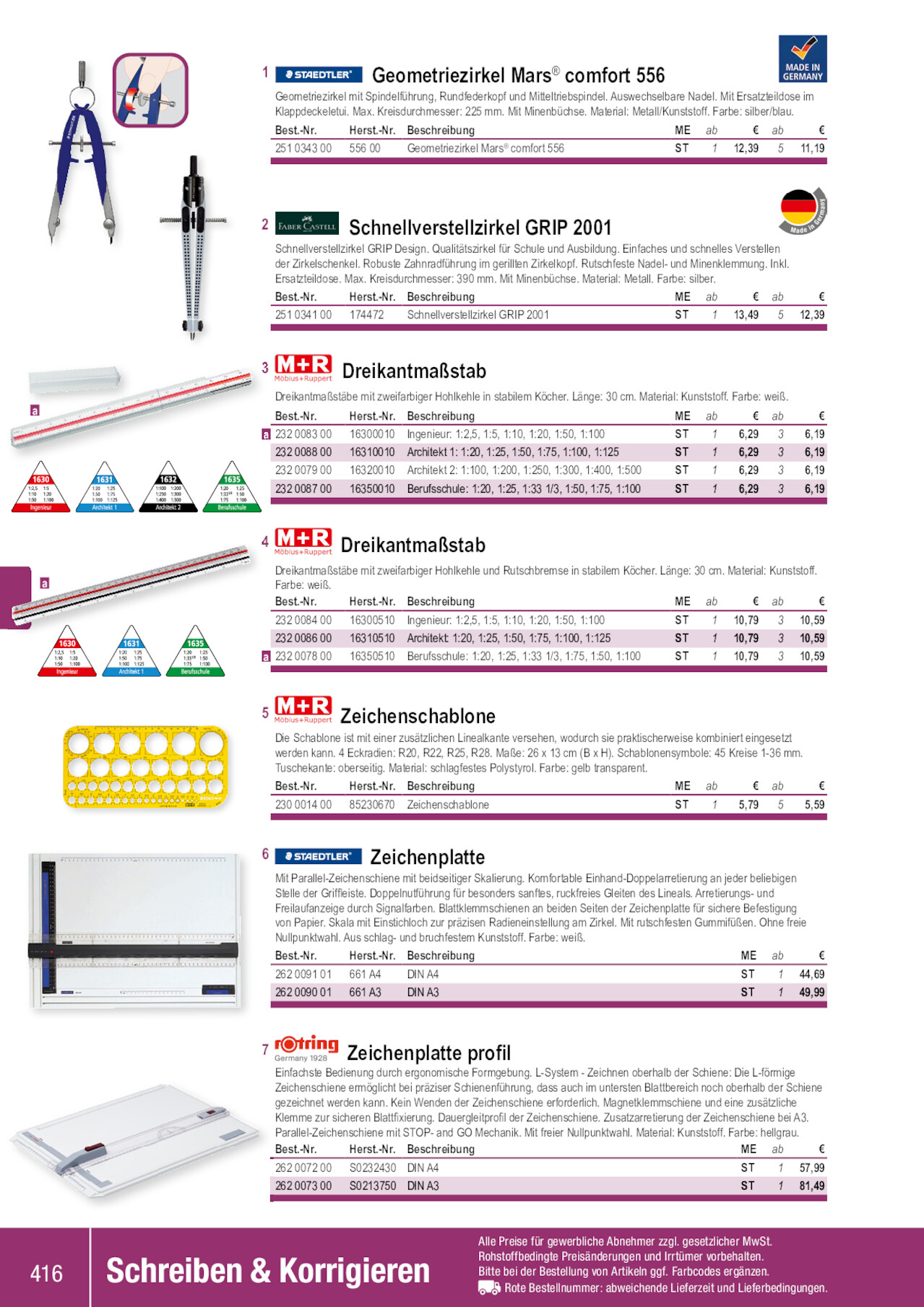 1 Geometriezirkel Mars® comfort 556 Geometriezirkel mit Spindelführung, Rundfederkopf und Mitteltriebspindel. Auswechselbare Nadel. Mit Ersatzteildose im Klappdeckeletui. Max. Kreisdurchmesser: 225 mm. Mit Minenbüchse. Material: Metall/Kunststoff. Farbe: silber/blau. Best.-Nr. Herst.-Nr. Beschreibung ME ab € ab € 251 0343 00 556 00 Geometriezirkel Mars® comfort 556 ST 1 12,39 5 11,19 2 Schnellverstellzirkel GRIP 2001 Schnellverstellzirkel GRIP Design. Qualitätszirkel für Schule und Ausbildung. Einfaches und schnelles Verstellen der Zirkelschenkel. Robuste Zahnradführung im gerillten Zirkelkopf. Rutschfeste Nadel- und Minenklemmung. Inkl. Ersatzteildose. Max. Kreisdurchmesser: 390 mm. Mit Minenbüchse. Material: Metall. Farbe: silber. Best.-Nr. Herst.-Nr. Beschreibung ME ab € ab € 251 0341 00 174472 Schnellverstellzirkel GRIP 2001 ST 1 13,49 5 12,39 3 Dreikantmaßstab Dreikantmaßstäbe mit zweifarbiger Hohlkehle in stabilem Köcher. Länge: 30 cm. Material: Kunststoff. Farbe: weiß. a Best.-Nr. Herst.-Nr. Beschreibung ME ab € ab € a 232 0083 00 16300010 Ingenieur: 1:2,5, 1:5, 1:10, 1:20, 1:50, 1:100 ST 1 6,29 3 6,19 232 0088 00 16310010 Architekt 1: 1:20, 1:25, 1:50, 1:75, 1:100, 1:125 ST 1 6,29 3 6,19 232 0079 00 16320010 Architekt 2: 1:100, 1:200, 1:250, 1:300, 1:400, 1:500 ST 1 6,29 3 6,19 232 0087 00 16350010 Berufsschule: 1:20, 1:25, 1:33 1/3, 1:50, 1:75, 1:100 ST 1 6,29 3 6,19 4 Dreikantmaßstab Dreikantmaßstäbe mit zweifarbiger Hohlkehle und Rutschbremse in stabilem Köcher. Länge: 30 cm. Material: Kunststoff. a Farbe: weiß. Best.-Nr. Herst.-Nr. Beschreibung ME ab € ab € 232 0084 00 16300510 Ingenieur: 1:2,5, 1:5, 1:10, 1:20, 1:50, 1:100 ST 1 10,79 3 10,59 232 0086 00 16310510 Architekt: 1:20, 1:25, 1:50, 1:75, 1:100, 1:125 ST 1 10,79 3 10,59 a 232 0078 00 16350510 Berufsschule: 1:20, 1:25, 1:33 1/3, 1:75, 1:50, 1:100 ST 1 10,79 3 10,59 5 Zeichenschablone Die Schablone ist mit einer zusätzlichen Linealkante versehen, wodurch sie praktischerweise kombiniert eingesetzt werden kann. 4 Eckradien: R20, R22, R25, R28. Maße: 26 x 13 cm (B x H). Schablonensymbole: 45 Kreise 1-36 mm. Tuschekante: oberseitig. Material: schlagfestes Polystyrol. Farbe: gelb transparent. Best.-Nr. Herst.-Nr. Beschreibung ME ab € ab € 230 0014 00 85230670 Zeichenschablone ST 1 5,79 5 5,59 6 Zeichenplatte Mit Parallel-Zeichenschiene mit beidseitiger Skalierung. Komfortable Einhand-Doppelarretierung an jeder beliebigen Stelle der Griffleiste. Doppelnutführung für besonders sanftes, ruckfreies Gleiten des Lineals. Arretierungs- und Freilaufanzeige durch Signalfarben. Blattklemmschienen an beiden Seiten der Zeichenplatte für sichere Befestigung von Papier. Skala mit Einstichloch zur präzisen Radieneinstellung am Zirkel. Mit rutschfesten Gummifüßen. Ohne freie Nullpunktwahl. Aus schlag- und bruchfestem Kunststoff. Farbe: weiß. Best.-Nr. Herst.-Nr. Beschreibung ME ab € 262 0091 01 661 A4 DIN A4 ST 1 44,69 262 0090 01 661 A3 DIN A3 ST 1 49,99 7 Zeichenplatte profil Einfachste Bedienung durch ergonomische Formgebung. L-System - Zeichnen oberhalb der Schiene: Die L-förmige Zeichenschiene ermöglicht bei präziser Schienenführung, dass auch im untersten Blattbereich noch oberhalb der Schiene gezeichnet werden kann. Kein Wenden der Zeichenschiene erforderlich. Magnetklemmschiene und eine zusätzliche Klemme zur sicheren Blattfixierung. Dauergleitprofil der Zeichenschiene. Zusatzarretierung der Zeichenschiene bei A3. Parallel-Zeichenschiene mit STOP- and GO Mechanik. Mit freier Nullpunktwahl. Material: Kunststoff. Farbe: hellgrau. Best.-Nr. Herst.-Nr. Beschreibung ME ab € 262 0072 00 S0232430 DIN A4 ST 1 57,99 262 0073 00 S0213750 DIN A3 ST 1 81,49 416 Schreiben & Korrigieren Alle Preise für gewerbliche Abnehmer zzgl. gesetzlicher MwSt. Rohstoffbedingte Preisänderungen und Irrtümer vorbehalten. Bitte bei der Bestellung von Artikeln ggf. Farbcodes ergänzen. Rote Bestellnummer: abweichende Lieferzeit und Lieferbedingungen. 262007300 232007800 262009101 232007900 262009001 251034100 232008300 232008400 230001400 232008600 251034300 262007200 232008700 232008800