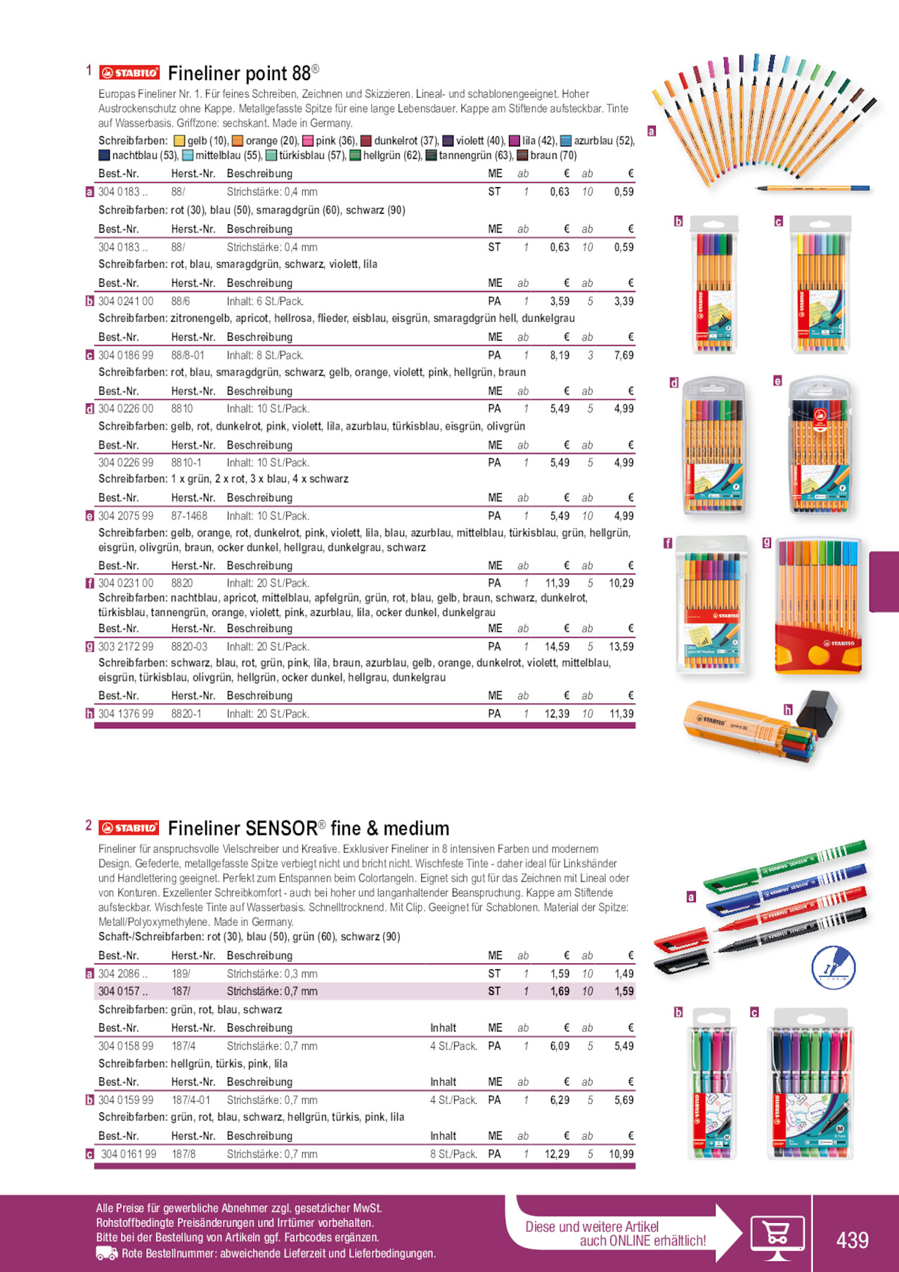 1 Fineliner point 88® Europas Fineliner Nr. 1. Für feines Schreiben, Zeichnen und Skizzieren. Lineal- und schablonengeeignet. Hoher Austrockenschutz ohne Kappe. Metallgefasste Spitze für eine lange Lebensdauer. Kappe am Stiftende aufsteckbar. Tinte auf Wasserbasis. Griffzone: sechskant. Made in Germany. Schreibfarben: gelb (10), orange (20), pink (36), dunkelrot (37), violett (40), lila (42), azurblau (52), nachtblau (53), mittelblau (55), türkisblau (57), hellgrün (62), tannengrün (63), braun (70) a Best.-Nr. Herst.-Nr. Beschreibung ME ab € ab € a 304 0183 .. 88/ Strichstärke: 0,4 mm ST 1 0,63 10 0,59 Schreibfarben: rot (30), blau (50), smaragdgrün (60), schwarz (90) Best.-Nr. Herst.-Nr. Beschreibung ME ab € ab € b 304 0183 .. 88/ Strichstärke: 0,4 mm ST 1 0,63 10 0,59 Schreibfarben: rot, blau, smaragdgrün, schwarz, violett, lila Best.-Nr. Herst.-Nr. Beschreibung ME ab € ab € b 304 0241 00 88/6 Inhalt: 6 St./Pack. PA 1 3,59 5 3,39 Schreibfarben: zitronengelb, apricot, hellrosa, flieder, eisblau, eisgrün, smaragdgrün hell, dunkelgrau Best.-Nr. Herst.-Nr. Beschreibung ME ab € ab € c 304 0186 99 88/8-01 Inhalt: 8 St./Pack. PA 1 8,19 3 7,69 Schreibfarben: rot, blau, smaragdgrün, schwarz, gelb, orange, violett, pink, hellgrün, braun Best.-Nr. Herst.-Nr. Beschreibung ME ab € ab € d d 304 0226 00 8810 Inhalt: 10 St./Pack. PA 1 5,49 5 4,99 Schreibfarben: gelb, rot, dunkelrot, pink, violett, lila, azurblau, türkisblau, eisgrün, olivgrün Best.-Nr. Herst.-Nr. Beschreibung ME ab € ab € 304 0226 99 8810-1 Inhalt: 10 St./Pack. PA 1 5,49 5 4,99 Schreibfarben: 1 x grün, 2 x rot, 3 x blau, 4 x schwarz Best.-Nr. Herst.-Nr. Beschreibung ME ab € ab € e 304 2075 99 87-1468 Inhalt: 10 St./Pack. PA 1 5,49 10 4,99 Schreibfarben: gelb, orange, rot, dunkelrot, pink, violett, lila, blau, azurblau, mittelblau, türkisblau, grün, hellgrün, eisgrün, olivgrün, braun, ocker dunkel, hellgrau, dunkelgrau, schwarz f Best.-Nr. Herst.-Nr. Beschreibung ME ab € ab € f 304 0231 00 8820 Inhalt: 20 St./Pack. PA 1 11,39 5 10,29 Schreibfarben: nachtblau, apricot, mittelblau, apfelgrün, grün, rot, blau, gelb, braun, schwarz, dunkelrot, türkisblau, tannengrün, orange, violett, pink, azurblau, lila, ocker dunkel, dunkelgrau Best.-Nr. Herst.-Nr. Beschreibung ME ab € ab € g 303 2172 99 8820-03 Inhalt: 20 St./Pack. PA 1 14,59 5 13,59 Schreibfarben: schwarz, blau, rot, grün, pink, lila, braun, azurblau, gelb, orange, dunkelrot, violett, mittelblau, eisgrün, türkisblau, olivgrün, hellgrün, ocker dunkel, hellgrau, dunkelgrau Best.-Nr. Herst.-Nr. Beschreibung ME ab € ab € h 304 1376 99 8820-1 Inhalt: 20 St./Pack. PA 1 12,39 10 11,39 c e g h 2 Fineliner SENSOR® fine & medium Fineliner für anspruchsvolle Vielschreiber und Kreative. Exklusiver Fineliner in 8 intensiven Farben und modernem Design. Gefederte, metallgefasste Spitze verbiegt nicht und bricht nicht. Wischfeste Tinte - daher ideal für Linkshänder und Handlettering geeignet. Perfekt zum Entspannen beim Colortangeln. Eignet sich gut für das Zeichnen mit Lineal oder von Konturen. Exzellenter Schreibkomfort - auch bei hoher und langanhaltender Beanspruchung. Kappe am Stiftende aufsteckbar. Wischfeste Tinte auf Wasserbasis. Schnelltrocknend. Mit Clip. Geeignet für Schablonen. Material der Spitze: Metall/Polyoxymethylene. Made in Germany. Schaft-/Schreibfarben: rot (30), blau (50), grün (60), schwarz (90) Best.-Nr. Herst.-Nr. Beschreibung ME ab € ab € a 304 2086 .. 189/ Strichstärke: 0,3 mm ST 1 1,59 10 1,49 304 0157 .. 187/ Strichstärke: 0,7 mm ST 1 1,69 10 1,59 Schreibfarben: grün, rot, blau, schwarz Best.-Nr. Herst.-Nr. Beschreibung Inhalt ME ab € ab € 304 0158 99 187/4 Strichstärke: 0,7 mm 4 St./Pack. PA 1 6,09 5 5,49 Schreibfarben: hellgrün, türkis, pink, lila Best.-Nr. Herst.-Nr. Beschreibung Inhalt ME ab € ab € b 304 0159 99 187/4-01 Strichstärke: 0,7 mm 4 St./Pack. PA 1 6,29 5 5,69 Schreibfarben: grün, rot, blau, schwarz, hellgrün, türkis, pink, lila Best.-Nr. Herst.-Nr. Beschreibung Inhalt ME ab € ab € c 304 0161 99 187/8 Strichstärke: 0,7 mm 8 St./Pack. PA 1 12,29 5 10,99 a b Alle Preise für gewerbliche Abnehmer zzgl. gesetzlicher MwSt. Rohstoffbedingte Preisänderungen und Irrtümer vorbehalten. Bitte bei der Bestellung von Artikeln ggf. Farbcodes ergänzen. Rote Bestellnummer: abweichende Lieferzeit und Lieferbedingungen. Diese und weitere Artikel auch ONLINE erhältlich! c 1#,1-0â2#!&,-*-%7 439 304207599 304016199 304022600 304018360 304018362 304137699 303217299 304018350 304015750 304018370 304018353 304015899 304018342 304023100 304022699 304208650 304018363 304018357 304018352 304024100 304208660 304015760 304015999 304015730 304018310 304018390 304018336 304018330 304018699 304208630 304015790 304018340 304018320 304018355 304018337 304208690