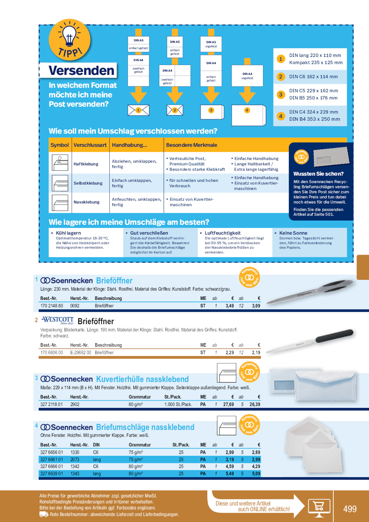 Versenden In welchem Format möchte ich meine Post versenden? DIN A5 einfach gefalzt DIN A4 zweifach gefalzt 1 DIN A5 einfach gefalzt DIN A4 zweifach gefalzt 2 DIN A5 ungefalzt DIN A4 einfach gefalzt 3 Wie soll mein Umschlag verschlossen werden? Symbol Verschlussart Handhabung... Besondere Merkmale DIN A4 ungefalzt 4 1 DIN lang 220 x 110 mm Kompakt 235 x 125 mm 2 DIN C6 162 x 114 mm 3 DIN C5 229 x 162 mm DIN B5 250 x 176 mm 4 DIN C4 324 x 229 mm DIN B4 353 x 250 mm Haftklebung Selbstklebung Nassklebung Abziehen, umklappen, fertig Einfach umklappen, fertig ▸ Vertrauliche Post, Premium Qualität ▸ Besonders starke Klebkraft ▸ für schnellen und hohen Verbrauch ▸ Einfache Handhabung ▸ Lange Haltbarkeit / Extra lange lagerfähig ▸ Einfache Handhabung ▸ Einsatz von Kuvertier- maschinen Anfeuchten, umklappen, ▸ Einsatz von Kuvertier- fertig ▸ maschinen Wie lagere ich meine Umschläge am besten? Wussten Sie schon? Mit den Soennecken Recycling Briefumschlägen versenden Sie Ihre Post sicher zum kleinen Preis und tun dabei noch etwas für die Umwelt. Finden Sie die passenden Artikel auf Seite 501. ▸ Kühl lagern Optimalthemperatur 18-20 °C, die Nähe von Heizkörpern oder Heizungsrohren vermeiden. ▸ Gut verschließen Staub auf dem Klebstoff verringert die Klebefähigkeit. Bewahren Sie deshalb die Briefumschläge möglichst im Karton auf. ▸ Luftfeuchtigkeit Die optimale Luftfeuchtigkeit liegt bei 50-55 %, um ein Verblocken der Nassklebebriefhüllen zu vermeiden. ▸ Keine Sonne Sonnen bzw. Tageslicht vermeiden, führt zu Farbveränderung des Papiers. 1 Brieföffner Länge: 230 mm. Material der Klinge: Stahl. Rostfrei. Material des Griffes: Kunststoff. Farbe: schwarz/grau. Best.-Nr. Herst.-Nr. Beschreibung 170 2148 80 0092 Brieföffner ME ab € ab ST 1 3,49 12 € 3,09 2 Brieföffner Verpackung: Blisterkarte. Länge: 190 mm. Material der Klinge: Stahl. Rostfrei. Material des Griffes: Kunststoff. Farbe: schwarz. Best.-Nr. Herst.-Nr. Beschreibung 170 6606 00 E-29692 00 Brieföffner ME ab € ab ST 1 2,29 12 € 2,19 3 Kuvertierhülle nassklebend Maße: 229 x 114 mm (B x H). Mit Fenster. Holzfrei. Mit gummierter Klappe. Seitenklappe außenliegend. Farbe: weiß. Best.-Nr. Herst.-Nr. 327 2118 01 2902 Grammatur 80 g/m² St./Pack. ME ab € ab € 1.000 St./Pack. PA 1 27,69 5 26,39 4 Briefumschläge nassklebend Ohne Fenster. Holzfrei. Mit gummierter Klappe. Farbe: weiß. Best.-Nr. 327 6656 01 327 6661 01 327 6666 01 327 6639 01 Herst.-Nr. 1330 2073 1342 1343 DIN C6 lang C6 lang Grammatur 75 g/m² 75 g/m² 80 g/m² 80 g/m² St./Pack. 25 25 25 25 ME ab PA 1 PA 1 PA 1 PA 1 € ab 2,99 5 3,19 5 4,59 5 5,49 5 € 2,89 2,99 4,29 5,09 Alle Preise für gewerbliche Abnehmer zzgl. gesetzlicher MwSt. Rohstoffbedingte Preisänderungen und Irrtümer vorbehalten. Bitte bei der Bestellung von Artikeln ggf. Farbcodes ergänzen. Rote Bestellnummer: abweichende Lieferzeit und Lieferbedingungen. Diese und weitere Artikel auch ONLINE erhältlich! 499 327665601 327211801 170214880 327666601 327663901 327666101 170660600