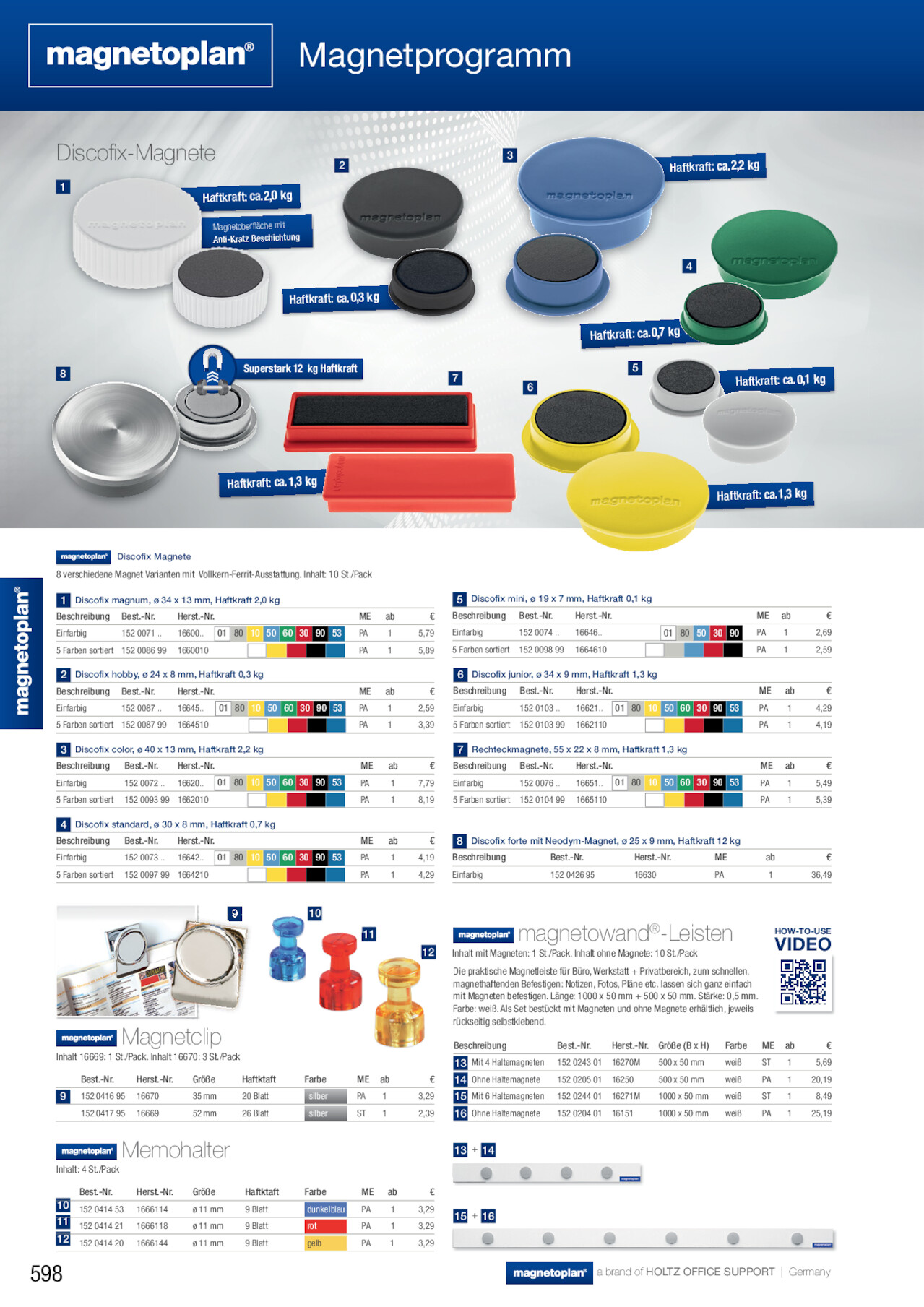 Magnetprogramm Discofix-Magnete 1 Haftkraft: ca.2,0 kg Magnetoberfläche mit Anti-Kratz Beschichtung 2 Haftkraft: ca.0,3 kg 8 Superstark 12 kg Haftkraft 3 Haftkraft: ca.2,2 kg 4 Haftkraft: ca.0,7 kg 5 7 6 Haftkraft: ca.0,1 kg Haftkraft: ca.1,3 kg Haftkraft: ca.1,3 kg Discofix Magnete 8 verschiedene Magnet Varianten mit Vollkern-Ferrit-Ausstattung. Inhalt: 10 St./Pack 1 Discofix magnum, ø 34 x 13 mm, Haftkraft 2,0 kg Beschreibung Best.-Nr. Herst.-Nr. Einfarbig 152 0071 .. 16600.. 01 80 10 50 60 30 90 53 5 Farben sortiert 152 0086 99 1660010 ME ab PA 1 PA 1 2 Discofix hobby, ø 24 x 8 mm, Haftkraft 0,3 kg Beschreibung Best.-Nr. Herst.-Nr. Einfarbig 152 0087 .. 16645.. 01 80 10 50 60 30 90 53 5 Farben sortiert 152 0087 99 1664510 ME ab PA 1 PA 1 3 Discofix color, ø 40 x 13 mm, Haftkraft 2,2 kg Beschreibung Best.-Nr. Herst.-Nr. Einfarbig 152 0072 .. 16620.. 01 80 10 50 60 30 90 53 5 Farben sortiert 152 0093 99 1662010 ME ab PA 1 PA 1 4 Discofix standard, ø 30 x 8 mm, Haftkraft 0,7 kg Beschreibung Best.-Nr. Herst.-Nr. Einfarbig 152 0073 .. 16642.. 01 80 10 50 60 30 90 53 5 Farben sortiert 152 0097 99 1664210 ME ab PA 1 PA 1 5 Discofix mini, ø 19 x 7 mm, Haftkraft 0,1 kg € Beschreibung Best.-Nr. Herst.-Nr. ME ab 5,79 Einfarbig 152 0074 .. 16646.. 01 80 50 30 90 PA 1 5,89 5 Farben sortiert 152 0098 99 1664610 PA 1 6 Discofix junior, ø 34 x 9 mm, Haftkraft 1,3 kg € Beschreibung Best.-Nr. Herst.-Nr. ME ab 2,59 Einfarbig 152 0103 .. 16621.. 01 80 10 50 60 30 90 53 PA 1 3,39 5 Farben sortiert 152 0103 99 1662110 PA 1 7 Rechteckmagnete, 55 x 22 x 8 mm, Haftkraft 1,3 kg € Beschreibung Best.-Nr. Herst.-Nr. 7,79 Einfarbig 152 0076 .. 16651.. 01 80 10 50 60 30 90 53 8,19 5 Farben sortiert 152 0104 99 1665110 ME ab PA 1 PA 1 € 2,69 2,59 € 4,29 4,19 € 5,49 5,39 € 8 Discofix forte mit Neodym-Magnet, ø 25 x 9 mm, Haftkraft 12 kg 4,19 Beschreibung Best.-Nr. Herst.-Nr. ME 4,29 Einfarbig 152 0426 95 16630 PA ab 1 € 36,49 9 Magnetclip Inhalt 16669: 1 St./Pack. Inhalt 16670: 3 St./Pack Best.-Nr. Herst.-Nr. 9 152 0416 95 16670 152 0417 95 16669 Größe 35 mm 52 mm Haftktaft 20 Blatt 26 Blatt Memohalter Inhalt: 4 St./Pack Best.-Nr. 10 152 0414 53 11 152 0414 21 12 152 0414 20 Herst.-Nr. 1666114 1666118 1666144 Größe ø 11 mm ø 11 mm ø 11 mm Haftktaft 9 Blatt 9 Blatt 9 Blatt 598 10 Farbe silber silber 11 ME ab PA 1 ST 1 magnetowand®-Leisten 12 Inhalt mit Magneten: 1 St./Pack. Inhalt ohne Magnete: 10 St./Pack VIDEOHOW-TO-USE Die praktische Magnetleiste für Büro, Werkstatt + Privatbereich, zum schnellen, magnethaftenden Befestigen: Notizen, Fotos, Pläne etc. lassen sich ganz einfach mit Magneten befestigen. Länge: 1000 x 50 mm + 500 x 50 mm. Stärke: 0,5 mm. Farbe: weiß. Als Set bestückt mit Magneten und ohne Magnete erhältlich, jeweils rückseitig selbstklebend. Beschreibung Best.-Nr. Herst.-Nr. Größe (B x H) Farbe ME ab € 13 Mit 4 Haltemagneten 152 0243 01 16270M 500 x 50 mm weiß ST 1 5,69 € 14 Ohne Haltemagnete 152 0205 01 16250 500 x 50 mm weiß PA 1 20,19 3,29 15 Mit 6 Haltemagneten 152 0244 01 16271M 1000 x 50 mm weiß ST 1 8,49 2,39 16 Ohne Haltemagnete 152 0204 01 16151 1000 x 50 mm weiß PA 1 25,19 13 + 14 Farbe ME ab € dunkelblau rot PA PA 1 1 3,29 15 + 16 3,29 gelb PA 1 3,29 a brand of HOLTZ OFFICE SUPPORT | Germany 152007301 152007153 152041453 152010301 152041421 152007390 152010499 152010353 152008760 152009799 152007290 152010350 152008753 152010330 152008730 152007150 152007480 152007630 152041695 152010380 152007280 152007653 152007401 152007253 152007380 152007353 152007350 152024401 152007680 152008780 152020401 152007101 152007160 152007250 152007450 152024301 152007660 152007210 152007330 152007180 152007201 152041795 152020501 152010310 152007110 152007130 152008790 152008710 152007690 152008701 152007601 152007490 152007310 152007260 152010390 152007610 152007360 152009899 152042695 152007430 152007230 152010360 152041420 152007650 152008699 152008750 152010399 152008799 152007190