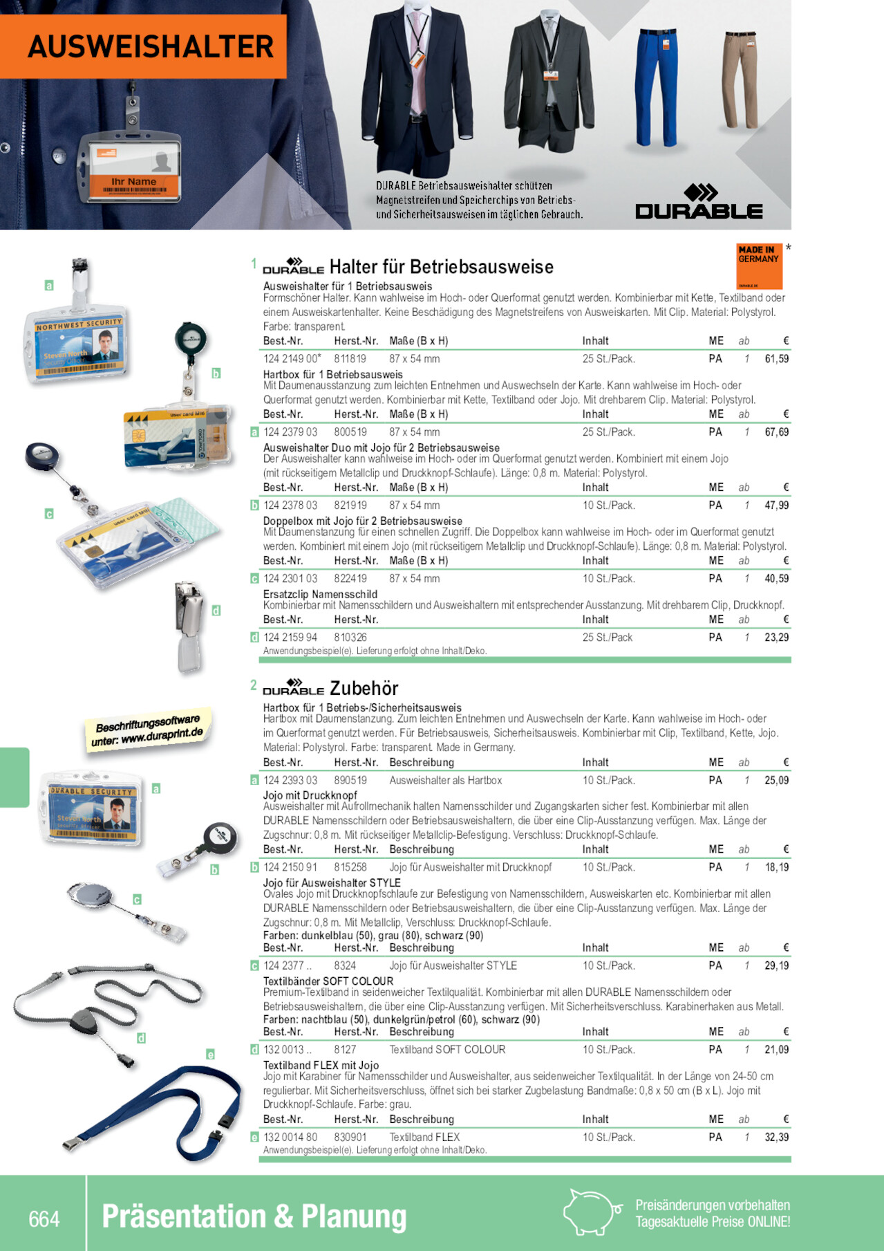 AUSWEISHALTER DURABLE Betriebsausweishalter schützen Magnetstreifen und Speicherchips von Betriebsund Sicherheitsausweisen im täglichen Gebrauch. 1 Halter für Betriebsausweise * a Ausweishalter für 1 Betriebsausweis Formschöner Halter. Kann wahlweise im Hoch- oder Querformat genutzt werden. Kombinierbar mit Kette, Textilband oder einem Ausweiskartenhalter. Keine Beschädigung des Magnetstreifens von Ausweiskarten. Mit Clip. Material: Polystyrol. Farbe: transparent. Best.-Nr. Herst.-Nr. Maße (B x H) Inhalt ME ab € 124 2149 00* 811819 87 x 54 mm 25 St./Pack. PA 1 61,59 b Hartbox für 1 Betriebsausweis Mit Daumenausstanzung zum leichten Entnehmen und Auswechseln der Karte. Kann wahlweise im Hoch- oder Querformat genutzt werden. Kombinierbar mit Kette, Textilband oder Jojo. Mit drehbarem Clip. Material: Polystyrol. Best.-Nr. Herst.-Nr. Maße (B x H) Inhalt ME ab € a 124 2379 03 800519 87 x 54 mm 25 St./Pack. PA 1 Ausweishalter Duo mit Jojo für 2 Betriebsausweise Der Ausweishalter kann wahlweise im Hoch- oder im Querformat genutzt werden. Kombiniert mit einem Jojo (mit rückseitigem Metallclip und Druckknopf-Schlaufe). Länge: 0,8 m. Material: Polystyrol. Best.-Nr. Herst.-Nr. Maße (B x H) Inhalt ME ab 67,69 € c b 124 2378 03 821919 87 x 54 mm Doppelbox mit Jojo für 2 Betriebsausweise 10 St./Pack. PA 1 47,99 Mit Daumenstanzung für einen schnellen Zugriff. Die Doppelbox kann wahlweise im Hoch- oder im Querformat genutzt werden. Kombiniert mit einem Jojo (mit rückseitigem Metallclip und Druckknopf-Schlaufe). Länge: 0,8 m. Material: Polystyrol. Best.-Nr. Herst.-Nr. Maße (B x H) Inhalt ME ab € c 124 2301 03 822419 87 x 54 mm 10 St./Pack. PA 1 40,59 Ersatzclip Namensschild d Kombinierbar mit Namensschildern und Ausweishaltern mit entsprechender Ausstanzung. Mit drehbarem Clip, Druckknopf. Best.-Nr. Herst.-Nr. Inhalt ME ab € d 124 2159 94 810326 Anwendungsbeispiel(e). Lieferung erfolgt ohne Inhalt/Deko. 25 St./Pack PA 1 23,29 uBnetesrc: hwriwftwun.dgusrsaopfrtiwnat.rdee a b c d e 2 Zubehör Hartbox für 1 Betriebs-/Sicherheitsausweis Hartbox mit Daumenstanzung. Zum leichten Entnehmen und Auswechseln der Karte. Kann wahlweise im Hoch- oder im Querformat genutzt werden. Für Betriebsausweis, Sicherheitsausweis. Kombinierbar mit Clip, Textilband, Kette, Jojo. Material: Polystyrol. Farbe: transparent. Made in Germany. Best.-Nr. Herst.-Nr. Beschreibung Inhalt ME ab € a 124 2393 03 890519 Ausweishalter als Hartbox 10 St./Pack. PA 1 25,09 Jojo mit Druckknopf Ausweishalter mit Aufrollmechanik halten Namensschilder und Zugangskarten sicher fest. Kombinierbar mit allen DURABLE Namensschildern oder Betriebsausweishaltern, die über eine Clip-Ausstanzung verfügen. Max. Länge der Zugschnur: 0,8 m. Mit rückseitiger Metallclip-Befestigung. Verschluss: Druckknopf-Schlaufe. Best.-Nr. Herst.-Nr. Beschreibung Inhalt ME ab € b 124 2150 91 815258 Jojo für Ausweishalter mit Druckknopf 10 St./Pack. PA 1 18,19 Jojo für Ausweishalter STYLE Ovales Jojo mit Druckknopfschlaufe zur Befestigung von Namensschildern, Ausweiskarten etc. Kombinierbar mit allen DURABLE Namensschildern oder Betriebsausweishaltern, die über eine Clip-Ausstanzung verfügen. Max. Länge der Zugschnur: 0,8 m. Mit Metallclip, Verschluss: Druckknopf-Schlaufe. Farben: dunkelblau (50), grau (80), schwarz (90) Best.-Nr. Herst.-Nr. Beschreibung Inhalt ME ab € c 124 2377 .. 8324 Jojo für Ausweishalter STYLE 10 St./Pack. PA 1 29,19 Textilbänder SOFT COLOUR Premium-Textilband in seidenweicher Textilqualität. Kombinierbar mit allen DURABLE Namensschildern oder Betriebsausweishaltern, die über eine Clip-Ausstanzung verfügen. Mit Sicherheitsverschluss. Karabinerhaken aus Metall. Farben: nachtblau (50), dunkelgrün/petrol (60), schwarz (90) Best.-Nr. Herst.-Nr. Beschreibung Inhalt ME ab € d 132 0013 .. 8127 Textilband SOFT COLOUR 10 St./Pack. PA 1 21,09 Textilband FLEX mit Jojo Jojo mit Karabiner für Namensschilder und Ausweishalter, aus seidenweicher Textilqualität. In der Länge von 24-50 cm regulierbar. Mit Sicherheitsverschluss, öffnet sich bei starker Zugbelastung Bandmaße: 0,8 x 50 cm (B x L). Jojo mit Druckknopf-Schlaufe. Farbe: grau. Best.-Nr. Herst.-Nr. Beschreibung Inhalt ME ab € e 132 0014 80 830901 Textilband FLEX Anwendungsbeispiel(e). Lieferung erfolgt ohne Inhalt/Deko. 10 St./Pack. PA 1 32,39 664 Präsentation & Planung Preisänderungen vorbehalten Tagesaktuelle Preise ONLINE! 132001360 124237780 124237790 124237903 132001480 124215994 132001350 124215091 132001390 124237803 124237750 124214900 124230103 124239303