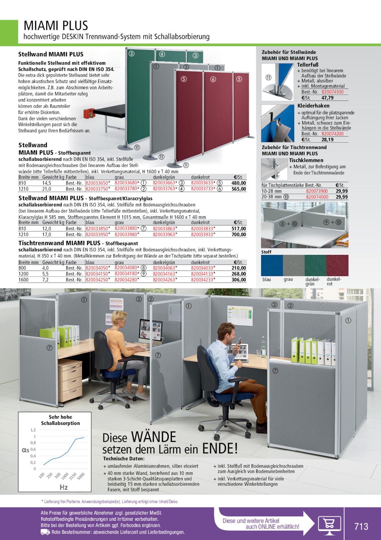 MIAMI PLUS hochwertige DESKIN Trennwand-System mit Schallabsorbierung Stellwand MIAMI PLUS Funktionelle Stellwand mit effektivem Schallschutz, geprüft nach DIN EN ISO 354. Die extra dick gepolsterte Stellwand bietet sehr hohen akustischen Schutz und vielfältige Einsatzmöglichkeiten. Z.B. zum Abschirmen von Arbeitsplätzen, damit die Mitarbeiter ruhig und konzentriert arbeiten können oder als Raumteiler für erhöhte Diskretion. Dank der vielen verschiedenen Winkelstellungen passt sich die Stellwand ganz Ihren Bedürfnissen an. ቤ ብ ቢ ቤ ባ ቦ ቢ ቧ ቦ ቦ Stellwand MIAMI PLUS - Stoffbespannt ቭ schallabsorbierend nach DIN EN ISO 354, inkl. Stellfüße ቭ mit Bodenausgleichsschrauben (bei linearem Aufbau der Stell- ቭ wände bitte Tellerfüße mitbestellen), inkl. Verkettungsmaterial, H 1600 x T 40 mm Breite mm Gewicht kg Farbe blau grau dunkelgrün dunkelrot 810 14,5 Best.-Nr. 820033650* 820033680* ቢ 820033663* ቤ 820033633* ቦ 1210 21,0 Best.-Nr. 820033750* 820033780* ባ 820033763* ብ 820033733* ቧ €/St. 480,00 565,00 Stellwand MIAMI PLUS - Stoffbespannt/Klaracrylglas schallabsorbierend nach DIN EN ISO 354, inkl. Stellfüße mit Bodenausgleichsschrauben (bei linearem Aufbau der Stellwände bitte Tellerfüße mitbestellen), inkl. Verkettungsmaterial, Klaracrylglas H 585 mm, Stoffbespanntes Element H 1015 mm, Gesamtmaße H 1600 x T 40 mm Breite mm Gewicht kg Farbe blau grau dunkelgrün dunkelrot 810 12,0 Best.-Nr. 820033850* 820033880* ቨ 820033863* 820033833* 1210 17,0 Best.-Nr. 820033950* 820033980* 820033963* 820033933* €/St. 517,00 700,00 Tischtrennwand MIAMI PLUS - Stoffbespannt schallabsorbierend nach DIN EN ISO 354, inkl. Stellfüße mit Bodenausgleichsschrauben, inkl. Verkettungs- material, H 350 x T 40 mm. (Metallklemmen zur Befestigung der Wände an der Tischplatte bitte separat bestellen.) Breite mm Gewicht kg Farbe blau grau dunkelgrün dunkelrot €/St. 800 4,0 Best.-Nr. 820034050* 820034080* ቩ 820034063* 820034033* 210,00 1200 5,5 Best.-Nr. 820034150* 820034180* ቪ 820034163* 820034133* 268,00 1600 7,2 Best.-Nr. 820034250* 820034280* 820034263* 820034233* 306,00 ቢ ባባ ቢ Zubehör für Stellwände MIAMI UND MIAMI PLUS Tellerfuß + benötigt bei linearem ቭ Aufbau der Stellwände + Metall, alusilber + inkl. Montagematerial Best.-Nr. 820074100 €/St. 47,79 Kleiderhaken + optimal für die platzsparende Aufhängung Ihrer Jacken + Metall, schwarz zum Einhängen in die Stellwände Best.-Nr. 820074200 €/St. 28,19 Zubehör für Tischtrennwand MIAMI UND MIAMI PLUS Tischklemmen + Metall, zur Befestigung am Ende der Tischtrennwände für Tischplattenstärke Best.-Nr. 10-28 mm 820073900 20-38 mm ቫ 820074000 €/St. 29,99 29,99 ቩ+ቫ ቪ+ቫ Stoff blau grau dunkel- dunkelgrün rot ባባ ቢ ቨ ቨ ቨ Sehr hohe Schallabsorption Diese WÄNDE setzen dem Lärm ein ENDE! Technische Daten: + umlaufender Aluminiumrahmen, silber eloxiert + 40 mm starke Wand, bestehend aus 10 mm starken 3-Schicht-Qualitätsspanplatten und beidseitig 15 mm starken schallabsorbierenden Fasern, mit Stoff bespannt + inkl. Stellfuß mit Bodenausgleichsschrauben zum Ausgleich von Bodenunebenheiten + inkl. Verkettungsmaterial für viele verschiedene Winkelstellungen * Lieferung frei Parterre. Anwendungsbeispiel(e). Lieferung erfolgt ohne Inhalt/Deko. Alle Preise für gewerbliche Abnehmer zzgl. gesetzlicher MwSt. Rohstoffbedingte Preisänderungen und Irrtümer vorbehalten. Bitte bei der Bestellung von Artikeln ggf. Farbcodes ergänzen. Rote Bestellnummer: abweichende Lieferzeit und Lieferbedingungen. Diese und weitere Artikel auch ONLINE erhältlich! 713 820033933 820034080 820033763 820033880 820033663 820033963 820033950 820073900 820034033 820033850 820033863 820034263 820034150 820034180 820033750 820033650 820034233 820034280 820033733 820074200 820033780 820034163 820034050 820074100 820034063 820074000 820034250 820033633 820033833 820033980 820034133 820033680