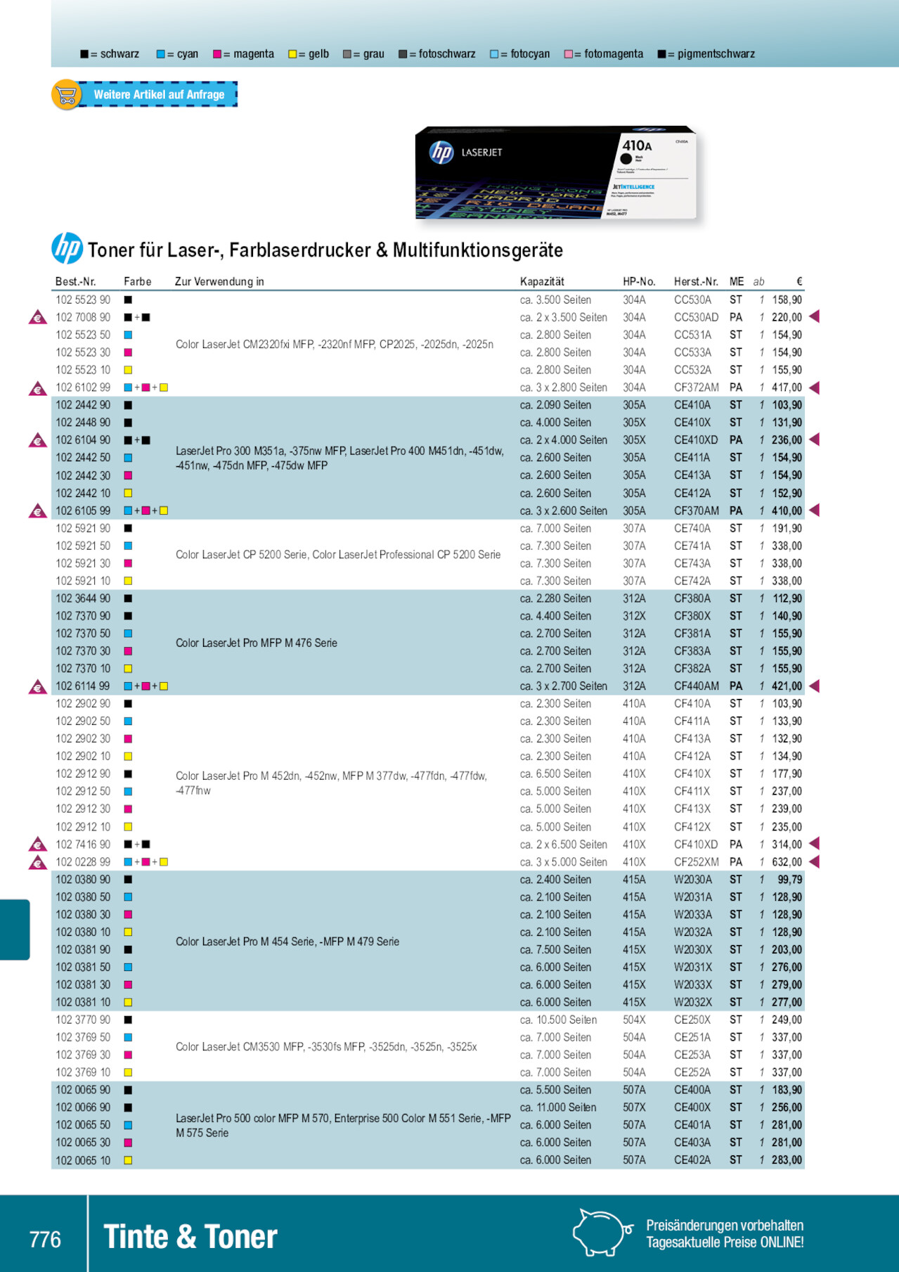 = schwarz = cyan = magenta = gelb = grau = fotoschwarz = fotocyan = fotomagenta = pigmentschwarz Weitere Artikel auf Anfrage Toner für Laser-, Farblaserdrucker & Multifunktionsgeräte Best.-Nr. 102 5523 90 102 7008 90 102 5523 50 102 5523 30 102 5523 10 102 6102 99 102 2442 90 102 2448 90 102 6104 90 102 2442 50 102 2442 30 102 2442 10 102 6105 99 102 5921 90 102 5921 50 102 5921 30 102 5921 10 102 3644 90 102 7370 90 102 7370 50 102 7370 30 102 7370 10 102 6114 99 102 2902 90 102 2902 50 102 2902 30 102 2902 10 102 2912 90 102 2912 50 102 2912 30 102 2912 10 102 7416 90 102 0228 99 102 0380 90 102 0380 50 102 0380 30 102 0380 10 102 0381 90 102 0381 50 102 0381 30 102 0381 10 102 3770 90 102 3769 50 102 3769 30 102 3769 10 102 0065 90 102 0066 90 102 0065 50 102 0065 30 102 0065 10 Farbe + ++ + ++ ++ + ++ Zur Verwendung in Kapazität ca. 3.500 Seiten ca. 2 x 3.500 Seiten Color LaserJet CM2320fxi MFP, -2320nf MFP, CP2025, -2025dn, -2025n ca. 2.800 Seiten ca. 2.800 Seiten ca. 2.800 Seiten ca. 3 x 2.800 Seiten ca. 2.090 Seiten ca. 4.000 Seiten LaserJet Pro 300 M351a, -375nw MFP, LaserJet Pro 400 M451dn, -451dw, -451nw, -475dn MFP, -475dw MFP ca. 2 x 4.000 Seiten ca. 2.600 Seiten ca. 2.600 Seiten ca. 2.600 Seiten ca. 3 x 2.600 Seiten ca. 7.000 Seiten Color LaserJet CP 5200 Serie, Color LaserJet Professional CP 5200 Serie ca. 7.300 Seiten ca. 7.300 Seiten ca. 7.300 Seiten ca. 2.280 Seiten ca. 4.400 Seiten Color LaserJet Pro MFP M 476 Serie ca. 2.700 Seiten ca. 2.700 Seiten ca. 2.700 Seiten ca. 3 x 2.700 Seiten ca. 2.300 Seiten ca. 2.300 Seiten ca. 2.300 Seiten ca. 2.300 Seiten Color LaserJet Pro M 452dn, -452nw, MFP M 377dw, -477fdn, -477fdw, -477fnw ca. 6.500 Seiten ca. 5.000 Seiten ca. 5.000 Seiten ca. 5.000 Seiten ca. 2 x 6.500 Seiten ca. 3 x 5.000 Seiten ca. 2.400 Seiten ca. 2.100 Seiten ca. 2.100 Seiten Color LaserJet Pro M 454 Serie, -MFP M 479 Serie ca. 2.100 Seiten ca. 7.500 Seiten ca. 6.000 Seiten ca. 6.000 Seiten ca. 6.000 Seiten ca. 10.500 Seiten Color LaserJet CM3530 MFP, -3530fs MFP, -3525dn, -3525n, -3525x ca. 7.000 Seiten ca. 7.000 Seiten ca. 7.000 Seiten ca. 5.500 Seiten ca. 11.000 Seiten LaserJet Pro 500 color MFP M 570, Enterprise 500 Color M 551 Serie, -MFP M 575 Serie ca. 6.000 Seiten ca. 6.000 Seiten ca. 6.000 Seiten HP-No. 304A 304A 304A 304A 304A 304A 305A 305X 305X 305A 305A 305A 305A 307A 307A 307A 307A 312A 312X 312A 312A 312A 312A 410A 410A 410A 410A 410X 410X 410X 410X 410X 410X 415A 415A 415A 415A 415X 415X 415X 415X 504X 504A 504A 504A 507A 507X 507A 507A 507A Herst.-Nr. CC530A CC530AD CC531A CC533A CC532A CF372AM CE410A CE410X CE410XD CE411A CE413A CE412A CF370AM CE740A CE741A CE743A CE742A CF380A CF380X CF381A CF383A CF382A CF440AM CF410A CF411A CF413A CF412A CF410X CF411X CF413X CF412X CF410XD CF252XM W2030A W2031A W2033A W2032A W2030X W2031X W2033X W2032X CE250X CE251A CE253A CE252A CE400A CE400X CE401A CE403A CE402A ME ab € ST 1 158,90 PA 1 220,00 ST 1 154,90 ST 1 154,90 ST 1 155,90 PA 1 417,00 ST 1 103,90 ST 1 131,90 PA 1 236,00 ST 1 154,90 ST 1 154,90 ST 1 152,90 PA 1 410,00 ST 1 191,90 ST 1 338,00 ST 1 338,00 ST 1 338,00 ST 1 112,90 ST 1 140,90 ST 1 155,90 ST 1 155,90 ST 1 155,90 PA 1 421,00 ST 1 103,90 ST 1 133,90 ST 1 132,90 ST 1 134,90 ST 1 177,90 ST 1 237,00 ST 1 239,00 ST 1 235,00 PA 1 314,00 PA 1 632,00 ST 1 99,79 ST 1 128,90 ST 1 128,90 ST 1 128,90 ST 1 203,00 ST 1 276,00 ST 1 279,00 ST 1 277,00 ST 1 249,00 ST 1 337,00 ST 1 337,00 ST 1 337,00 ST 1 183,90 ST 1 256,00 ST 1 281,00 ST 1 281,00 ST 1 283,00 776 Tinte & Toner Preisänderungen vorbehalten Tagesaktuelle Preise ONLINE! 102610299 102290290 102737030 102006690 102244890 102737050 102376910 102552350 102700890 102377090 102364490 102592130 102038050 102610490 102038090 102022899 102291210 102290210 102038150 102244250 102291250 102038130 102038190 102038010 102244290 102244210 102006590 102291290 102006530 102737010 102006510 102611499 102737090 102552390 102290250 102038030 102291230 102552330 102006550 102592190 102290230 102244230 102376930 102038110 102592150 102592110 102741690 102376950 102610599 102552310