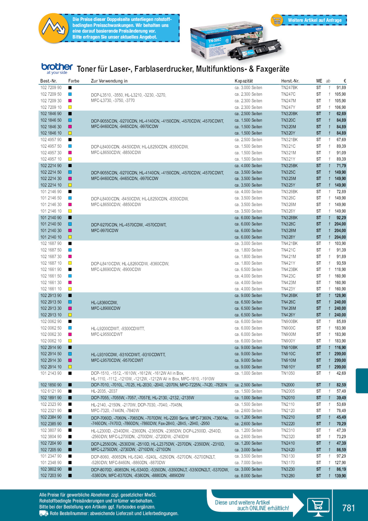 Die Preise dieser Doppelseite unterliegen rohstoffbedingten Preisschwankungen. Wir behalten uns eine darauf basierende Preisänderung vor. Bitte erfragen Sie unser aktuelles Angebot. Weitere Artikel auf Anfrage Toner für Laser-, Farblaserdrucker, Multifunktions- & Faxgeräte Best.-Nr. 102 7209 90 102 7209 50 102 7209 30 102 7209 10 102 1846 90 102 1846 50 102 1846 30 102 1846 10 102 4957 90 102 4957 50 102 4957 30 102 4957 10 102 2214 90 102 2214 50 102 2214 30 102 2214 10 101 2146 90 101 2146 50 101 2146 30 101 2146 10 101 2140 90 101 2140 50 101 2140 30 101 2140 10 102 1687 90 102 1687 50 102 1687 30 102 1687 10 102 1661 90 102 1661 50 102 1661 30 102 1661 10 102 2913 90 102 2913 50 102 2913 30 102 2913 10 102 0062 90 102 0062 50 102 0062 30 102 0062 10 102 2914 90 102 2914 50 102 2914 30 102 2914 10 101 2143 90 Farbe 102 1850 90 102 6121 90 102 1891 90 102 2323 90 102 2321 90 102 2384 90 102 2385 90 102 3807 90 102 3804 90 102 7204 90 102 7205 90 101 2347 90 101 2348 90 102 3802 90 102 7203 90 Zur Verwendung in DCP-L3510, -3550, HL-L3210, -3230, -3270, MFC-L3730, -3750, -3770 DCP-9055CDN, -9270CDN, HL-4140CN, -4150CDN, -4570CDW, -4570CDWT, MFC-9460CDN, -9465CDN, -9970CDW DCP-L8400CDN, -8450CDW, HL-L8250CDN, -8350CDW, MFC-L8650CDW, -8850CDW DCP-9055CDN, -9270CDN, HL-4140CN, -4150CDN, -4570CDW, -4570CDWT, MFC-9460CDN, -9465CDN, -9970CDW DCP-L8400CDN, -8450CDW, HL-L8250CDN, -8350CDW, MFC-L8650CDW, -8850CDW DCP-9270CDN, HL-4570CDW, -4570CDWT, MFC-9970CDW DCP-L8410CDW, HL-L8260CDW, -8360CDW, MFC-L8690CDW, -8900CDW HL-L8360CDW, MFC-L8900CDW HL-L9200CDWT, -9300CDWTT, MFC-L9550CDWT HL-L9310CDW, -9310CDWT, -9310CDWTT, MFC-L9570CDW, -9570CDWT DCP-1510, -1512, -1610W, -1612W, -1612W All in Box, HL-1110, -1112, -1210W, -1212W, -1212W All in Box, MFC-1810, -1910W DCP-7010, -7010L, -7025, HL-2030, -2040, -2070N, MFC-7225N, -7420, -7820N HL-2035, -2037 DCP-7055, -7055W, -7057, -7057E, HL-2130, -2132, -2135W HL-2140, -2150N, -2170W, DCP-7030, -7040, -7045N, MFC-7320, -7440N, -7840W DCP-7060D, -7060N, -7065DN, -7070DW, HL-2200 Serie, MFC-7360N, -7360Ne, -7460DN, -7470D, -7860DN, -7860DW, Fax-2840, -2845, -2940, -2950 HL-L2300D, -2340DW, -2360DN, -2365DN, -2365DW, DCP-L2500D, -2540D, -2560DW, MFC-L2700DN, -2700DW, -2720DW, -2740DW DCP-L2550DN, -2530DW, -2510D, HL-L2375DW, -2370DN, -2350DW, -2310D, MFC-L2750DW, -2730DW, -2710DW, -2710DN DCP-8060, -8065DN, HL-5240, -5240L, -5250DN, -5270DN, -5270DN2LT, -5280DW, MFC-8460N, -8860DN, -8870DW DCP-8070D, -8085DN, HL-5340D, -5350DN, -5350DNLT, -5350DN2LT, -5370DW, -5380DN, MFC-8370DN, -8380DN, -8880DN, -8890DW Kapazität ca. 3.000 Seiten ca. 2.300 Seiten ca. 2.300 Seiten ca. 2.300 Seiten ca. 2.500 Seiten ca. 1.500 Seiten ca. 1.500 Seiten ca. 1.500 Seiten ca. 2.500 Seiten ca. 1.500 Seiten ca. 1.500 Seiten ca. 1.500 Seiten ca. 4.000 Seiten ca. 3.500 Seiten ca. 3.500 Seiten ca. 3.500 Seiten ca. 4.000 Seiten ca. 3.500 Seiten ca. 3.500 Seiten ca. 3.500 Seiten ca. 6.000 Seiten ca. 6.000 Seiten ca. 6.000 Seiten ca. 6.000 Seiten ca. 3.000 Seiten ca. 1.800 Seiten ca. 1.800 Seiten ca. 1.800 Seiten ca. 6.500 Seiten ca. 4.000 Seiten ca. 4.000 Seiten ca. 4.000 Seiten ca. 9.000 Seiten ca. 6.500 Seiten ca. 6.500 Seiten ca. 6.500 Seiten ca. 6.000 Seiten ca. 6.000 Seiten ca. 6.000 Seiten ca. 6.000 Seiten ca. 9.000 Seiten ca. 9.000 Seiten ca. 9.000 Seiten ca. 9.000 Seiten ca. 1.000 Seiten ca. 2.500 Seiten ca. 1.500 Seiten ca. 1.000 Seiten ca. 1.500 Seiten ca. 2.600 Seiten ca. 1.200 Seiten ca. 2.600 Seiten ca. 1.200 Seiten ca. 2.600 Seiten ca. 1.200 Seiten ca. 3.000 Seiten ca. 3.500 Seiten ca. 7.000 Seiten ca. 3.000 Seiten ca. 8.000 Seiten Herst.-Nr. TN247BK TN247C TN247M TN247Y TN320BK TN320C TN320M TN320Y TN321BK TN321C TN321M TN321Y TN325BK TN325C TN325M TN325Y TN326BK TN326C TN326M TN326Y TN328BK TN328C TN328M TN328Y TN421BK TN421C TN421M TN421Y TN423BK TN423C TN423M TN423Y TN426BK TN426C TN426M TN426Y TN900BK TN900C TN900M TN900Y TN910BK TN910C TN910M TN910Y TN1050 TN2000 TN2005 TN2010 TN2110 TN2120 TN2210 TN2220 TN2310 TN2320 TN2410 TN2420 TN3130 TN3170 TN3230 TN3280 Alle Preise für gewerbliche Abnehmer zzgl. gesetzlicher MwSt. Rohstoffbedingte Preisänderungen und Irrtümer vorbehalten. Bitte bei der Bestellung von Artikeln ggf. Farbcodes ergänzen. Rote Bestellnummer: abweichende Lieferzeit und Lieferbedingungen. Diese und weitere Artikel auch ONLINE erhältlich! ME ab € ST 1 91,89 ST 1 105,90 ST 1 105,90 ST 1 106,90 ST 1 62,69 ST 1 84,89 ST 1 84,89 ST 1 84,89 ST 1 67,69 ST 1 89,39 ST 1 91,09 ST 1 89,39 ST 1 71,79 ST 1 149,90 ST 1 149,90 ST 1 149,90 ST 1 72,89 ST 1 149,90 ST 1 149,90 ST 1 149,90 ST 1 92,29 ST 1 204,00 ST 1 204,00 ST 1 204,00 ST 1 103,90 ST 1 91,39 ST 1 91,89 ST 1 93,59 ST 1 118,90 ST 1 160,90 ST 1 160,90 ST 1 160,90 ST 1 128,90 ST 1 240,00 ST 1 240,00 ST 1 240,00 ST 1 85,89 ST 1 183,90 ST 1 183,90 ST 1 183,90 ST 1 116,90 ST 1 299,00 ST 1 299,00 ST 1 299,00 ST 1 42,69 ST 1 82,59 ST 1 57,49 ST 1 39,49 ST 1 53,69 ST 1 78,49 ST 1 45,49 ST 1 70,29 ST 1 47,39 ST 1 73,29 ST 1 47,39 ST 1 86,59 ST 1 97,29 ST 1 127,90 ST 1 86,19 ST 1 139,90 781 102380490 101214050 101234890 102291450 102291310 102185090 101214390 102184630 102166150 102221490 102238590 102232390 102291390 101214690 102720910 102168730 101214090 102168790 102720990 102291430 102291350 102184610 102291410 101234790 102184690 102380290 102291330 102232190 102166190 102006230 102720950 102495710 102168710 102720390 102380790 101214650 102720590 102495730 102221410 101214010 102221450 102184650 102495790 102221430 102006250 102291490 102720930 102006290 102006210 101214030 101214630 102168750 102166130 101214610 102612190 102189190 102166110 102720490 102495750 102238490