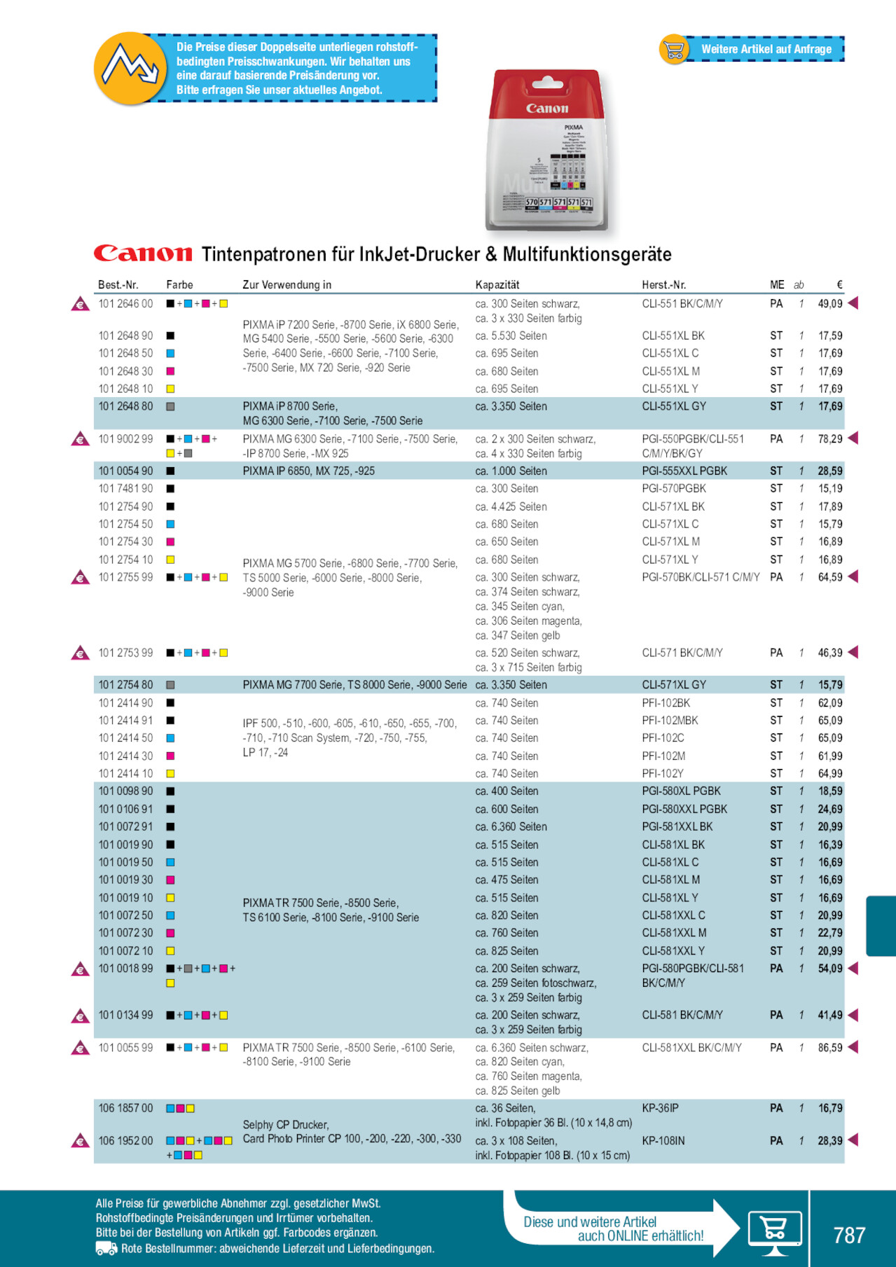 Die Preise dieser Doppelseite unterliegen rohstoffbedingten Preisschwankungen. Wir behalten uns eine darauf basierende Preisänderung vor. Bitte erfragen Sie unser aktuelles Angebot. Weitere Artikel auf Anfrage Tintenpatronen für InkJet-Drucker & Multifunktionsgeräte Best.-Nr. 101 2646 00 101 2648 90 101 2648 50 101 2648 30 101 2648 10 101 2648 80 101 9002 99 101 0054 90 101 7481 90 101 2754 90 101 2754 50 101 2754 30 101 2754 10 101 2755 99 101 2753 99 101 2754 80 101 2414 90 101 2414 91 101 2414 50 101 2414 30 101 2414 10 101 0098 90 101 0106 91 101 0072 91 101 0019 90 101 0019 50 101 0019 30 101 0019 10 101 0072 50 101 0072 30 101 0072 10 101 0018 99 101 0134 99 101 0055 99 106 1857 00 106 1952 00 Farbe +++ +++ + +++ +++ +++ +++ +++ + + Zur Verwendung in Kapazität Herst.-Nr. ME ab PIXMA iP 7200 Serie, -8700 Serie, iX 6800 Serie, MG 5400 Serie, -5500 Serie, -5600 Serie, -6300 Serie, -6400 Serie, -6600 Serie, -7100 Serie, -7500 Serie, MX 720 Serie, -920 Serie ca. 300 Seiten schwarz, ca. 3 x 330 Seiten farbig ca. 5.530 Seiten ca. 695 Seiten ca. 680 Seiten CLI-551 BK/C/M/Y CLI-551XL BK CLI-551XL C CLI-551XL M PA 1 ST 1 ST 1 ST 1 ca. 695 Seiten CLI-551XL Y ST 1 PIXMA iP 8700 Serie, MG 6300 Serie, -7100 Serie, -7500 Serie ca. 3.350 Seiten CLI-551XL GY ST 1 PIXMA MG 6300 Serie, -7100 Serie, -7500 Serie, ca. 2 x 300 Seiten schwarz, -IP 8700 Serie, -MX 925 ca. 4 x 330 Seiten farbig PGI-550PGBK/CLI-551 C/M/Y/BK/GY PA 1 PIXMA IP 6850, MX 725, -925 ca. 1.000 Seiten PGI-555XXL PGBK ST 1 ca. 300 Seiten PGI-570PGBK ST 1 ca. 4.425 Seiten CLI-571XL BK ST 1 ca. 680 Seiten CLI-571XL C ST 1 ca. 650 Seiten CLI-571XL M ST 1 PIXMA MG 5700 Serie, -6800 Serie, -7700 Serie, TS 5000 Serie, -6000 Serie, -8000 Serie, -9000 Serie ca. 680 Seiten ca. 300 Seiten schwarz, ca. 374 Seiten schwarz, ca. 345 Seiten cyan, ca. 306 Seiten magenta, ca. 347 Seiten gelb CLI-571XL Y ST 1 PGI-570BK/CLI-571 C/M/Y PA 1 ca. 520 Seiten schwarz, ca. 3 x 715 Seiten farbig CLI-571 BK/C/M/Y PA 1 PIXMA MG 7700 Serie, TS 8000 Serie, -9000 Serie ca. 3.350 Seiten CLI-571XL GY ST 1 ca. 740 Seiten PFI-102BK ST 1 IPF 500, -510, -600, -605, -610, -650, -655, -700, -710, -710 Scan System, -720, -750, -755, LP 17, -24 ca. 740 Seiten ca. 740 Seiten ca. 740 Seiten PFI-102MBK PFI-102C PFI-102M ST 1 ST 1 ST 1 ca. 740 Seiten PFI-102Y ST 1 ca. 400 Seiten PGI-580XL PGBK ST 1 ca. 600 Seiten PGI-580XXL PGBK ST 1 ca. 6.360 Seiten PGI-581XXL BK ST 1 ca. 515 Seiten CLI-581XL BK ST 1 ca. 515 Seiten CLI-581XL C ST 1 ca. 475 Seiten CLI-581XL M ST 1 PIXMA TR 7500 Serie, -8500 Serie, TS 6100 Serie, -8100 Serie, -9100 Serie ca. 515 Seiten ca. 820 Seiten ca. 760 Seiten CLI-581XL Y CLI-581XXL C CLI-581XXL M ST 1 ST 1 ST 1 ca. 825 Seiten CLI-581XXL Y ST 1 + ca. 200 Seiten schwarz, PGI-580PGBK/CLI-581 PA 1 ca. 259 Seiten fotoschwarz, BK/C/M/Y ca. 3 x 259 Seiten farbig ca. 200 Seiten schwarz, ca. 3 x 259 Seiten farbig CLI-581 BK/C/M/Y PA 1 PIXMA TR 7500 Serie, -8500 Serie, -6100 Serie, -8100 Serie, -9100 Serie ca. 6.360 Seiten schwarz, ca. 820 Seiten cyan, ca. 760 Seiten magenta, ca. 825 Seiten gelb CLI-581XXL BK/C/M/Y PA 1 Selphy CP Drucker, Card Photo Printer CP 100, -200, -220, -300, -330 ca. 36 Seiten, KP-36IP inkl. Fotopapier 36 Bl. (10 x 14,8 cm) ca. 3 x 108 Seiten, KP-108IN inkl. Fotopapier 108 Bl. (10 x 15 cm) PA 1 PA 1 € 49,09 17,59 17,69 17,69 17,69 17,69 78,29 28,59 15,19 17,89 15,79 16,89 16,89 64,59 46,39 15,79 62,09 65,09 65,09 61,99 64,99 18,59 24,69 20,99 16,39 16,69 16,69 16,69 20,99 22,79 20,99 54,09 41,49 86,59 16,79 28,39 Alle Preise für gewerbliche Abnehmer zzgl. gesetzlicher MwSt. Rohstoffbedingte Preisänderungen und Irrtümer vorbehalten. Bitte bei der Bestellung von Artikeln ggf. Farbcodes ergänzen. Rote Bestellnummer: abweichende Lieferzeit und Lieferbedingungen. Diese und weitere Artikel auch ONLINE erhältlich! 787 101275450 101275399 101001910 101264850 101264890 101275430 106195200 101241410 101010691 101001899 101275480 101264830 101001990 101275599 101009890 106185700 101264600 101241430 101001950 101007210 101241491 101264810 101275490 101241450 101005490 101900299 101007250 101005599 101013499 101007230 101007291 101241490 101001930 101264880 101275410 101748190