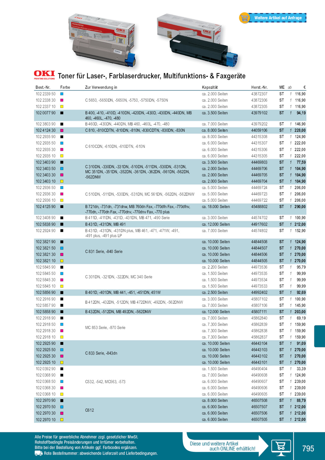 Weitere Artikel auf Anfrage Toner für Laser-, Farblaserdrucker, Multifunktions- & Faxgeräte Best.-Nr. 102 2339 50 102 2338 30 102 2337 10 102 0077 90 Farbe 102 3803 90 102 4124 30 102 2935 90 102 2935 50 102 2935 30 102 2935 10 102 3403 90 102 3403 50 102 3403 30 102 3403 10 102 2936 50 102 2936 30 102 2936 10 102 4125 90 102 3408 90 102 5838 90 102 2924 90 102 3821 90 102 3821 50 102 3821 30 102 3821 10 102 5845 90 102 5845 50 102 5845 30 102 5845 10 102 5856 90 102 2916 90 102 5857 90 102 5858 90 102 2918 90 102 2918 50 102 2918 30 102 2918 10 102 2925 90 102 2925 50 102 2925 30 102 2925 10 102 0392 90 102 0368 90 102 0368 50 102 0368 30 102 0368 10 102 2970 90 102 2970 50 102 2970 30 102 2970 10 Zur Verwendung in C 5650, -5650DN, -5650N, -5750, -5750DN, -5750N B 400, -410, -410D, -410DN, -420DN, -430D, -430DN, -440DN, MB 460, -460L, -470, -480 B 460D, -430DN, -440DN, MB 460, -460L, -470, -480 C 810, -810CDTN, -810DN, -810N, -830CDTN, -830DN, -830N C 610CDN, -610DN, -610DTN, -610N C 310DN, -330DN, -331DN, -510DN, -511DN, -530DN, -531DN, MC 351DN, -351DN, -352DN, -361DN, -362DN, -561DN, -562DN, -562DNW C 510DN, -511DN, -530DN, -531DN, MC 561DN, -562DN, -562DNW B 721dn, -731dn, -731dnw, MB 760dn Fax, -770dfn Fax, -770dfnv, -770dn, -770dn Fax, -770dnv, -770dnv Fax, -770 plus B 411D, -411DN, -431D, -431DN, MB 471, -490 Serie B 431D, -431DN, MB 491 B 431D, -431DN, -431DN plus, MB 461, -471, -471W, -491, -491 plus, -491 plus LP C 831 Serie, -840 Serie C 301DN, -321DN, -322DN, MC 340 Serie B 401D, -401DN, MB 441, -451, -451DN, 451W B 412DN, -432DN, -512DN, MB 472DNW, -492DN, -562DNW B 432DN, -512DN, MB 492DN, -562DNW MC 853 Serie, -870 Serie C 833 Serie, -843dn C532, -542, MC563, -573 C612 Kapazität ca. 2.000 Seiten ca. 2.000 Seiten ca. 2.000 Seiten ca. 3.500 Seiten ca. 7.000 Seiten ca. 8.000 Seiten ca. 8.000 Seiten ca. 6.000 Seiten ca. 6.000 Seiten ca. 6.000 Seiten ca. 3.500 Seiten ca. 2.000 Seiten ca. 2.000 Seiten ca. 2.000 Seiten ca. 5.000 Seiten ca. 5.000 Seiten ca. 5.000 Seiten ca. 18.000 Seiten ca. 3.000 Seiten ca. 12.000 Seiten ca. 7.000 Seiten ca. 10.000 Seiten ca. 10.000 Seiten ca. 10.000 Seiten ca. 10.000 Seiten ca. 2.200 Seiten ca. 1.500 Seiten ca. 1.500 Seiten ca. 1.500 Seiten ca. 2.500 Seiten ca. 3.000 Seiten ca. 7.000 Seiten ca. 12.000 Seiten ca. 7.000 Seiten ca. 7.300 Seiten ca. 7.300 Seiten ca. 7.300 Seiten ca. 10.000 Seiten ca. 10.000 Seiten ca. 10.000 Seiten ca. 10.000 Seiten ca. 1.500 Seiten ca. 7.000 Seiten ca. 6.000 Seiten ca. 6.000 Seiten ca. 6.000 Seiten ca. 8.000 Seiten ca. 6.000 Seiten ca. 6.000 Seiten ca. 6.000 Seiten Herst.-Nr. 43872307 43872306 43872305 43979102 43979202 44059106 44315308 44315307 44315306 44315305 44469803 44469706 44469705 44469704 44469724 44469723 44469722 45488802 44574702 44917602 44574802 44844508 44844507 44844506 44844505 44973536 44973535 44973534 44973533 44992402 45807102 45807106 45807111 45862840 45862839 45862838 45862837 46443104 46443103 46443102 46443101 46490404 46490608 46490607 46490606 46490605 46507508 46507507 46507506 46507505 ME ab € ST 1 116,90 ST 1 116,90 ST 1 116,90 ST 1 94,19 ST 1 146,90 ST 1 228,00 ST 1 124,90 ST 1 222,00 ST 1 222,00 ST 1 222,00 ST 1 77,59 ST 1 104,90 ST 1 104,90 ST 1 104,90 ST 1 206,00 ST 1 206,00 ST 1 206,00 ST 1 290,00 ST 1 100,90 ST 1 212,00 ST 1 152,90 ST 1 124,90 ST 1 270,00 ST 1 270,00 ST 1 270,00 ST 1 95,79 ST 1 99,99 ST 1 99,99 ST 1 99,99 ST 1 92,69 ST 1 100,90 ST 1 145,90 ST 1 203,00 ST 1 69,19 ST 1 159,90 ST 1 159,90 ST 1 159,90 ST 1 91,09 ST 1 270,00 ST 1 270,00 ST 1 270,00 ST 1 33,39 ST 1 124,90 ST 1 239,00 ST 1 239,00 ST 1 239,00 ST 1 88,79 ST 1 212,00 ST 1 212,00 ST 1 212,00 Alle Preise für gewerbliche Abnehmer zzgl. gesetzlicher MwSt. Rohstoffbedingte Preisänderungen und Irrtümer vorbehalten. Bitte bei der Bestellung von Artikeln ggf. Farbcodes ergänzen. Rote Bestellnummer: abweichende Lieferzeit und Lieferbedingungen. Diese und weitere Artikel auch ONLINE erhältlich! 795 102382110 102291850 102293590 102585790 102291810 102292590 102297090 102340310 102292490 102382130 102412590 102293610 102340350 102233710 102036810 102382150 102380390 102007790 102233830 102293630 102036850 102292510 102412430 102233950 102340390 102291890 102036890 102340890 102585890 102291690 102292550 102584550 102293530 102340330 102297010 102583890 102293510 102039290 102297050 102291830 102585690 102297030 102584510 102584530 102584590 102293550 102036830 102292530 102293650 102382190