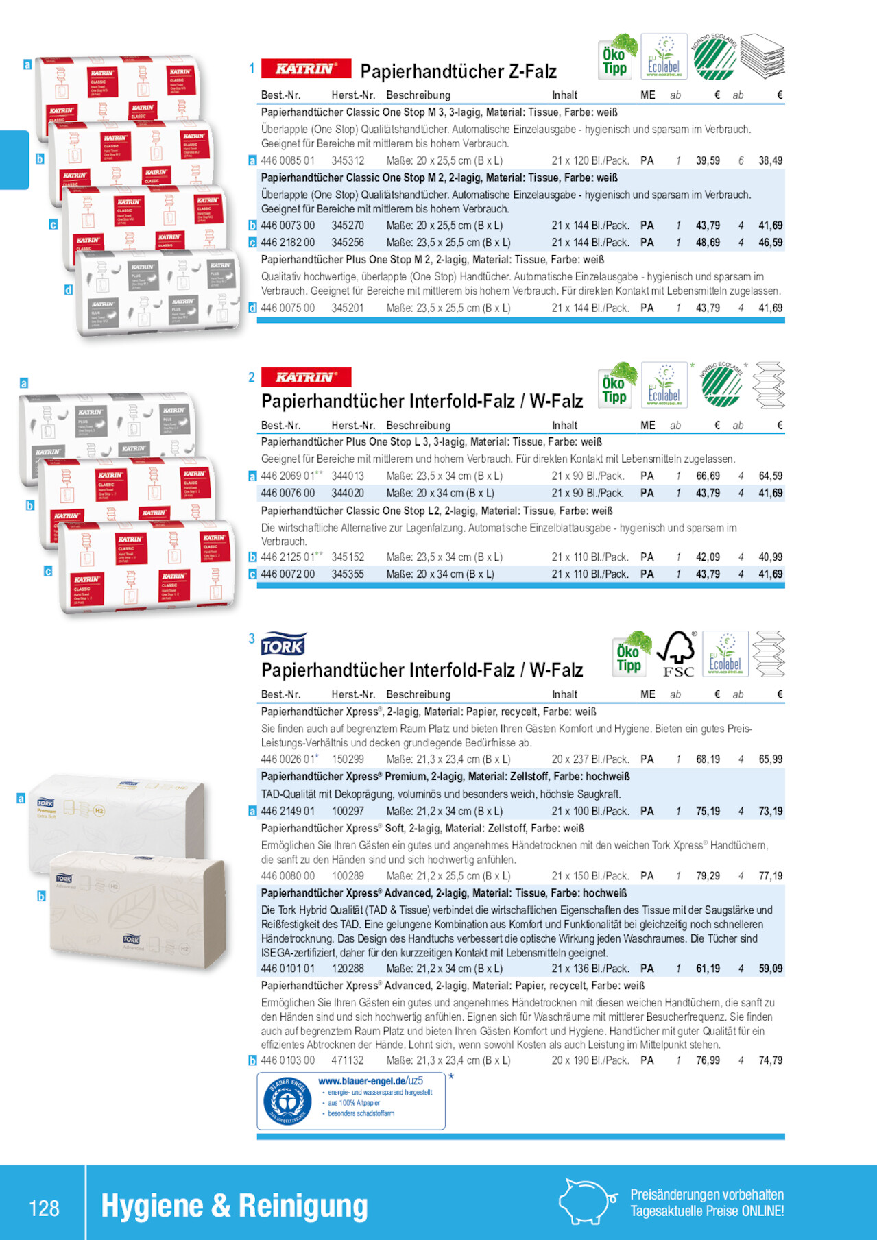 a b c d a b c a b 1 Papierhandtücher Z-Falz Best.-Nr. Herst.-Nr. Beschreibung Inhalt ME ab € ab € Papierhandtücher Classic One Stop M 3, 3-lagig, Material: Tissue, Farbe: weiß Überlappte (One Stop) Qualitätshandtücher. Automatische Einzelausgabe - hygienisch und sparsam im Verbrauch. Geeignet für Bereiche mit mittlerem bis hohem Verbrauch. a 446 0085 01 345312 Maße: 20 x 25,5 cm (B x L) 21 x 120 Bl./Pack. PA 1 39,59 6 38,49 Papierhandtücher Classic One Stop M 2, 2-lagig, Material: Tissue, Farbe: weiß Überlappte (One Stop) Qualitätshandtücher. Automatische Einzelausgabe - hygienisch und sparsam im Verbrauch. Geeignet für Bereiche mit mittlerem bis hohem Verbrauch. b 446 0073 00 345270 Maße: 20 x 25,5 cm (B x L) 21 x 144 Bl./Pack. PA 1 43,79 4 41,69 c 446 2182 00 345256 Maße: 23,5 x 25,5 cm (B x L) 21 x 144 Bl./Pack. PA 1 48,69 4 46,59 Papierhandtücher Plus One Stop M 2, 2-lagig, Material: Tissue, Farbe: weiß Qualitativ hochwertige, überlappte (One Stop) Handtücher. Automatische Einzelausgabe - hygienisch und sparsam im Verbrauch. Geeignet für Bereiche mit mittlerem bis hohem Verbrauch. Für direkten Kontakt mit Lebensmitteln zugelassen. d 446 0075 00 345201 Maße: 23,5 x 25,5 cm (B x L) 21 x 144 Bl./Pack. PA 1 43,79 4 41,69 2 ** Papierhandtücher Interfold-Falz / W-Falz Best.-Nr. Herst.-Nr. Beschreibung Inhalt ME ab € ab Papierhandtücher Plus One Stop L 3, 3-lagig, Material: Tissue, Farbe: weiß Geeignet für Bereiche mit mittlerem und hohem Verbrauch. Für direkten Kontakt mit Lebensmitteln zugelassen. a 446 2069 01** 344013 Maße: 23,5 x 34 cm (B x L) 21 x 90 Bl./Pack. PA 1 66,69 4 446 0076 00 344020 Maße: 20 x 34 cm (B x L) 21 x 90 Bl./Pack. PA 1 43,79 4 Papierhandtücher Classic One Stop L2, 2-lagig, Material: Tissue, Farbe: weiß Die wirtschaftliche Alternative zur Lagenfalzung. Automatische Einzelblattausgabe - hygienisch und sparsam im Verbrauch. b 446 2125 01** 345152 Maße: 23,5 x 34 cm (B x L) 21 x 110 Bl./Pack. PA 1 42,09 4 c 446 0072 00 345355 Maße: 20 x 34 cm (B x L) 21 x 110 Bl./Pack. PA 1 43,79 4 € 64,59 41,69 40,99 41,69 3 Papierhandtücher Interfold-Falz / W-Falz Best.-Nr. Herst.-Nr. Beschreibung Inhalt ME ab € ab € Papierhandtücher Xpress®, 2-lagig, Material: Papier, recycelt, Farbe: weiß Sie finden auch auf begrenztem Raum Platz und bieten Ihren Gästen Komfort und Hygiene. Bieten ein gutes PreisLeistungs-Verhältnis und decken grundlegende Bedürfnisse ab. 446 0026 01* 150299 Maße: 21,3 x 23,4 cm (B x L) 20 x 237 Bl./Pack. PA 1 68,19 4 65,99 Papierhandtücher Xpress® Premium, 2-lagig, Material: Zellstoff, Farbe: hochweiß TAD-Qualität mit Dekoprägung, voluminös und besonders weich, höchste Saugkraft. a 446 2149 01 100297 Maße: 21,2 x 34 cm (B x L) 21 x 100 Bl./Pack. PA 1 75,19 4 73,19 Papierhandtücher Xpress® Soft, 2-lagig, Material: Zellstoff, Farbe: weiß Ermöglichen Sie Ihren Gästen ein gutes und angenehmes Händetrocknen mit den weichen Tork Xpress® Handtüchern, die sanft zu den Händen sind und sich hochwertig anfühlen. 446 0080 00 100289 Maße: 21,2 x 25,5 cm (B x L) 21 x 150 Bl./Pack. PA 1 79,29 4 77,19 Papierhandtücher Xpress® Advanced, 2-lagig, Material: Tissue, Farbe: hochweiß Die Tork Hybrid Qualität (TAD & Tissue) verbindet die wirtschaftlichen Eigenschaften des Tissue mit der Saugstärke und Reißfestigkeit des TAD. Eine gelungene Kombination aus Komfort und Funktionalität bei gleichzeitig noch schnelleren Händetrocknung. Das Design des Handtuchs verbessert die optische Wirkung jeden Waschraumes. Die Tücher sind ISEGA-zertifiziert, daher für den kurzzeitigen Kontakt mit Lebensmitteln geeignet. 446 0101 01 120288 Maße: 21,2 x 34 cm (B x L) 21 x 136 Bl./Pack. PA 1 61,19 4 59,09 Papierhandtücher Xpress® Advanced, 2-lagig, Material: Papier, recycelt, Farbe: weiß Ermöglichen Sie Ihren Gästen ein gutes und angenehmes Händetrocknen mit diesen weichen Handtüchern, die sanft zu den Händen sind und sich hochwertig anfühlen. Eignen sich für Waschräume mit mittlerer Besucherfrequenz. Sie finden auch auf begrenztem Raum Platz und bieten Ihren Gästen Komfort und Hygiene. Handtücher mit guter Qualität für ein effizientes Abtrocknen der Hände. Lohnt sich, wenn sowohl Kosten als auch Leistung im Mittelpunkt stehen. b 446 0103 00 471132 Maße: 21,3 x 23,4 cm (B x L) 20 x 190 Bl./Pack. PA 1 76,99 4 74,79 * 128 Hygiene & Reinigung Preisänderungen vorbehalten Tagesaktuelle Preise ONLINE! 446008501 446007500 446212501 446008000 446218200 446007300 446214901 446007600 446007200 446206901 446010101 446010300 446002601