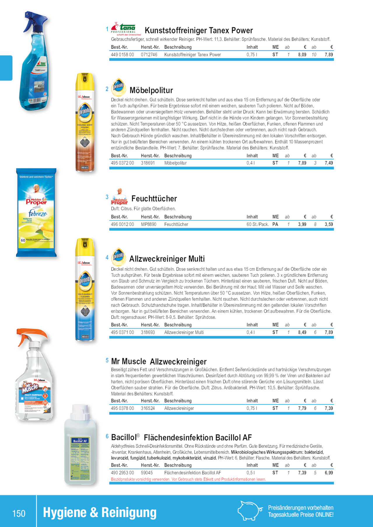 1 Kunststoffreiniger Tanex Power Gebrauchsfertiger, schnell wirkender Reiniger. PH-Wert: 11,3. Behälter: Sprühflasche. Material des Behälters: Kunststoff. Best.-Nr. Herst.-Nr. Beschreibung Inhalt ME ab € ab € 449 0158 00 0712746 Kunststoffreiniger Tanex Power 0,75 l ST 1 8,09 10 7,89 2 Möbelpolitur Deckel nicht drehen. Gut schütteln. Dose senkrecht halten und aus etwa 15 cm Entfernung auf die Oberfläche oder ein Tuch aufsprühen. Für beste Ergebnisse sofort mit einem weichen, sauberen Tuch polieren. Nicht auf Böden, Badewannen oder unversiegeltem Holz verwenden. Behälter steht unter Druck: Kann bei Erwärmung bersten. Schädlich für Wasserorganismen mit langfristiger Wirkung. Darf nicht in die Hände von Kindern gelangen. Vor Sonnenbestrahlung schützen. Nicht Temperaturen über 50 °C aussetzen. Von Hitze, heißen Oberflächen, Funken, offenen Flammen und anderen Zündquellen fernhalten. Nicht rauchen. Nicht durchstechen oder verbrennen, auch nicht nach Gebrauch. Nach Gebrauch Hände gründlich waschen. Inhalt/Behälter in Übereinstimmung mit den lokalen Vorschriften entsorgen. Nur in gut belüfteten Bereichen verwenden. An einem kühlen trockenen Ort aufbewahren. Enthält 10 Massenprozent entzündliche Bestandteile. PH-Wert: 7. Behälter: Sprühflasche. Material des Behälters: Kunststoff. Best.-Nr. Herst.-Nr. Beschreibung Inhalt ME ab € ab € 495 0372 00 318691 Möbelpolitur 0,4 l ST 1 7,89 3 7,49 3 Feuchttücher Duft: Citrus. Für glatte Oberflächen. Best.-Nr. Herst.-Nr. Beschreibung 496 0012 00 MP8890 Feuchttücher Inhalt ME ab € ab € 60 St./Pack. PA 1 3,99 8 3,59 4 Allzweckreiniger Multi Deckel nicht drehen. Gut schütteln. Dose senkrecht halten und aus etwa 15 cm Entfernung auf die Oberfläche oder ein Tuch aufsprühen. Für beste Ergebnisse sofort mit einem weichen, sauberen Tuch polieren. 3 x gründlichere Entfernung von Staub und Schmutz im Vergleich zu trockenen Tüchern. Hinterlässt einen sauberen, frischen Duft. Nicht auf Böden, Badewannen oder unversiegeltem Holz verwenden. Bei Berührung mit der Haut: Mit viel Wasser und Seife waschen. Vor Sonnenbestrahlung schützen. Nicht Temperaturen über 50 °C aussetzen. Von Hitze, heißen Oberflächen, Funken, offenen Flammen und anderen Zündquellen fernhalten. Nicht rauchen. Nicht durchstechen oder verbrennen, auch nicht nach Gebrauch. Schutzhandschuhe tragen. Inhalt/Behälter in Übereinstimmung mit den geltenden lokalen Vorschriften entsorgen. Nur in gut belüfteten Bereichen verwenden. An einem kühlen, trockenen Ort aufbewahren. Für die Oberfläche. Duft: regenschauer. PH-Wert: 8-9,5. Behälter: Sprühdose. Best.-Nr. Herst.-Nr. Beschreibung Inhalt ME ab € ab € 495 0371 00 318693 Allzweckreiniger Multi 0,4 l ST 1 8,49 6 7,89 5 Mr Muscle Allzweckreiniger Beseitigt zähes Fett und Verschmutzungen in Großküchen. Entfernt Seifenrückstände und hartnäckige Verschmutzungen in stark frequentierten gewerblichen Waschräumen. Desinfiziert durch Abtötung von 99,99 % der Viren und Bakterien auf harten, nicht porösen Oberflächen. Hinterlässt einen frischen Duft ohne störende Gerüche von Lösungsmitteln. Lässt Oberflächen sauber strahlen. Für die Oberfläche. Duft: Zitrus. Antibakteriell. PH-Wert: 10,5. Behälter: Sprühflasche. Material des Behälters: Kunststoff. Best.-Nr. Herst.-Nr. Beschreibung Inhalt ME ab € ab € 495 0378 00 316524 Allzweckreiniger 0,75 l ST 1 7,79 6 7,39 6 Bacillol® Flächendesinfektion Bacillol AF Aldehydfreies Schnell-Desinfektionsmittel. Ohne Rückstände und ohne Parfüm. Gute Benetzung. Für medizinische Geräte, -Inventar, Krankenhaus, Altenheim, Großküche, Lebensmittelbereich. Mikrobiologisches Wirkungsspektrum: bakterizid, levurozid, fungizid, tuberkulozid, mykobakterizid, viruzid. PH-Wert: 6. Behälter: Flasche. Material des Behälters: Kunststoff. Best.-Nr. Herst.-Nr. Beschreibung Inhalt ME ab € ab € 490 2953 00 59045 Flächendesinfektion Bacillol AF 0,5 l ST 1 7,39 5 6,99 Biozidprodukte vorsichtig verwenden. Vor Gebrauch stets Etikett und Produktinformationen lesen. 150 Hygiene & Reinigung Preisänderungen vorbehalten Tagesaktuelle Preise ONLINE! 495037100 490295300 496001200 449015800 495037800 495037200