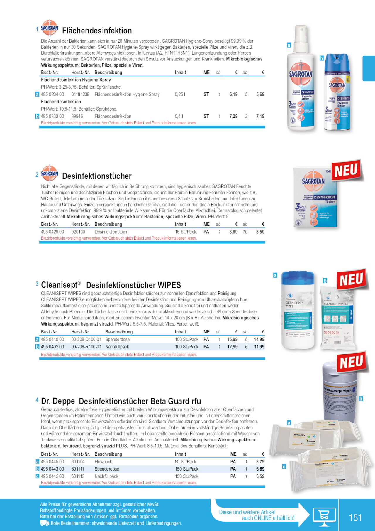 1 Flächendesinfektion Die Anzahl der Bakterien kann sich in nur 20 Minuten verdoppeln. SAGROTAN Hygiene-Spray beseitigt 99,99 % der Bakterien in nur 30 Sekunden. SAGROTAN Hygiene-Spray wirkt gegen Bakterien, spezielle Pilze und Viren, die z.B. Durchfallerkrankungen, obere Atemwegsinfektionen, Influenza (A2, H1N1, H5N1), Lungenentzündung oder Herpes verursachen können. SAGROTAN verstärkt dadurch den Schutz vor Ansteckungen und Krankheiten. Mikrobiologisches Wirkungsspektrum: Bakterien, Pilze, spezielle Viren. Best.-Nr. Herst.-Nr. Beschreibung Inhalt ME ab € ab € Flächendesinfektion Hygiene Spray PH-Wert: 3,25-3,75. Behälter: Sprühflasche. a 495 0204 00 01181239 Flächendesinfektion Hygiene Spray 0,25 l ST 1 6,19 5 5,69 Flächendesinfektion PH-Wert: 10,8-11,8. Behälter: Sprühdose. b 495 0333 00 39946 Flächendesinfektion 0,4 l ST 1 7,29 3 7,19 Biozidprodukte vorsichtig verwenden. Vor Gebrauch stets Etikett und Produktinformationen lesen. a b 2 Desinfektionstücher Nicht alle Gegenstände, mit denen wir täglich in Berührung kommen, sind hygienisch sauber. SAGROTAN Feuchte Tücher reinigen und desinfizieren Flächen und Gegenstände, die mit der Haut in Berührung kommen können, wie z.B. WC-Brillen, Telefonhörer oder Türklinken. Sie bieten somit einen besseren Schutz vor Krankheiten und Infektionen zu Hause und Unterwegs. Einzeln verpackt und in handlicher Größe, sind die Tücher der ideale Begleiter für schnelle und unkomplizierte Desinfektion. 99,9 % antibakterielle Wirksamkeit. Für die Oberfläche. Alkoholfrei. Dermatologisch getestet. Antibakteriell. Mikrobiologisches Wirkungsspektrum: Bakterien, spezielle Pilze, Viren. PH-Wert: 8. Best.-Nr. Herst.-Nr. Beschreibung Inhalt ME ab € ab € 495 0429 00 020130 Desinfektionstuch 15 St./Pack. PA 1 3,89 10 3,59 Biozidprodukte vorsichtig verwenden. Vor Gebrauch stets Etikett und Produktinformationen lesen. 3 Cleanisept® Desinfektionstücher WIPES CLEANISEPT WIPES sind gebrauchsfertige Desinfektionstücher zur schnellen Desinfektion und Reinigung. CLEANISEPT WIPES ermöglichen insbesondere bei der Desinfektion und Reinigung von Ultraschallköpfen ohne Schleimhautkontakt eine praxisnahe und zeitsparende Anwendung. Sie sind alkoholfrei und enthalten weder Aldehyde noch Phenole. Die Tücher lassen sich einzeln aus der praktischen und wiederverschließbaren Spenderdose entnehmen. Für Medizinprodukten, medizinischem Inventar. Maße: 14 x 20 cm (B x H). Alkoholfrei. Mikrobiologisches Wirkungsspektrum: begrenzt viruzid. PH-Wert: 5,5-7,5. Material: Vlies. Farbe: weiß. Best.-Nr. Herst.-Nr. Beschreibung Inhalt ME ab € ab € a 495 0410 00 00-208-D100-01 Spenderdose 100 St./Pack. PA 1 15,99 6 14,99 b 495 0402 00 00-208-R100-01 Nachfüllpack 100 St./Pack. PA 1 12,99 6 11,99 Biozidprodukte vorsichtig verwenden. Vor Gebrauch stets Etikett und Produktinformationen lesen. a b 4 Dr. Deppe Desinfektionstücher Beta Guard rfu Gebrauchsfertige, aldehydfreie Hygienetücher mit breitem Wirkungsspektrum zur Desinfektion aller Oberflächen und Gegenständen im Patientennahen Umfeld wie auch von Oberflächen in der Industrie und in Lebensmittelbereichen. Ideal, wenn praxisgerechte Einwirkzeiten erforderlich sind. Sichtbare Verschmutzungen vor der Desinfektion entfernen. Dann die Oberflächen sorgfältig mit dem getränkten Tuch abwischen. Dabei auf eine vollständige Benetzung achten und während der gesamten Einwirkzeit feucht halten. Im Lebensmittelbereich die Flächen anschließend mit Wasser von Trinkwasserqualität abspülen. Für die Oberfläche. Alkoholfrei. Antibakteriell. Mikrobiologisches Wirkungsspektrum: bakterizid, levurozid, begrenzt viruzid PLUS. PH-Wert: 8,5-10,5. Material des Behälters: Kunststoff. Best.-Nr. Herst.-Nr. Beschreibung Inhalt ME ab € a 495 0445 00 601104 Flowpack 80 St./Pack. b 495 0443 00 601111 Spenderdose 150 St./Pack. c 495 0442 00 601113 Nachfüllpack 150 St./Pack. Biozidprodukte vorsichtig verwenden. Vor Gebrauch stets Etikett und Produktinformationen lesen. PA 1 8,79 PA 1 6,69 PA 1 6,59 a c Alle Preise für gewerbliche Abnehmer zzgl. gesetzlicher MwSt. Rohstoffbedingte Preisänderungen und Irrtümer vorbehalten. Bitte bei der Bestellung von Artikeln ggf. Farbcodes ergänzen. Rote Bestellnummer: abweichende Lieferzeit und Lieferbedingungen. Diese und weitere Artikel auch ONLINE erhältlich! b 151 495042900 495044200 495040200 495044300 495041000 495033300 495020400 495044500