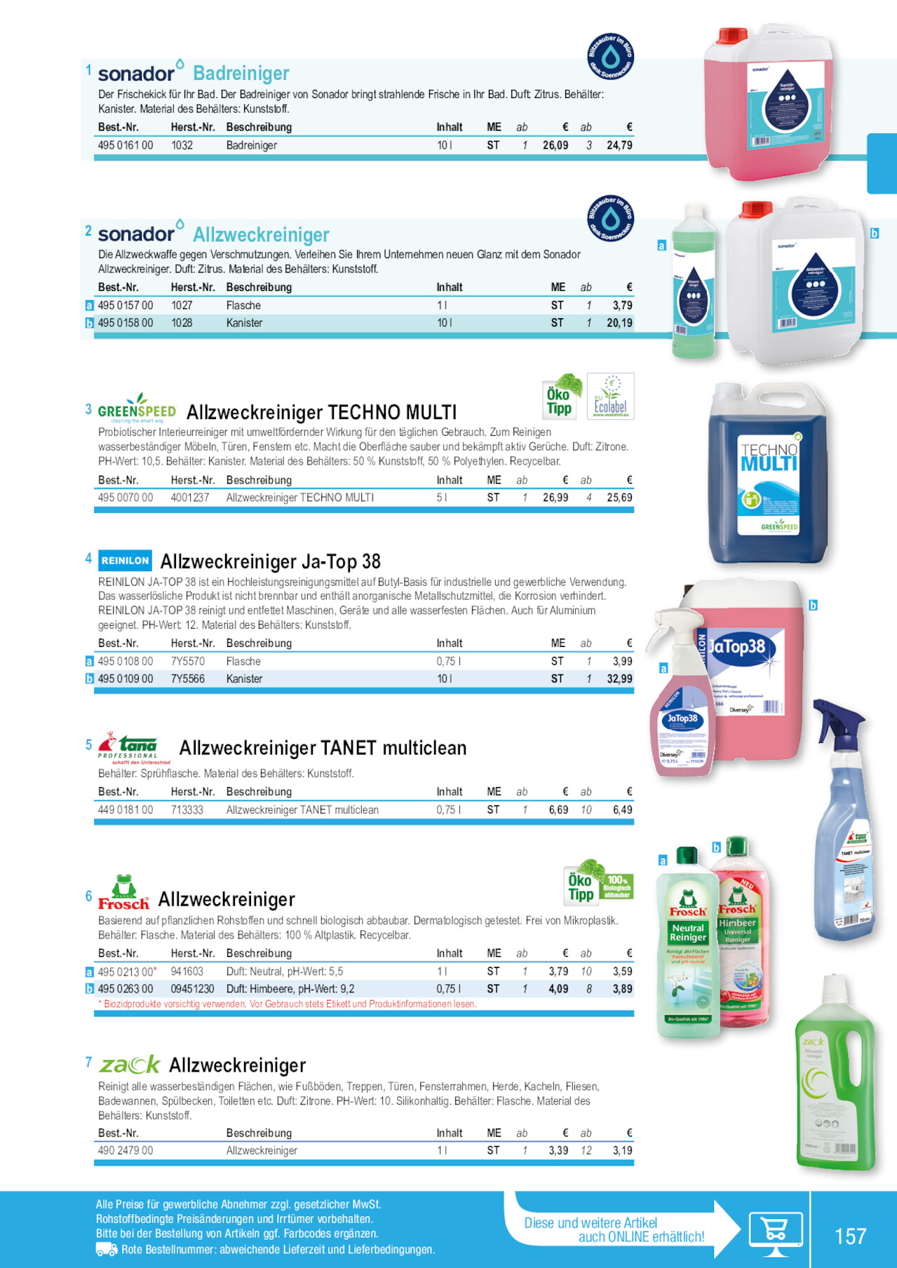 1 Badreiniger Der Frischekick für Ihr Bad. Der Badreiniger von Sonador bringt strahlende Frische in Ihr Bad. Duft: Zitrus. Behälter: Kanister. Material des Behälters: Kunststoff. Best.-Nr. Herst.-Nr. Beschreibung Inhalt ME ab € ab € 495 0161 00 1032 Badreiniger 10 l ST 1 26,09 3 24,79 2 Allzweckreiniger Die Allzweckwaffe gegen Verschmutzungen. Verleihen Sie Ihrem Unternehmen neuen Glanz mit dem Sonador Allzweckreiniger. Duft: Zitrus. Material des Behälters: Kunststoff. Best.-Nr. Herst.-Nr. Beschreibung Inhalt ME ab a 495 0157 00 1027 Flasche 1 l ST 1 b 495 0158 00 1028 Kanister 10 l ST 1 € 3,79 20,19 a 3 Allzweckreiniger TECHNO MULTI Probiotischer Interieurreiniger mit umweltfördernder Wirkung für den täglichen Gebrauch. Zum Reinigen wasserbeständiger Möbeln, Türen, Fenstern etc. Macht die Oberfläche sauber und bekämpft aktiv Gerüche. Duft: Zitrone. PH-Wert: 10,5. Behälter: Kanister. Material des Behälters: 50 % Kunststoff, 50 % Polyethylen. Recycelbar. Best.-Nr. Herst.-Nr. Beschreibung Inhalt ME ab € ab € 495 0070 00 4001237 Allzweckreiniger TECHNO MULTI 5 l ST 1 26,99 4 25,69 4 Allzweckreiniger Ja-Top 38 REINILON JA-TOP 38 ist ein Hochleistungsreinigungsmittel auf Butyl-Basis für industrielle und gewerbliche Verwendung. Das wasserlösliche Produkt ist nicht brennbar und enthält anorganische Metallschutzmittel, die Korrosion verhindert. REINILON JA-TOP 38 reinigt und entfettet Maschinen, Geräte und alle wasserfesten Flächen. Auch für Aluminium geeignet. PH-Wert: 12. Material des Behälters: Kunststoff. Best.-Nr. Herst.-Nr. Beschreibung Inhalt ME ab € a 495 0108 00 7Y5570 Flasche 0,75 l ST 1 3,99 b 495 0109 00 7Y5566 Kanister 10 l ST 1 32,99 a 5 Allzweckreiniger TANET multiclean Behälter: Sprühflasche. Material des Behälters: Kunststoff. Best.-Nr. Herst.-Nr. Beschreibung 449 0181 00 713333 Allzweckreiniger TANET multiclean Inhalt 0,75 l ME ab ST 1 € ab 6,69 10 € 6,49 6 Allzweckreiniger Basierend auf pflanzlichen Rohstoffen und schnell biologisch abbaubar. Dermatologisch getestet. Frei von Mikroplastik. Behälter: Flasche. Material des Behälters: 100 % Altplastik. Recycelbar. Best.-Nr. Herst.-Nr. Beschreibung Inhalt ME ab € ab € a 495 0213 00* 941603 Duft: Neutral, pH-Wert: 5,5 1 l ST 1 3,79 10 3,59 b 495 0263 00 09451230 Duft: Himbeere, pH-Wert: 9,2 0,75 l ST 1 4,09 8 3,89 * Biozidprodukte vorsichtig verwenden. Vor Gebrauch stets Etikett und Produktinformationen lesen. a b 7 Allzweckreiniger Reinigt alle wasserbeständigen Flächen, wie Fußböden, Treppen, Türen, Fensterrahmen, Herde, Kacheln, Fliesen, Badewannen, Spülbecken, Toiletten etc. Duft: Zitrone. PH-Wert: 10. Silikonhaltig. Behälter: Flasche. Material des Behälters: Kunststoff. Best.-Nr. Beschreibung Inhalt ME ab € ab 490 2479 00 Allzweckreiniger 1 l ST 1 3,39 12 € 3,19 Alle Preise für gewerbliche Abnehmer zzgl. gesetzlicher MwSt. Rohstoffbedingte Preisänderungen und Irrtümer vorbehalten. Bitte bei der Bestellung von Artikeln ggf. Farbcodes ergänzen. Rote Bestellnummer: abweichende Lieferzeit und Lieferbedingungen. Diese und weitere Artikel auch ONLINE erhältlich! b b 157 490247900 495015700 495010800 495016100 495015800 449018100 495026300 495010900