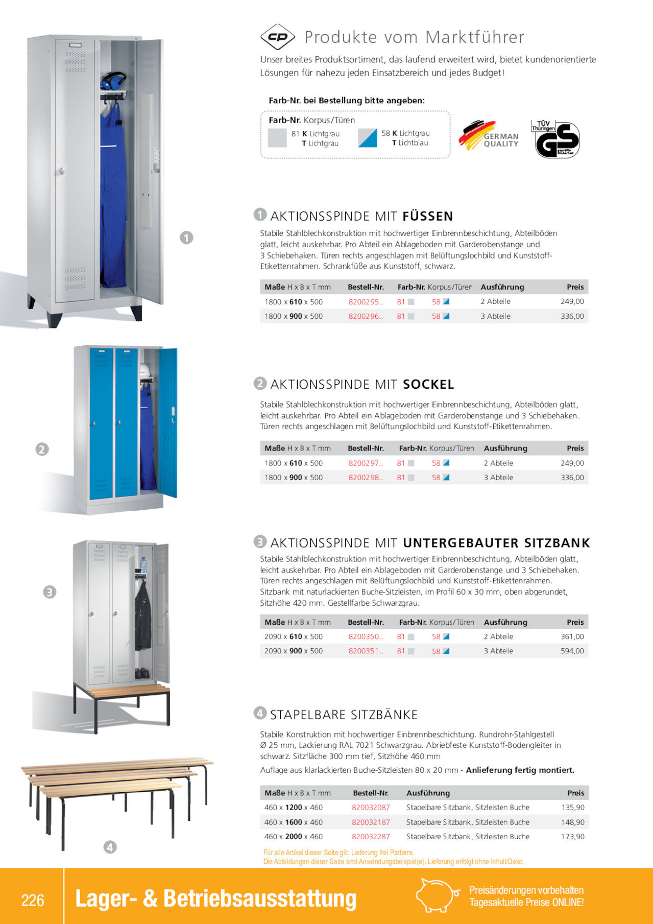 Produkte vom Marktführer Unser breites Produktsortiment, das laufend erweitert wird, bietet kundenorientierte Lösungen für nahezu jeden Einsatzbereich und jedes Budget! Farb-Nr. bei Bestellung bitte angeben: Farb-Nr. Korpus / Türen 81 K Lichtgrau T Lichtgrau 58 K Lichtgrau T Lichtblau GERMAN QUALITY 1 AKTIONSSPINDE MIT FÜSSEN 1 Stabile Stahlblechkonstruktion mit hochwertiger Einbrennbeschichtung, Abteilböden glatt, leicht auskehrbar. Pro Abteil ein Ablageboden mit Garderobenstange und 3 Schiebehaken. Türen rechts angeschlagen mit Belüftungslochbild und Kunststoff- Etikettenrahmen. Schrankfüße aus Kunststoff, schwarz. Maße H x B x T mm 1800 x 610 x 500 1800 x 900 x 500 Bestell-Nr. 8200295.. 8200296.. Farb-Nr. Korpus / Türen Ausführung 81 58 2 Abteile 81 58 3 Abteile Preis 249,00 336,00 2 AKTIONSSPINDE MIT SOCKEL Stabile Stahlblechkonstruktion mit hochwertiger Einbrennbeschichtung, Abteilböden glatt, leicht auskehrbar. Pro Abteil ein Ablageboden mit Garderobenstange und 3 Schiebehaken. Türen rechts angeschlagen mit Belüftungslochbild und Kunststoff-Etikettenrahmen. 2 Maße H x B x T mm Bestell-Nr. Farb-Nr. Korpus / Türen Ausführung Preis 1800 x 610 x 500 8200297.. 81 58 2 Abteile 249,00 1800 x 900 x 500 8200298.. 81 58 3 Abteile 336,00 3 AKTIONSSPINDE MIT UNTERGEBAUTER SITZBANK Stabile Stahlblechkonstruktion mit hochwertiger Einbrennbeschichtung, Abteilböden glatt, leicht auskehrbar. Pro Abteil ein Ablageboden mit Garderobenstange und 3 Schiebehaken. Türen rechts angeschlagen mit Belüftungslochbild und Kunststoff-Etikettenrahmen. 3 Sitzbank mit naturlackierten Buche-Sitzleisten, im Profil 60 x 30 mm, oben abgerundet, Sitzhöhe 420 mm. Gestellfarbe Schwarzgrau. Maße H x B x T mm 2090 x 610 x 500 2090 x 900 x 500 Bestell-Nr. 8200350.. 8200351.. Farb-Nr. Korpus / Türen 81 58 81 58 Ausführung 2 Abteile 3 Abteile Preis 361,00 594,00 226 4 STAPELBARE SITZBÄNKE Stabile Konstruktion mit hochwertiger Einbrennbeschichtung. Rundrohr-Stahlgestell Ø 25 mm, Lackierung RAL 7021 Schwarzgrau. Abriebfeste Kunststoff-Bodengleiter in schwarz. Sitzfläche 300 mm tief, Sitzhöhe 460 mm Auflage aus klarlackierten Buche-Sitzleisten 80 x 20 mm - Anlieferung fertig montiert. Maße H x B x T mm Bestell-Nr. Ausführung Preis 460 x 1200 x 460 820032087 Stapelbare Sitzbank, Sitzleisten Buche 135,90 460 x 1600 x 460 820032187 Stapelbare Sitzbank, Sitzleisten Buche 148,90 460 x 2000 x 460 820032287 Stapelbare Sitzbank, Sitzleisten Buche 173,90 4 Für alle Artikel dieser Seite gilt: Lieferung frei Parterre. Die Abbildungen dieser Seite sind Anwendungsbeispiel(e). Lieferung erfolgt ohne Inhalt/Deko. Lager- & Betriebsausstattung Preisänderungen vorbehalten Tagesaktuelle Preise ONLINE! 820029758 820035081 820035058 820035181 820029858 820029681 820029658 820032287 820029558 820029781 820032087 820029881 820032187 820035158 820029581