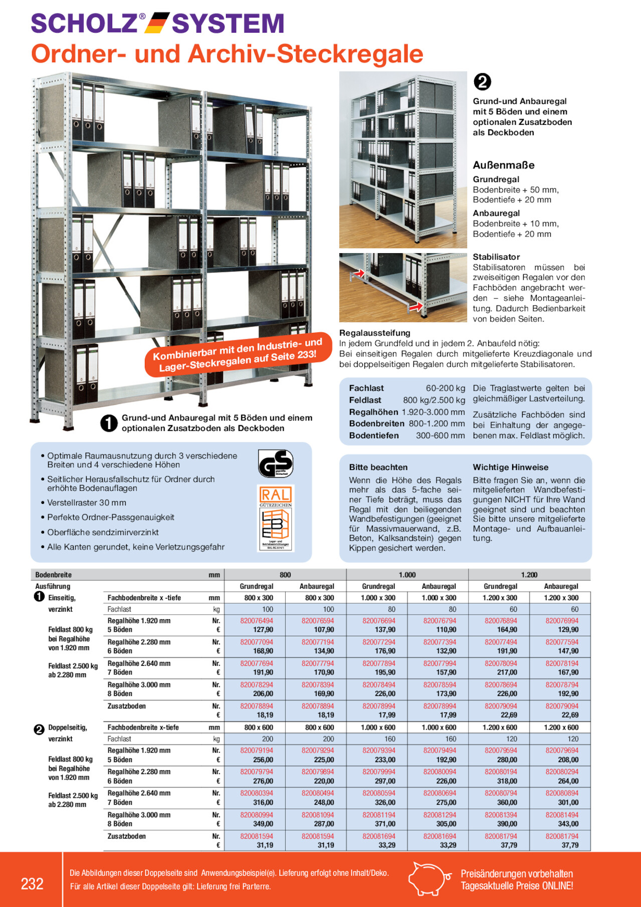 SYSTEM Ordner- und Archiv-Steckregale ➋ Grund-und Anbauregal mit 5 Böden und einem optionalen Zusatzboden als Deckboden KLoamgbeirn-iSetrebcakrrmegitadleennaIunfdSusetitreie2- 3u3n!d ➊ Grund-und Anbauregal mit 5 Böden und einem optionalen Zusatzboden als Deckboden • Optimale Raumausnutzung durch 3 verschiedene Breiten und 4 verschiedene Höhen • Seitlicher Herausfallschutz für Ordner durch erhöhte Bodenauflagen • Verstellraster 30 mm • Perfekte Ordner-Passgenauigkeit • Oberfläche sendzimirverzinkt • Alle Kanten gerundet, keine Verletzungsgefahr Außenmaße Grundregal Bodenbreite + 50 mm, Bodentiefe + 20 mm Anbauregal Bodenbreite + 10 mm, Bodentiefe + 20 mm Stabilisator Stabilisatoren müssen bei zweiseitigen Regalen vor den Fachböden angebracht werden – siehe Montageanleitung. Dadurch Bedienbarkeit von beiden Seiten. Regalaussteifung ln jedem Grundfeld und in jedem 2. Anbaufeld nötig: Bei einseitigen Regalen durch mitgelieferte Kreuzdiagonale und bei doppelseitigen Regalen durch mitgelieferte Stabilisatoren. Fachlast 60-200 kg Feldlast 800 kg/2.500 kg Regalhöhen 1.920-3.000 mm Bodenbreiten 800-1.200 mm Bodentiefen 300-600 mm Die Traglastwerte gelten bei gleichmäßiger Lastverteilung. Zusätzliche Fachböden sind bei Einhaltung der angegebenen max. Feldlast möglich. Bitte beachten Wenn die Höhe des Regals mehr als das 5-fache seiner Tiefe beträgt, muss das Regal mit den beiliegenden Wandbefestigungen (geeignet für Massivmauerwand, z.B. Beton, Kalksandstein) gegen Kippen gesichert werden. Wichtige Hinweise Bitte fragen Sie an, wenn die mitgelieferten Wandbefestigungen NICHT für Ihre Wand geeignet sind und beachten Sie bitte unsere mitgelieferte Montage- und Aufbauanleitung. Bodenbreite Ausführung ➊ Einseitig, verzinkt Feldlast 800 kg bei Regalhöhe von 1.920 mm Feldlast 2.500 kg ab 2.280 mm Fachbodenbreite x -tiefe Fachlast Regalhöhe 1.920 mm 5 Böden Regalhöhe 2.280 mm 6 Böden Regalhöhe 2.640 mm 7 Böden Regalhöhe 3.000 mm 8 Böden Zusatzboden ➋ Doppelseitig, verzinkt Feldlast 800 kg bei Regalhöhe von 1.920 mm Feldlast 2.500 kg ab 2.280 mm Fachbodenbreite x-tiefe Fachlast Regalhöhe 1.920 mm 5 Böden Regalhöhe 2.280 mm 6 Böden Regalhöhe 2.640 mm 7 Böden Regalhöhe 3.000 mm 8 Böden Zusatzboden mm 800 Grundregal Anbauregal mm 800 x 300 800 x 300 kg 100 100 Nr. 820076494 € 127,90 820076594 107,90 Nr. 820077094 € 168,90 820077194 134,90 Nr. 820077694 € 191,90 820077794 170,90 Nr. 820078294 € 206,00 820078394 169,90 Nr. 820078894 € 18,19 820078894 18,19 mm 800 x 600 800 x 600 kg 200 200 Nr. 820079194 € 256,00 820079294 225,00 Nr. 820079794 € 276,00 820079894 220,00 Nr. 820080394 € 316,00 820080494 248,00 Nr. 820080994 € 349,00 820081094 287,00 Nr. 820081594 € 31,19 820081594 31,19 1.000 Grundregal Anbauregal 1.000 x 300 1.000 x 300 80 80 820076694 137,90 820076794 110,90 820077294 176,90 820077394 132,90 820077894 195,90 820077994 157,90 820078494 226,00 820078594 173,90 820078994 17,99 820078994 17,99 1.000 x 600 1.000 x 600 160 160 820079394 233,00 820079494 192,90 820079994 297,00 820080094 226,00 820080594 326,00 820080694 275,00 820081194 371,00 820081294 305,00 820081694 33,29 820081694 33,29 1.200 Grundregal Anbauregal 1.200 x 300 1.200 x 300 60 60 820076894 164,90 820076994 129,90 820077494 191,90 820077594 147,90 820078094 217,00 820078194 167,90 820078694 226,00 820078794 192,90 820079094 22,69 820079094 22,69 1.200 x 600 1.200 x 600 120 120 820079594 280,00 820079694 208,00 820080194 318,00 820080294 264,00 820080794 360,00 820080894 301,00 820081394 390,00 820081494 343,00 820081794 37,79 820081794 37,79 232 Die Abbildungen dieser Doppelseite sind Anwendungsbeispiel(e). Lieferung erfolgt ohne Inhalt/Deko. Für alle Artikel dieser Doppelseite gilt: Lieferung frei Parterre. Preisänderungen vorbehalten Tagesaktuelle Preise ONLINE! 820078794 820079394 820077594 820078694 820081394 820076594 820079794 820080494 820076694 820079694 820080794 820079594 820079294 820079894 820080994 820081494 820078394 820078194 820080894 820079994 820077094 820078894 820081194 820080094 820080294 820077694 820081594 820079094 820079494 820077194 820079194 820077394 820078094 820078294 820077494 820078594 820080694 820078994 820076994 820078494 820080194 820077994 820076794 820077794 820076894 820077894 820081794 820077294 820080594 820081094 820081294 820076494 820081694 820080394