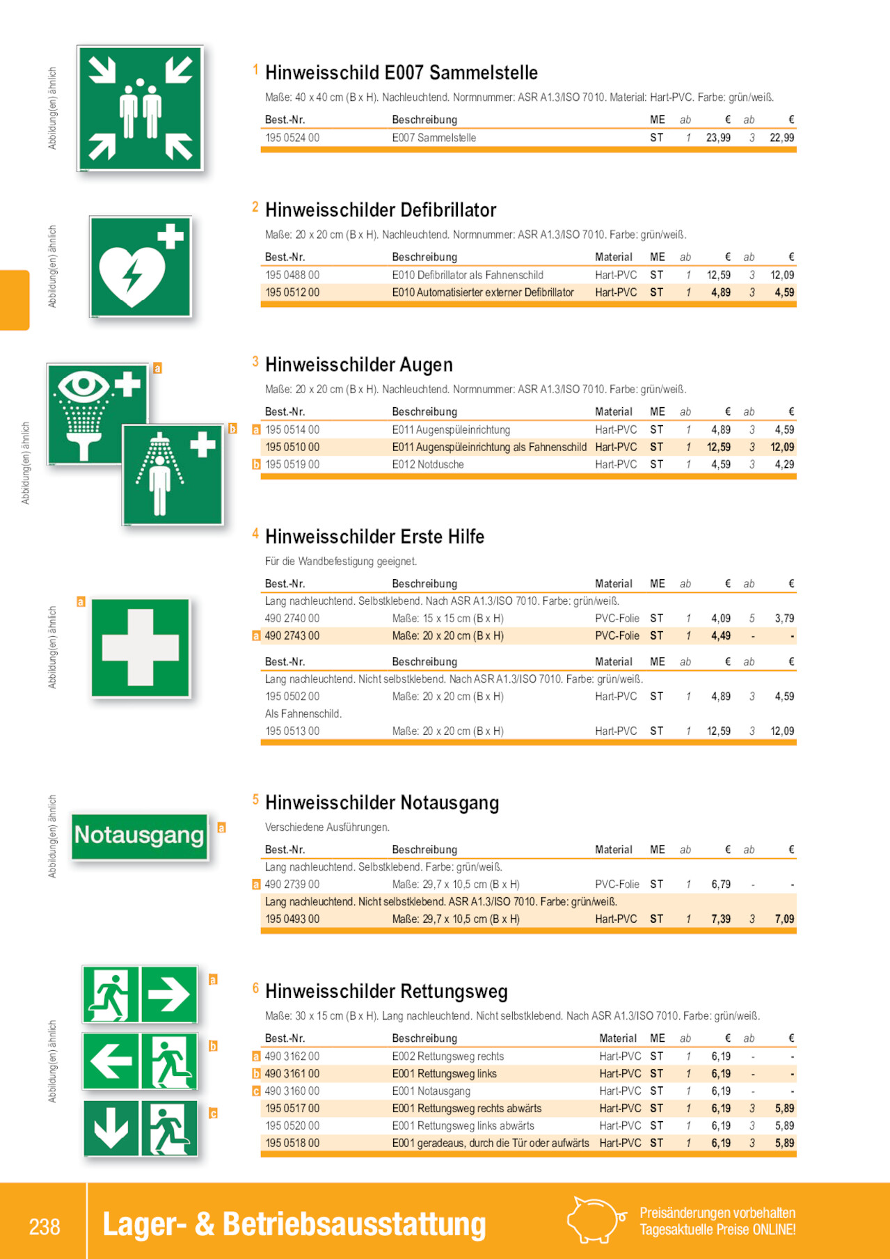 Abbildung(en) ähnlich 1 Hinweisschild E007 Sammelstelle Maße: 40 x 40 cm (B x H). Nachleuchtend. Normnummer: ASR A1.3/ISO 7010. Material: Hart-PVC. Farbe: grün/weiß. Best.-Nr. 195 0524 00 Beschreibung E007 Sammelstelle ME ab € ab € ST 1 23,99 3 22,99 Abbildung(en) ähnlich 2 Hinweisschilder Defibrillator Maße: 20 x 20 cm (B x H). Nachleuchtend. Normnummer: ASR A1.3/ISO 7010. Farbe: grün/weiß. Best.-Nr. 195 0488 00 195 0512 00 Beschreibung E010 Defibrillator als Fahnenschild E010 Automatisierter externer Defibrillator Material ME ab Hart-PVC ST 1 Hart-PVC ST 1 € 12,59 4,89 ab 3 3 € 12,09 4,59 a 3 Hinweisschilder Augen Maße: 20 x 20 cm (B x H). Nachleuchtend. Normnummer: ASR A1.3/ISO 7010. Farbe: grün/weiß. Best.-Nr. b a 195 0514 00 195 0510 00 b 195 0519 00 Beschreibung Material ME ab € ab € E011 Augenspüleinrichtung Hart-PVC ST 1 4,89 3 4,59 E011 Augenspüleinrichtung als Fahnenschild Hart-PVC ST 1 12,59 3 12,09 E012 Notdusche Hart-PVC ST 1 4,59 3 4,29 Abbildung(en) ähnlich Abbildung(en) ähnlich 4 Hinweisschilder Erste Hilfe Für die Wandbefestigung geeignet. Best.-Nr. Beschreibung Material ME ab € ab € a Lang nachleuchtend. Selbstklebend. Nach ASR A1.3/ISO 7010. Farbe: grün/weiß. 490 2740 00 Maße: 15 x 15 cm (B x H) PVC-Folie ST 1 4,09 5 3,79 a 490 2743 00 Maße: 20 x 20 cm (B x H) PVC-Folie ST 1 4,49 - - Best.-Nr. Beschreibung Material ME ab € ab € Lang nachleuchtend. Nicht selbstklebend. Nach ASR A1.3/ISO 7010. Farbe: grün/weiß. 195 0502 00 Maße: 20 x 20 cm (B x H) Hart-PVC ST 1 4,89 3 4,59 Als Fahnenschild. 195 0513 00 Maße: 20 x 20 cm (B x H) Hart-PVC ST 1 12,59 3 12,09 Abbildung(en) ähnlich 5 Hinweisschilder Notausgang a Verschiedene Ausführungen. Best.-Nr. Beschreibung Material ME Lang nachleuchtend. Selbstklebend. Farbe: grün/weiß. a 490 2739 00 Maße: 29,7 x 10,5 cm (B x H) PVC-Folie ST Lang nachleuchtend. Nicht selbstklebend. ASR A1.3/ISO 7010. Farbe: grün/weiß. 195 0493 00 Maße: 29,7 x 10,5 cm (B x H) Hart-PVC ST ab 1 1 € ab 6,79 7,39 3 € 7,09 a 6 Hinweisschilder Rettungsweg Maße: 30 x 15 cm (B x H). Lang nachleuchtend. Nicht selbstklebend. Nach ASR A1.3/ISO 7010. Farbe: grün/weiß. b Best.-Nr. a 490 3162 00 b 490 3161 00 c 490 3160 00 c 195 0517 00 195 0520 00 195 0518 00 Beschreibung Material ME E002 Rettungsweg rechts Hart-PVC ST E001 Rettungsweg links Hart-PVC ST E001 Notausgang Hart-PVC ST E001 Rettungsweg rechts abwärts Hart-PVC ST E001 Rettungsweg links abwärts Hart-PVC ST E001 geradeaus, durch die Tür oder aufwärts Hart-PVC ST ab 1 1 1 1 1 1 € ab 6,19 6,19 6,19 6,19 3 6,19 3 6,19 3 € 5,89 5,89 5,89 Abbildung(en) ähnlich 238 Lager- & Betriebsausstattung Preisänderungen vorbehalten Tagesaktuelle Preise ONLINE! 195048800 490274300 195049300 195051000 195051200 195051300 195050200 195051400 490316000 195051700 195051800 195051900 195052000 490316200 490316100 490273900 490274000 195052400