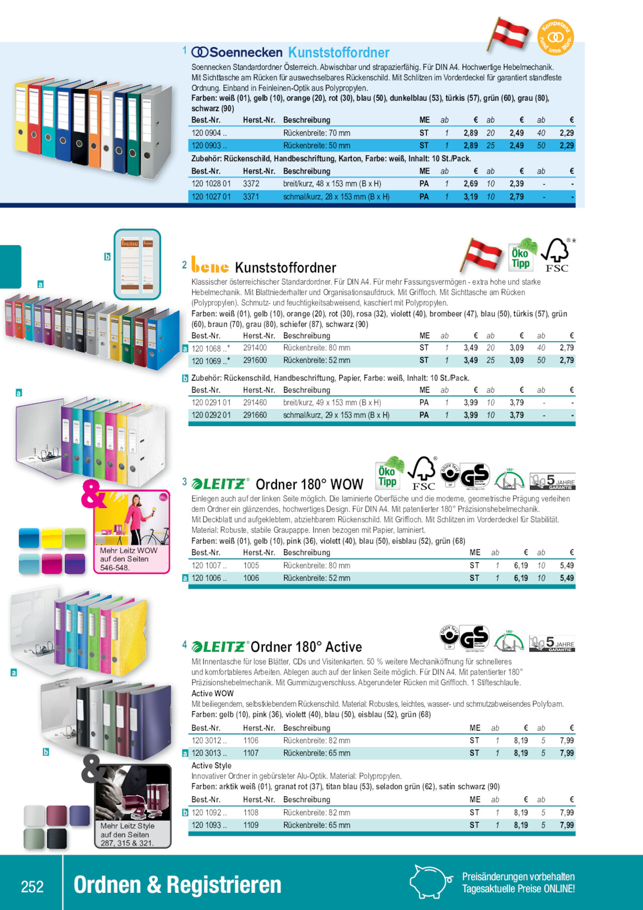 b a a 1 Kunststoffordner Soennecken Standardordner Österreich. Abwischbar und strapazierfähig. Für DIN A4. Hochwertige Hebelmechanik. Mit Sichttasche am Rücken für auswechselbares Rückenschild. Mit Schlitzen im Vorderdeckel für garantiert standfeste Ordnung. Einband in Feinleinen-Optik aus Polypropylen. Farben: weiß (01), gelb (10), orange (20), rot (30), blau (50), dunkelblau (53), türkis (57), grün (60), grau (80), schwarz (90) Best.-Nr. Herst.-Nr. Beschreibung ME ab € ab € ab € 120 0904 .. Rückenbreite: 70 mm ST 1 2,89 20 2,49 40 2,29 120 0903 .. Rückenbreite: 50 mm ST 1 2,89 25 2,49 50 2,29 Zubehör: Rückenschild, Handbeschriftung, Karton, Farbe: weiß, Inhalt: 10 St./Pack. Best.-Nr. Herst.-Nr. Beschreibung ME ab € ab € ab € 120 1028 01 3372 breit/kurz, 48 x 153 mm (B x H) PA 1 2,69 10 2,39 - - 120 1027 01 3371 schmal/kurz, 28 x 153 mm (B x H) PA 1 3,19 10 2,79 - - * 2 Kunststoffordner Klassischer österreichischer Standardordner. Für DIN A4. Für mehr Fassungsvermögen - extra hohe und starke Hebelmechanik. Mit Blattniederhalter und Organisationsaufdruck. Mit Griffloch. Mit Sichttasche am Rücken (Polypropylen). Schmutz- und feuchtigkeitsabweisend, kaschiert mit Polypropylen. Farben: weiß (01), gelb (10), orange (20), rot (30), rosa (32), violett (40), brombeer (47), blau (50), türkis (57), grün (60), braun (70), grau (80), schiefer (87), schwarz (90) Best.-Nr. Herst.-Nr. Beschreibung ME ab € ab € ab € a 120 1068 ..* 291400 Rückenbreite: 80 mm ST 1 3,49 20 3,09 40 2,79 120 1069 ..* 291600 Rückenbreite: 52 mm ST 1 3,49 25 3,09 50 2,79 b Zubehör: Rückenschild, Handbeschriftung, Papier, Farbe: weiß, Inhalt: 10 St./Pack. Best.-Nr. Herst.-Nr. Beschreibung ME ab € ab € ab 120 0291 01 291460 breit/kurz, 49 x 153 mm (B x H) PA 1 3,99 10 3,79 - 120 0292 01 291660 schmal/kurz, 29 x 153 mm (B x H) PA 1 3,99 10 3,79 - € - Mehr Leitz WOW auf den Seiten 546-548. 3 Ordner 180° WOW Einlegen auch auf der linken Seite möglich. Die laminierte Oberfläche und die moderne, geometrische Prägung verleihen dem Ordner ein glänzendes, hochwertiges Design. Für DIN A4. Mit patentierter 180° Präzisionshebelmechanik. Mit Deckblatt und aufgeklebtem, abziehbarem Rückenschild. Mit Griffloch. Mit Schlitzen im Vorderdeckel für Stabilität. Material: Robuste, stabile Graupappe. Innen bezogen mit Papier, laminiert. Farben: weiß (01), gelb (10), pink (36), violett (40), blau (50), eisblau (52), grün (68) Best.-Nr. Herst.-Nr. Beschreibung ME ab € ab € 120 1007 .. 1005 Rückenbreite: 80 mm ST 1 6,19 10 5,49 a 120 1006 .. 1006 Rückenbreite: 52 mm ST 1 6,19 10 5,49 a b 252 & Mehr Leitz Style auf den Seiten 287, 315 & 321. 4 Ordner 180° Active Mit Innentasche für lose Blätter, CDs und Visitenkarten. 50 % weitere Mechaniköffnung für schnelleres und komfortableres Arbeiten. Ablegen auch auf der linken Seite möglich. Für DIN A4. Mit patentierter 180° Präzisionshebelmechanik. Mit Gummizugverschluss. Abgerundeter Rücken mit Griffloch. 1 Stifteschlaufe. Active WOW Mit beiliegendem, selbstklebendem Rückenschild. Material: Robustes, leichtes, wasser- und schmutzabweisendes Polyfoam. Farben: gelb (10), pink (36), violett (40), blau (50), eisblau (52), grün (68) Best.-Nr. Herst.-Nr. Beschreibung ME ab € ab € 120 3012 .. 1106 Rückenbreite: 82 mm ST 1 8,19 5 7,99 a 120 3013 .. 1107 Rückenbreite: 65 mm ST 1 8,19 5 7,99 Active Style Innovativer Ordner in gebürsteter Alu-Optik. Material: Polypropylen. Farben: arktik weiß (01), granat rot (37), titan blau (53), seladon grün (62), satin schwarz (90) Best.-Nr. Herst.-Nr. Beschreibung ME ab € ab € b 120 1092 .. 1108 Rückenbreite: 82 mm ST 1 8,19 5 7,99 120 1093 .. 1109 Rückenbreite: 65 mm ST 1 8,19 5 7,99 Ordnen & Registrieren Preisänderungen vorbehalten Tagesaktuelle Preise ONLINE! 120301236 120301240 120100768 120090350 120102801 120090420 120106857 120301336 120301210 120100640 120301352 120100740 120301268 120106830 120106960 120090330 120100668 120106847 120090357 120301350 120100610 120090360 120106870 120100650 120090450 120106930 120090453 120100736 120109353 120090490 120090430 120106880 120106890 120100652 120102701 120100701 120090457 120301368 120106950 120090410 120106980 120109262 120106810 120106957 120109301 120301310 120090320 120109362 120106947 120090480 120301340 120090353 120100601 120100710 120090380 120106940 120109253 120106887 120106840 120301252 120090401 120106820 120029101 120100750 120100636 120090310 120109237 120106860 120106932 120090460 120109290 120106970 120090390 120106910 120106920 120106832 120106801 120090301 120109201 120106850 120029201 120109390 120100752 120301250 120106990 120106987 120106901 120109337