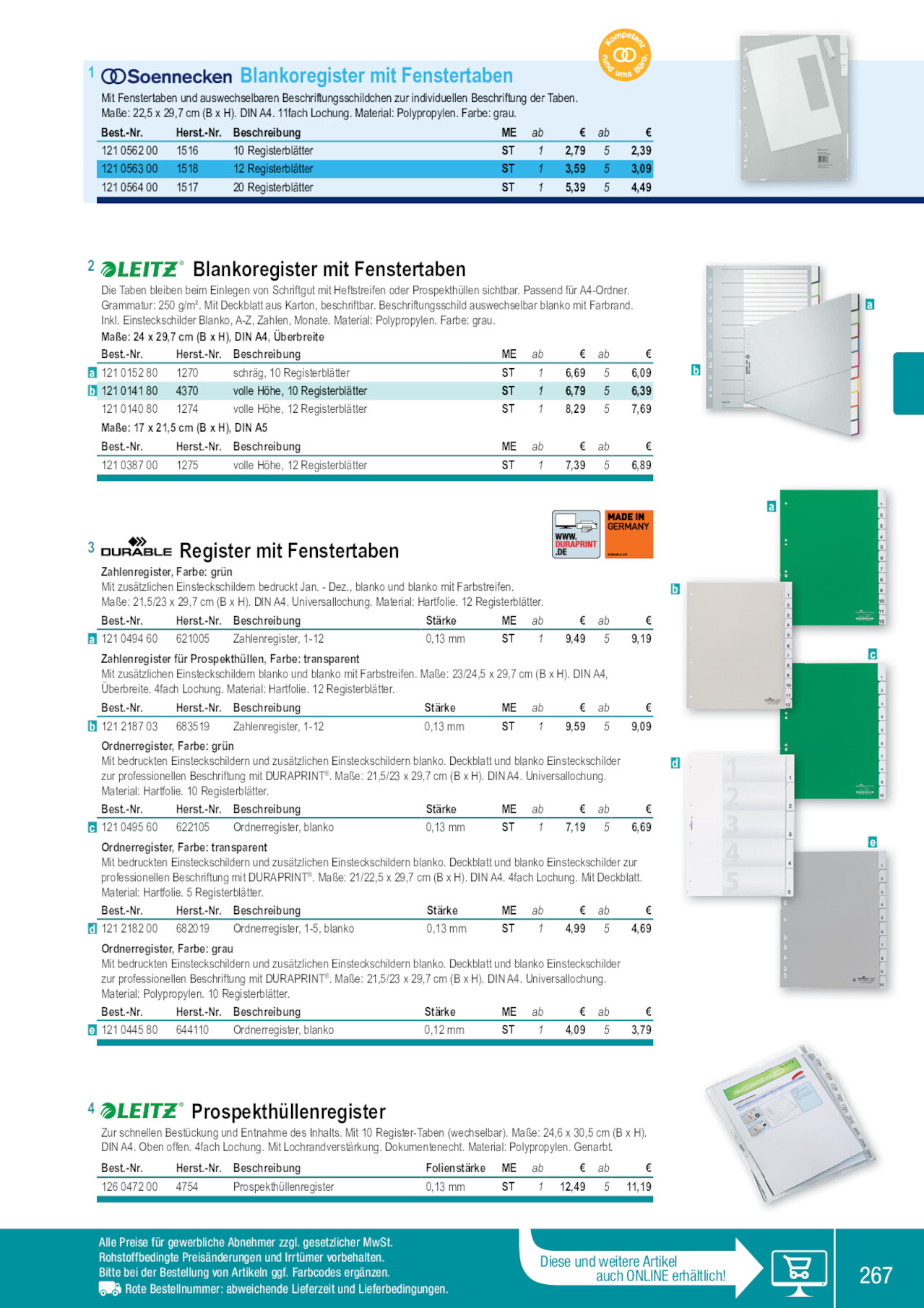 1 Blankoregister mit Fenstertaben Mit Fenstertaben und auswechselbaren Beschriftungsschildchen zur individuellen Beschriftung der Taben. Maße: 22,5 x 29,7 cm (B x H). DIN A4. 11fach Lochung. Material: Polypropylen. Farbe: grau. Best.-Nr. Herst.-Nr. Beschreibung ME ab € 121 0562 00 1516 10 Registerblätter ST 1 2,79 121 0563 00 1518 12 Registerblätter ST 1 3,59 121 0564 00 1517 20 Registerblätter ST 1 5,39 ab 5 5 5 € 2,39 3,09 4,49 2 Blankoregister mit Fenstertaben Die Taben bleiben beim Einlegen von Schriftgut mit Heftstreifen oder Prospekthüllen sichtbar. Passend für A4-Ordner. Grammatur: 250 g/m². Mit Deckblatt aus Karton, beschriftbar. Beschriftungsschild auswechselbar blanko mit Farbrand. Inkl. Einsteckschilder Blanko, A-Z, Zahlen, Monate. Material: Polypropylen. Farbe: grau. Maße: 24 x 29,7 cm (B x H), DIN A4, Überbreite Best.-Nr. Herst.-Nr. Beschreibung ME ab € ab € a 121 0152 80 1270 schräg, 10 Registerblätter ST 1 6,69 5 6,09 b 121 0141 80 4370 volle Höhe, 10 Registerblätter ST 1 6,79 5 6,39 121 0140 80 1274 volle Höhe, 12 Registerblätter ST 1 8,29 5 7,69 Maße: 17 x 21,5 cm (B x H), DIN A5 Best.-Nr. Herst.-Nr. Beschreibung ME ab € ab € 121 0387 00 1275 volle Höhe, 12 Registerblätter ST 1 7,39 5 6,89 b 3 Register mit Fenstertaben Zahlenregister, Farbe: grün Mit zusätzlichen Einsteckschildern bedruckt Jan. - Dez., blanko und blanko mit Farbstreifen. Maße: 21,5/23 x 29,7 cm (B x H). DIN A4. Universallochung. Material: Hartfolie. 12 Registerblätter. Best.-Nr. Herst.-Nr. Beschreibung Stärke ME ab € ab € a 121 0494 60 621005 Zahlenregister, 1-12 0,13 mm ST 1 9,49 5 9,19 Zahlenregister für Prospekthüllen, Farbe: transparent Mit zusätzlichen Einsteckschildern blanko und blanko mit Farbstreifen. Maße: 23/24,5 x 29,7 cm (B x H). DIN A4, Überbreite. 4fach Lochung. Material: Hartfolie. 12 Registerblätter. Best.-Nr. Herst.-Nr. Beschreibung Stärke ME ab € ab € b 121 2187 03 683519 Zahlenregister, 1-12 0,13 mm ST 1 9,59 5 9,09 Ordnerregister, Farbe: grün Mit bedruckten Einsteckschildern und zusätzlichen Einsteckschildern blanko. Deckblatt und blanko Einsteckschilder zur professionellen Beschriftung mit DURAPRINT®. Maße: 21,5/23 x 29,7 cm (B x H). DIN A4. Universallochung. Material: Hartfolie. 10 Registerblätter. Best.-Nr. Herst.-Nr. Beschreibung Stärke ME ab € ab € c 121 0495 60 622105 Ordnerregister, blanko 0,13 mm ST 1 7,19 5 6,69 Ordnerregister, Farbe: transparent Mit bedruckten Einsteckschildern und zusätzlichen Einsteckschildern blanko. Deckblatt und blanko Einsteckschilder zur professionellen Beschriftung mit DURAPRINT®. Maße: 21/22,5 x 29,7 cm (B x H). DIN A4. 4fach Lochung. Mit Deckblatt. Material: Hartfolie. 5 Registerblätter. Best.-Nr. Herst.-Nr. Beschreibung Stärke ME ab € ab € d 121 2182 00 682019 Ordnerregister, 1-5, blanko 0,13 mm ST 1 4,99 5 4,69 Ordnerregister, Farbe: grau Mit bedruckten Einsteckschildern und zusätzlichen Einsteckschildern blanko. Deckblatt und blanko Einsteckschilder zur professionellen Beschriftung mit DURAPRINT®. Maße: 21,5/23 x 29,7 cm (B x H). DIN A4. Universallochung. Material: Polypropylen. 10 Registerblätter. Best.-Nr. Herst.-Nr. Beschreibung Stärke ME ab € ab € e 121 0445 80 644110 Ordnerregister, blanko 0,12 mm ST 1 4,09 5 3,79 b d a 4 Prospekthüllenregister Zur schnellen Bestückung und Entnahme des Inhalts. Mit 10 Register-Taben (wechselbar). Maße: 24,6 x 30,5 cm (B x H). DIN A4. Oben offen. 4fach Lochung. Mit Lochrandverstärkung. Dokumentenecht. Material: Polypropylen. Genarbt. Best.-Nr. Herst.-Nr. Beschreibung Folienstärke ME ab € ab € 126 0472 00 4754 Prospekthüllenregister 0,13 mm ST 1 12,49 5 11,19 Alle Preise für gewerbliche Abnehmer zzgl. gesetzlicher MwSt. Rohstoffbedingte Preisänderungen und Irrtümer vorbehalten. Bitte bei der Bestellung von Artikeln ggf. Farbcodes ergänzen. Rote Bestellnummer: abweichende Lieferzeit und Lieferbedingungen. Diese und weitere Artikel auch ONLINE erhältlich! a c e 267 121014080 121218703 121049560 121056300 121015280 126047200 121218200 121014180 121049460 121044580 121038700 121056400 121056200