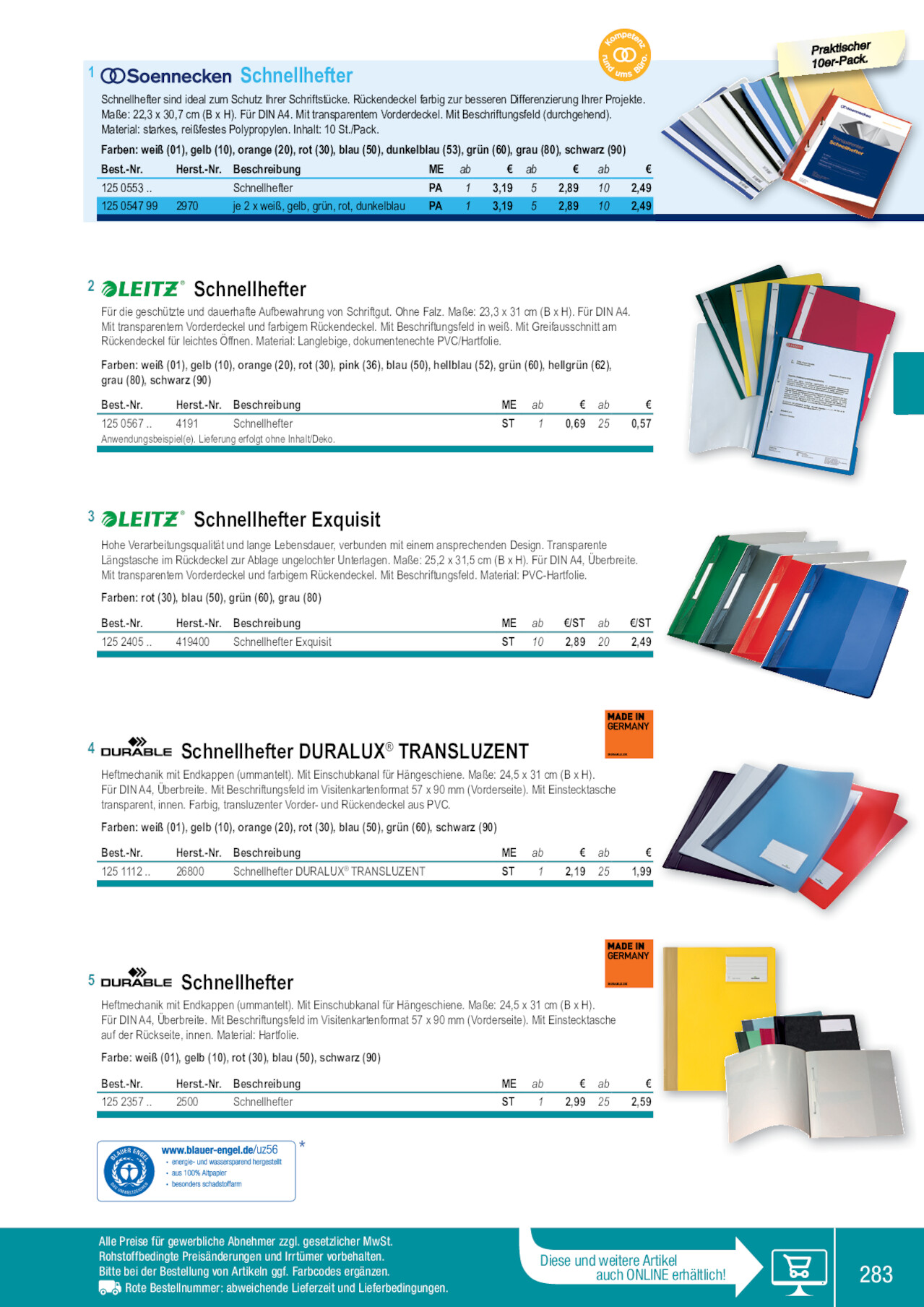 1 Schnellhefter Schnellhefter sind ideal zum Schutz Ihrer Schriftstücke. Rückendeckel farbig zur besseren Differenzierung Ihrer Projekte. Maße: 22,3 x 30,7 cm (B x H). Für DIN A4. Mit transparentem Vorderdeckel. Mit Beschriftungsfeld (durchgehend). Material: starkes, reißfestes Polypropylen. Inhalt: 10 St./Pack. Farben: weiß (01), gelb (10), orange (20), rot (30), blau (50), dunkelblau (53), grün (60), grau (80), schwarz (90) Best.-Nr. 125 0553 .. 125 0547 99 Herst.-Nr. Beschreibung Schnellhefter 2970 je 2 x weiß, gelb, grün, rot, dunkelblau ME ab PA 1 PA 1 € ab 3,19 5 3,19 5 € ab 2,89 10 2,89 10 € 2,49 2,49 2 Schnellhefter Für die geschützte und dauerhafte Aufbewahrung von Schriftgut. Ohne Falz. Maße: 23,3 x 31 cm (B x H). Für DIN A4. Mit transparentem Vorderdeckel und farbigem Rückendeckel. Mit Beschriftungsfeld in weiß. Mit Greifausschnitt am Rückendeckel für leichtes Öffnen. Material: Langlebige, dokumentenechte PVC/Hartfolie. Farben: weiß (01), gelb (10), orange (20), rot (30), pink (36), blau (50), hellblau (52), grün (60), hellgrün (62), grau (80), schwarz (90) Best.-Nr. Herst.-Nr. Beschreibung 125 0567 .. 4191 Schnellhefter Anwendungsbeispiel(e). Lieferung erfolgt ohne Inhalt/Deko. ME ab € ab € ST 1 0,69 25 0,57 3 Schnellhefter Exquisit Hohe Verarbeitungsqualität und lange Lebensdauer, verbunden mit einem ansprechenden Design. Transparente Längstasche im Rückdeckel zur Ablage ungelochter Unterlagen. Maße: 25,2 x 31,5 cm (B x H). Für DIN A4, Überbreite. Mit transparentem Vorderdeckel und farbigem Rückendeckel. Mit Beschriftungsfeld. Material: PVC-Hartfolie. Farben: rot (30), blau (50), grün (60), grau (80) Best.-Nr. 125 2405 .. Herst.-Nr. Beschreibung 419400 Schnellhefter Exquisit ME ab €/ST ab €/ST ST 10 2,89 20 2,49 P10raekr-tiPsacchke.r 4 Schnellhefter DURALUX® TRANSLUZENT Heftmechanik mit Endkappen (ummantelt). Mit Einschubkanal für Hängeschiene. Maße: 24,5 x 31 cm (B x H). Für DIN A4, Überbreite. Mit Beschriftungsfeld im Visitenkartenformat 57 x 90 mm (Vorderseite). Mit Einstecktasche transparent, innen. Farbig, transluzenter Vorder- und Rückendeckel aus PVC. Farben: weiß (01), gelb (10), orange (20), rot (30), blau (50), grün (60), schwarz (90) Best.-Nr. 125 1112 .. Herst.-Nr. Beschreibung 26800 Schnellhefter DURALUX® TRANSLUZENT ME ab € ab € ST 1 2,19 25 1,99 5 Schnellhefter Heftmechanik mit Endkappen (ummantelt). Mit Einschubkanal für Hängeschiene. Maße: 24,5 x 31 cm (B x H). Für DIN A4, Überbreite. Mit Beschriftungsfeld im Visitenkartenformat 57 x 90 mm (Vorderseite). Mit Einstecktasche auf der Rückseite, innen. Material: Hartfolie. Farbe: weiß (01), gelb (10), rot (30), blau (50), schwarz (90) Best.-Nr. 125 2357 .. Herst.-Nr. Beschreibung 2500 Schnellhefter ME ab € ab € ST 1 2,99 25 2,59 * Alle Preise für gewerbliche Abnehmer zzgl. gesetzlicher MwSt. Rohstoffbedingte Preisänderungen und Irrtümer vorbehalten. Bitte bei der Bestellung von Artikeln ggf. Farbcodes ergänzen. Rote Bestellnummer: abweichende Lieferzeit und Lieferbedingungen. Diese und weitere Artikel auch ONLINE erhältlich! 283 125235750 125240560 125235730 125235790 125055353 125240550 125240530 125111290 125235710 125111220 125056710 125111250 125056762 125054799 125111230 125055330 125055320 125055310 125056760 125056736 125055390 125056780 125056790 125056752 125111210 125055380 125111260 125235701 125056730 125056720 125056701 125055301 125055360 125111201 125056750 125240580 125055350