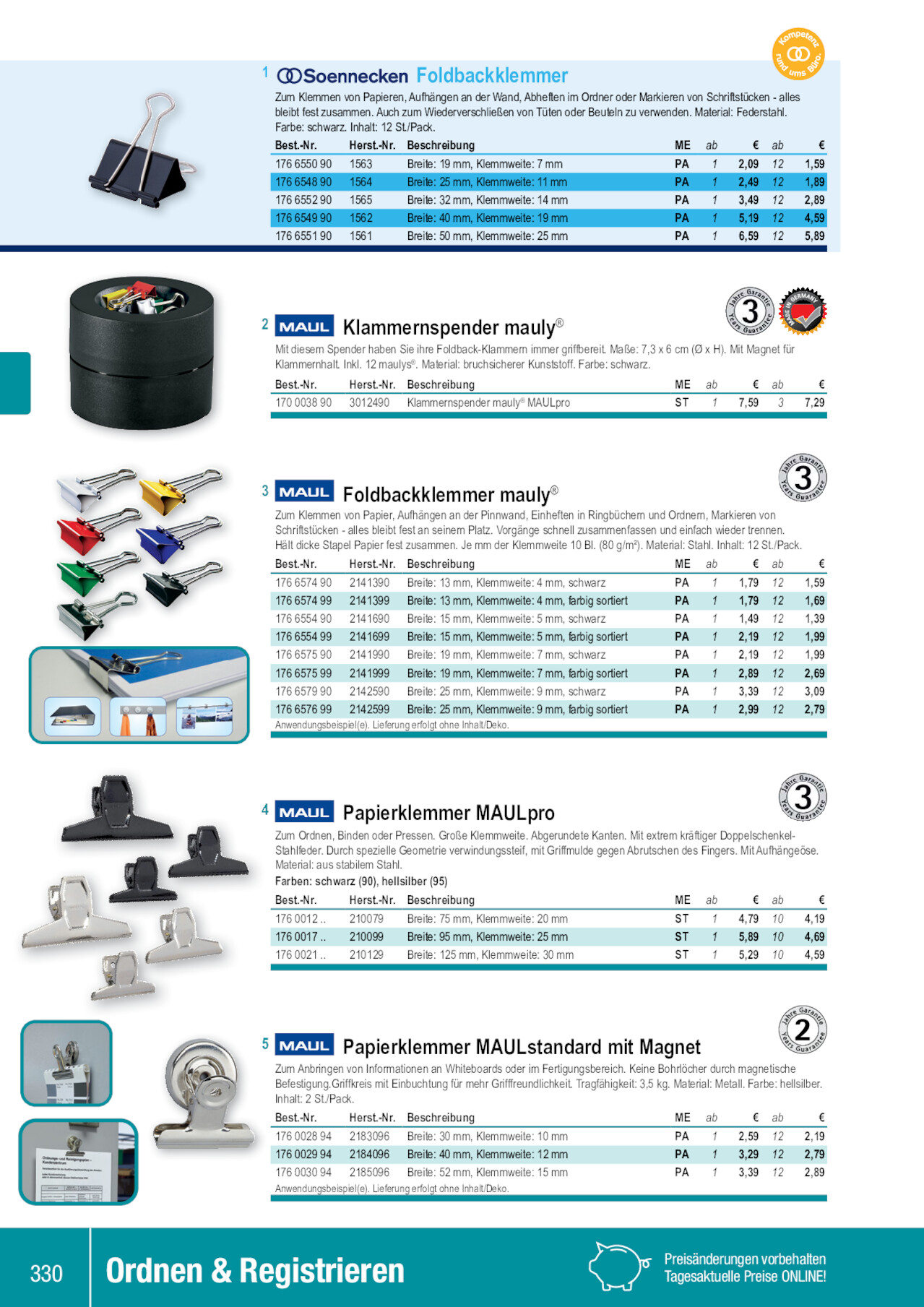 1 Foldbackklemmer Zum Klemmen von Papieren, Aufhängen an der Wand, Abheften im Ordner oder Markieren von Schriftstücken - alles bleibt fest zusammen. Auch zum Wiederverschließen von Tüten oder Beuteln zu verwenden. Material: Federstahl. Farbe: schwarz. Inhalt: 12 St./Pack. Best.-Nr. Herst.-Nr. Beschreibung ME ab € ab € 176 6550 90 1563 Breite: 19 mm, Klemmweite: 7 mm PA 1 2,09 12 1,59 176 6548 90 1564 Breite: 25 mm, Klemmweite: 11 mm PA 1 2,49 12 1,89 176 6552 90 1565 Breite: 32 mm, Klemmweite: 14 mm PA 1 3,49 12 2,89 176 6549 90 1562 Breite: 40 mm, Klemmweite: 19 mm PA 1 5,19 12 4,59 176 6551 90 1561 Breite: 50 mm, Klemmweite: 25 mm PA 1 6,59 12 5,89 2 Klammernspender mauly® Mit diesem Spender haben Sie ihre Foldback-Klammern immer griffbereit. Maße: 7,3 x 6 cm (Ø x H). Mit Magnet für Klammernhalt. Inkl. 12 maulys®. Material: bruchsicherer Kunststoff. Farbe: schwarz. Best.-Nr. Herst.-Nr. Beschreibung ME ab € ab € 170 0038 90 3012490 Klammernspender mauly® MAULpro ST 1 7,59 3 7,29 3 Foldbackklemmer mauly® Zum Klemmen von Papier, Aufhängen an der Pinnwand, Einheften in Ringbüchern und Ordnern, Markieren von Schriftstücken - alles bleibt fest an seinem Platz. Vorgänge schnell zusammenfassen und einfach wieder trennen. Hält dicke Stapel Papier fest zusammen. Je mm der Klemmweite 10 Bl. (80 g/m²). Material: Stahl. Inhalt: 12 St./Pack. Best.-Nr. Herst.-Nr. Beschreibung ME ab € ab € 176 6574 90 2141390 Breite: 13 mm, Klemmweite: 4 mm, schwarz PA 1 1,79 12 1,59 176 6574 99 2141399 Breite: 13 mm, Klemmweite: 4 mm, farbig sortiert PA 1 1,79 12 1,69 176 6554 90 2141690 Breite: 15 mm, Klemmweite: 5 mm, schwarz PA 1 1,49 12 1,39 176 6554 99 2141699 Breite: 15 mm, Klemmweite: 5 mm, farbig sortiert PA 1 2,19 12 1,99 176 6575 90 2141990 Breite: 19 mm, Klemmweite: 7 mm, schwarz PA 1 2,19 12 1,99 176 6575 99 2141999 Breite: 19 mm, Klemmweite: 7 mm, farbig sortiert PA 1 2,89 12 2,69 176 6579 90 2142590 Breite: 25 mm, Klemmweite: 9 mm, schwarz PA 1 3,39 12 3,09 176 6576 99 2142599 Breite: 25 mm, Klemmweite: 9 mm, farbig sortiert Anwendungsbeispiel(e). Lieferung erfolgt ohne Inhalt/Deko. PA 1 2,99 12 2,79 4 Papierklemmer MAULpro Zum Ordnen, Binden oder Pressen. Große Klemmweite. Abgerundete Kanten. Mit extrem kräftiger DoppelschenkelStahlfeder. Durch spezielle Geometrie verwindungssteif, mit Griffmulde gegen Abrutschen des Fingers. Mit Aufhängeöse. Material: aus stabilem Stahl. Farben: schwarz (90), hellsilber (95) Best.-Nr. Herst.-Nr. Beschreibung ME ab € ab € 176 0012 .. 210079 Breite: 75 mm, Klemmweite: 20 mm ST 1 4,79 10 4,19 176 0017 .. 210099 Breite: 95 mm, Klemmweite: 25 mm ST 1 5,89 10 4,69 176 0021 .. 210129 Breite: 125 mm, Klemmweite: 30 mm ST 1 5,29 10 4,59 5 Papierklemmer MAULstandard mit Magnet Zum Anbringen von Informationen an Whiteboards oder im Fertigungsbereich. Keine Bohrlöcher durch magnetische Befestigung.Griffkreis mit Einbuchtung für mehr Grifffreundlichkeit. Tragfähigkeit: 3,5 kg. Material: Metall. Farbe: hellsilber. Inhalt: 2 St./Pack. Best.-Nr. Herst.-Nr. Beschreibung ME ab € ab € 176 0028 94 2183096 Breite: 30 mm, Klemmweite: 10 mm PA 1 2,59 12 2,19 176 0029 94 2184096 Breite: 40 mm, Klemmweite: 12 mm PA 1 3,29 12 2,79 176 0030 94 2185096 Breite: 52 mm, Klemmweite: 15 mm Anwendungsbeispiel(e). Lieferung erfolgt ohne Inhalt/Deko. PA 1 3,39 12 2,89 330 Ordnen & Registrieren Preisänderungen vorbehalten Tagesaktuelle Preise ONLINE! 176657599 176001795 176655290 176002195 176657699 176002994 176655090 176657490 176655190 176655499 176003094 176654890 176001790 176657990 176001295 176001290 176657499 176655490 176002894 170003890 176657590 176002190 176654990