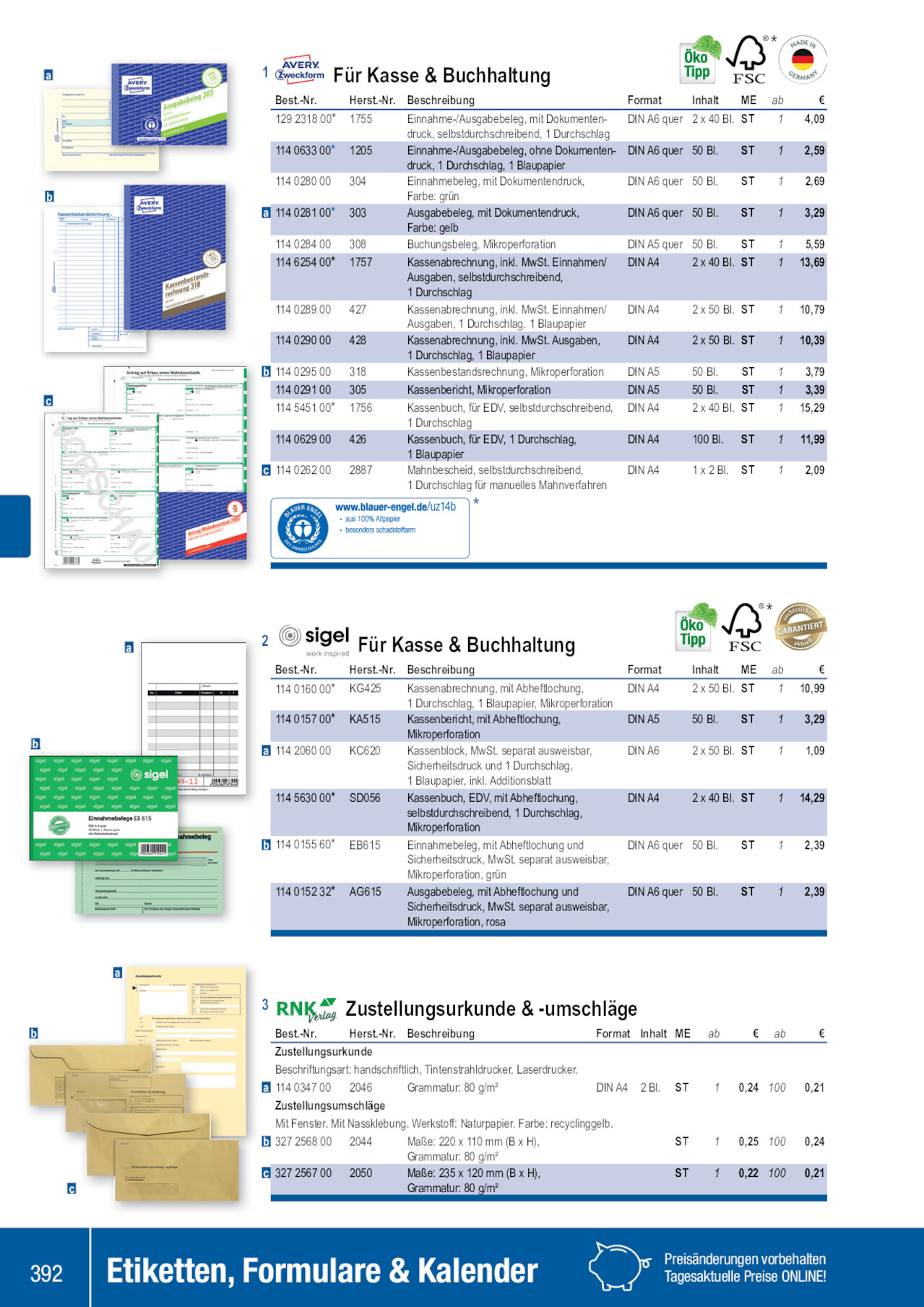 * a 1 Für Kasse & Buchhaltung Best.-Nr. Herst.-Nr. Beschreibung Format Inhalt ME ab € 129 2318 00* 1755 Einnahme-/Ausgabebeleg, mit Dokumenten- DIN A6 quer 2 x 40 Bl. ST 1 4,09 druck, selbstdurchschreibend, 1 Durchschlag 114 0633 00* 1205 Einnahme-/Ausgabebeleg, ohne Dokumenten- DIN A6 quer 50 Bl. ST 1 2,59 druck, 1 Durchschlag, 1 Blaupapier 114 0280 00 304 Einnahmebeleg, mit Dokumentendruck, DIN A6 quer 50 Bl. ST 1 2,69 b Farbe: grün a 114 0281 00* 303 Ausgabebeleg, mit Dokumentendruck, DIN A6 quer 50 Bl. ST 1 3,29 Farbe: gelb 114 0284 00 308 Buchungsbeleg, Mikroperforation DIN A5 quer 50 Bl. ST 1 5,59 114 6254 00* 1757 Kassenabrechnung, inkl. MwSt. Einnahmen/ Ausgaben, selbstdurchschreibend, 1 Durchschlag DIN A4 2 x 40 Bl. ST 1 13,69 114 0289 00 427 Kassenabrechnung, inkl. MwSt. Einnahmen/ DIN A4 Ausgaben, 1 Durchschlag, 1 Blaupapier 2 x 50 Bl. ST 1 10,79 114 0290 00 428 Kassenabrechnung, inkl. MwSt. Ausgaben, DIN A4 2 x 50 Bl. ST 1 10,39 1 Durchschlag, 1 Blaupapier b 114 0295 00 318 Kassenbestandsrechnung, Mikroperforation DIN A5 50 Bl. ST 1 3,79 114 0291 00 305 Kassenbericht, Mikroperforation DIN A5 50 Bl. ST 1 3,39 c 114 5451 00* 1756 Kassenbuch, für EDV, selbstdurchschreibend, DIN A4 2 x 40 Bl. ST 1 15,29 1 Durchschlag 114 0629 00 426 Kassenbuch, für EDV, 1 Durchschlag, 1 Blaupapier DIN A4 100 Bl. ST 1 11,99 c 114 0262 00 2887 Mahnbescheid, selbstdurchschreibend, DIN A4 1 Durchschlag für manuelles Mahnverfahren 1 x 2 Bl. ST 1 2,09 * a b a b c * 2 Für Kasse & Buchhaltung Best.-Nr. Herst.-Nr. Beschreibung Format Inhalt ME ab € 114 0160 00* KG425 114 0157 00* KA515 Kassenabrechnung, mit Abheftlochung, 1 Durchschlag, 1 Blaupapier, Mikroperforation Kassenbericht, mit Abheftlochung, Mikroperforation DIN A4 DIN A5 2 x 50 Bl. ST 1 10,99 50 Bl. ST 1 3,29 a 114 2060 00 KC620 Kassenblock, MwSt. separat ausweisbar, Sicherheitsdruck und 1 Durchschlag, 1 Blaupapier, inkl. Additionsblatt DIN A6 2 x 50 Bl. ST 1 1,09 114 5630 00* SD056 Kassenbuch, EDV, mit Abheftlochung, selbstdurchschreibend, 1 Durchschlag, Mikroperforation DIN A4 2 x 40 Bl. ST 1 14,29 b 114 0155 60* EB615 Einnahmebeleg, mit Abheftlochung und DIN A6 quer 50 Bl. ST 1 2,39 Sicherheitsdruck, MwSt. separat ausweisbar, Mikroperforation, grün 114 0152 32* AG615 Ausgabebeleg, mit Abheftlochung und DIN A6 quer 50 Bl. ST 1 2,39 Sicherheitsdruck, MwSt. separat ausweisbar, Mikroperforation, rosa 3 Zustellungsurkunde & -umschläge Best.-Nr. Herst.-Nr. Beschreibung Format Inhalt ME Zustellungsurkunde Beschriftungsart: handschriftlich, Tintenstrahldrucker, Laserdrucker. a 114 0347 00 2046 Grammatur: 80 g/m² DIN A4 2 Bl. ST Zustellungsumschläge Mit Fenster. Mit Nassklebung. Werkstoff: Naturpapier. Farbe: recyclinggelb. b 327 2568 00 2044 Maße: 220 x 110 mm (B x H), Grammatur: 80 g/m² ST c 327 2567 00 2050 Maße: 235 x 120 mm (B x H), Grammatur: 80 g/m² ST ab 1 1 1 € ab 0,24 100 0,25 100 0,22 100 € 0,21 0,24 0,21 392 Etiketten, Formulare & Kalender Preisänderungen vorbehalten Tagesaktuelle Preise ONLINE! 114028000 114026200 114625400 327256700 114028100 114015700 114016000 114015232 114028400 327256800 129231800 114063300 114062900 114029500 114029100 114563000 114545100 114029000 114015560 114206000 114034700 114028900