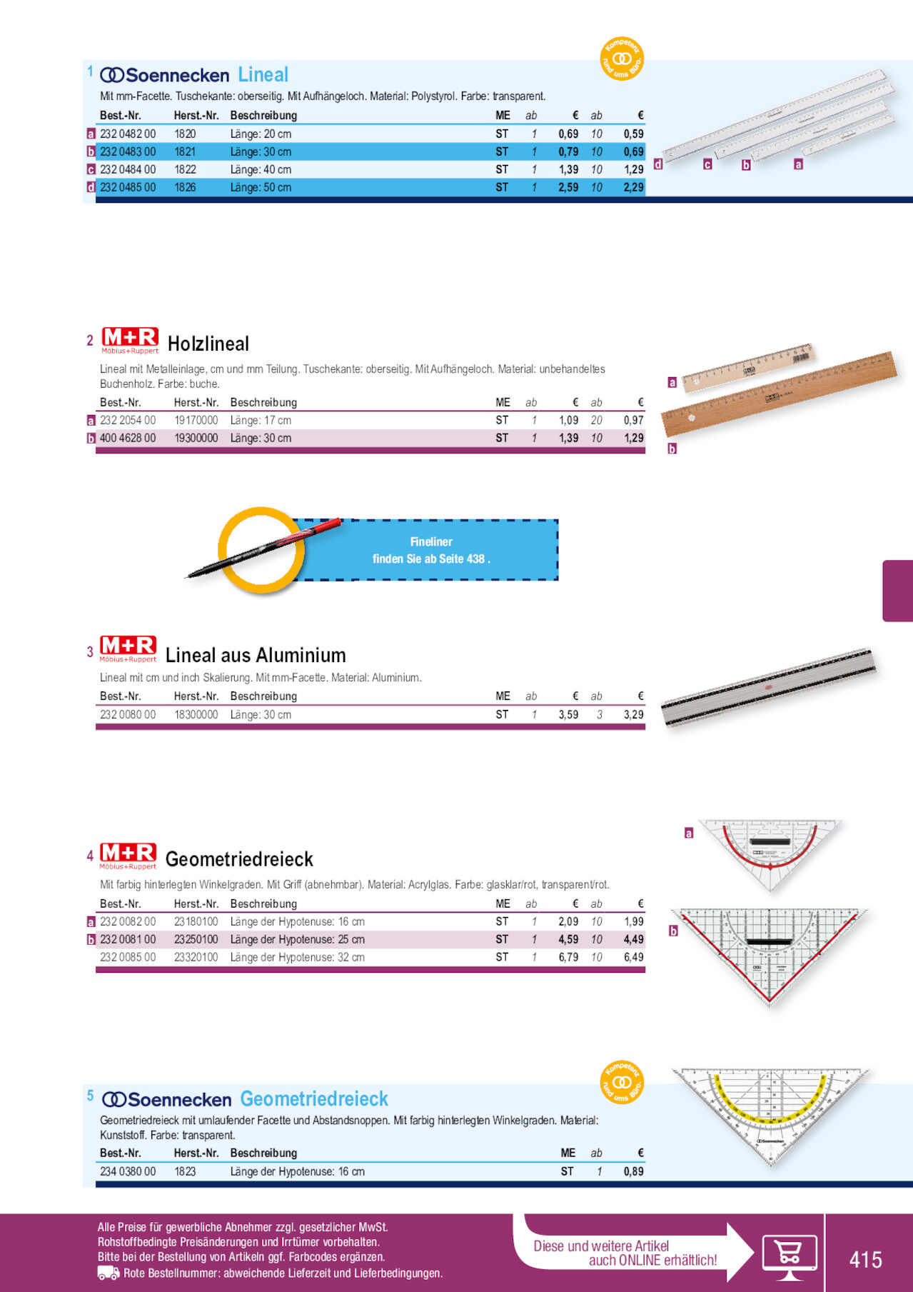 Seite 415: 1 Lineal Mit mm-Facette. Tuschekante: oberseitig. Mit Aufhängeloch. Material: Polystyrol. Farbe: transparent. Bes...