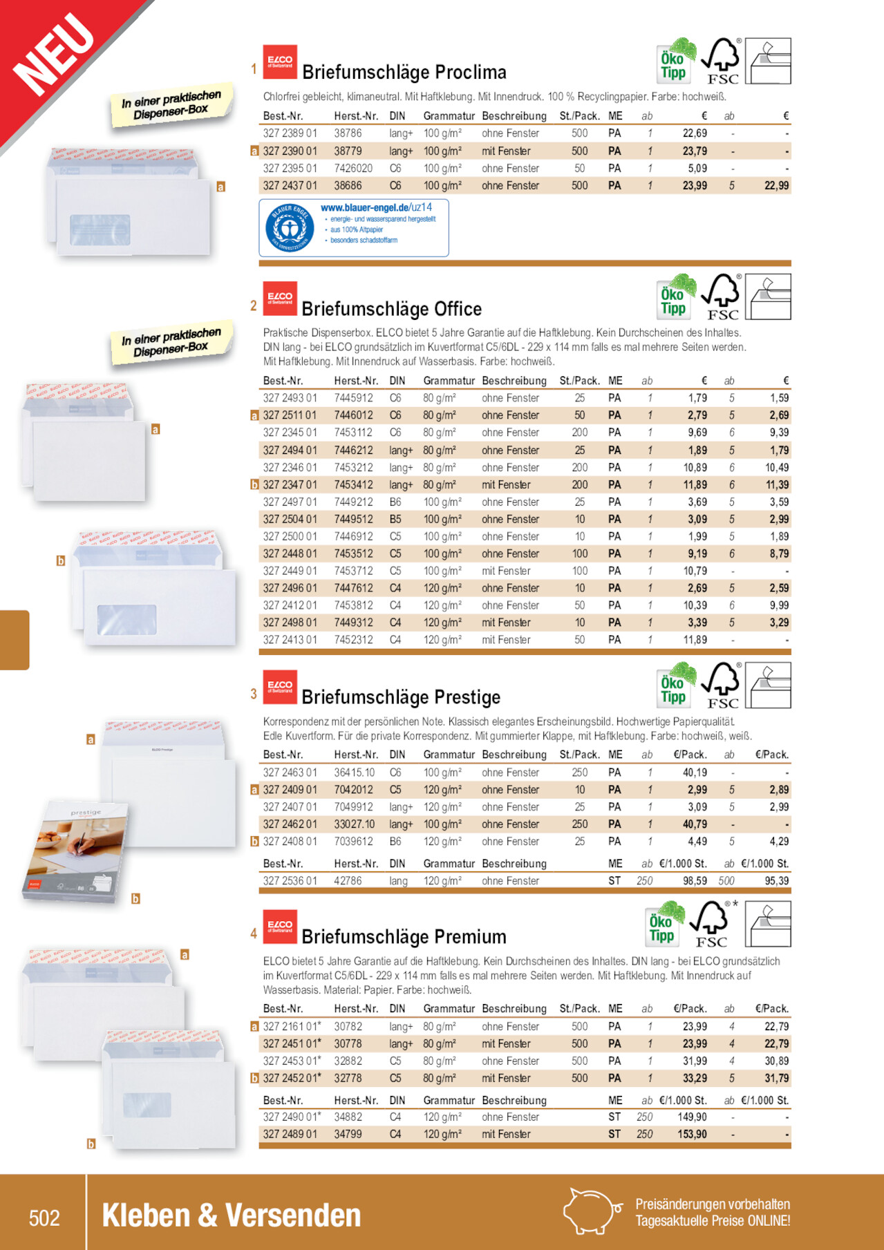 In Deiinseprenpsraekr-tBisocxhen a 1 Briefumschläge Proclima Chlorfrei gebleicht, klimaneutral. Mit Haftklebung. Mit Innendruck. 100 % Recyclingpapier. Farbe: hochweiß. Best.-Nr. 327 2389 01 a 327 2390 01 327 2395 01 327 2437 01 Herst.-Nr. 38786 38779 7426020 38686 DIN lang+ lang+ C6 C6 Grammatur Beschreibung 100 g/m² ohne Fenster 100 g/m² mit Fenster 100 g/m² ohne Fenster 100 g/m² ohne Fenster St./Pack. ME 500 PA 500 PA 50 PA 500 PA ab 1 1 1 1 € 22,69 23,79 5,09 23,99 ab 5 € 22,99 2 Briefumschläge Office In Deiinseprenpsraekr-tBisocxhen Praktische Dispenserbox. ELCO bietet 5 Jahre Garantie auf die Haftklebung. Kein Durchscheinen des Inhaltes. DIN lang - bei ELCO grundsätzlich im Kuvertformat C5/6DL - 229 x 114 mm falls es mal mehrere Seiten werden. Mit Haftklebung. Mit Innendruck auf Wasserbasis. Farbe: hochweiß. a b Best.-Nr. 327 2493 01 a 327 2511 01 327 2345 01 327 2494 01 327 2346 01 b 327 2347 01 327 2497 01 327 2504 01 327 2500 01 327 2448 01 327 2449 01 327 2496 01 327 2412 01 327 2498 01 327 2413 01 Herst.-Nr. 7445912 7446012 7453112 7446212 7453212 7453412 7449212 7449512 7446912 7453512 7453712 7447612 7453812 7449312 7452312 DIN C6 C6 C6 lang+ lang+ lang+ B6 B5 C5 C5 C5 C4 C4 C4 C4 Grammatur Beschreibung 80 g/m² ohne Fenster 80 g/m² ohne Fenster 80 g/m² ohne Fenster 80 g/m² ohne Fenster 80 g/m² ohne Fenster 80 g/m² mit Fenster 100 g/m² ohne Fenster 100 g/m² ohne Fenster 100 g/m² ohne Fenster 100 g/m² ohne Fenster 100 g/m² mit Fenster 120 g/m² ohne Fenster 120 g/m² ohne Fenster 120 g/m² mit Fenster 120 g/m² mit Fenster St./Pack. ME 25 PA 50 PA 200 PA 25 PA 200 PA 200 PA 25 PA 10 PA 10 PA 100 PA 100 PA 10 PA 50 PA 10 PA 50 PA ab 1 1 1 1 1 1 1 1 1 1 1 1 1 1 1 € 1,79 2,79 9,69 1,89 10,89 11,89 3,69 3,09 1,99 9,19 10,79 2,69 10,39 3,39 11,89 ab 5 5 6 5 6 6 5 5 5 6 5 6 5 - € 1,59 2,69 9,39 1,79 10,49 11,39 3,59 2,99 1,89 8,79 2,59 9,99 3,29 - a b a b 3 Briefumschläge Prestige Korrespondenz mit der persönlichen Note. Klassisch elegantes Erscheinungsbild. Hochwertige Papierqualität. Edle Kuvertform. Für die private Korrespondenz. Mit gummierter Klappe, mit Haftklebung. Farbe: hochweiß, weiß. Best.-Nr. Herst.-Nr. DIN Grammatur Beschreibung St./Pack. ME ab €/Pack. ab €/Pack. 327 2463 01 36415.10 C6 100 g/m² ohne Fenster 250 PA 1 40,19 - - a 327 2409 01 7042012 C5 120 g/m² ohne Fenster 10 PA 1 2,99 5 2,89 327 2407 01 7049912 lang+ 120 g/m² ohne Fenster 25 PA 1 3,09 5 2,99 327 2462 01 33027.10 lang+ 100 g/m² ohne Fenster 250 PA 1 40,79 - - b 327 2408 01 7039612 B6 120 g/m² ohne Fenster 25 PA 1 4,49 5 4,29 Best.-Nr. Herst.-Nr. DIN Grammatur Beschreibung 327 2536 01 42786 lang 120 g/m² ohne Fenster ME ab €/1.000 St. ab €/1.000 St. ST 250 98,59 500 95,39 * 4 Briefumschläge Premium ELCO bietet 5 Jahre Garantie auf die Haftklebung. Kein Durchscheinen des Inhaltes. DIN lang - bei ELCO grundsätzlich im Kuvertformat C5/6DL - 229 x 114 mm falls es mal mehrere Seiten werden. Mit Haftklebung. Mit Innendruck auf Wasserbasis. Material: Papier. Farbe: hochweiß. Best.-Nr. Herst.-Nr. DIN Grammatur Beschreibung St./Pack. ME ab €/Pack. ab €/Pack. a 327 2161 01* 327 2451 01* 327 2453 01* b 327 2452 01* 30782 30778 32882 32778 lang+ 80 g/m² lang+ 80 g/m² C5 80 g/m² C5 80 g/m² ohne Fenster mit Fenster ohne Fenster mit Fenster 500 PA 500 PA 500 PA 500 PA 1 1 1 1 23,99 23,99 31,99 33,29 4 4 4 5 22,79 22,79 30,89 31,79 Best.-Nr. 327 2490 01* 327 2489 01 Herst.-Nr. 34882 34799 DIN C4 C4 Grammatur Beschreibung 120 g/m² ohne Fenster 120 g/m² mit Fenster ME ab €/1.000 St. ST 250 149,90 ST 250 153,90 ab €/1.000 St. --- 502 Kleben & Versenden Preisänderungen vorbehalten Tagesaktuelle Preise ONLINE! 327234601 327250001 327249701 327241201 327240701 327240801 327241301 327251101 327246301 327246201 327239001 327245301 327253601 327249401 327239501 327249601 327243701 327245101 327250401 327249001 327240901 327216101 327245201 327234701 327244801 327248901 327234501 327238901 327244901 327249801 327249301