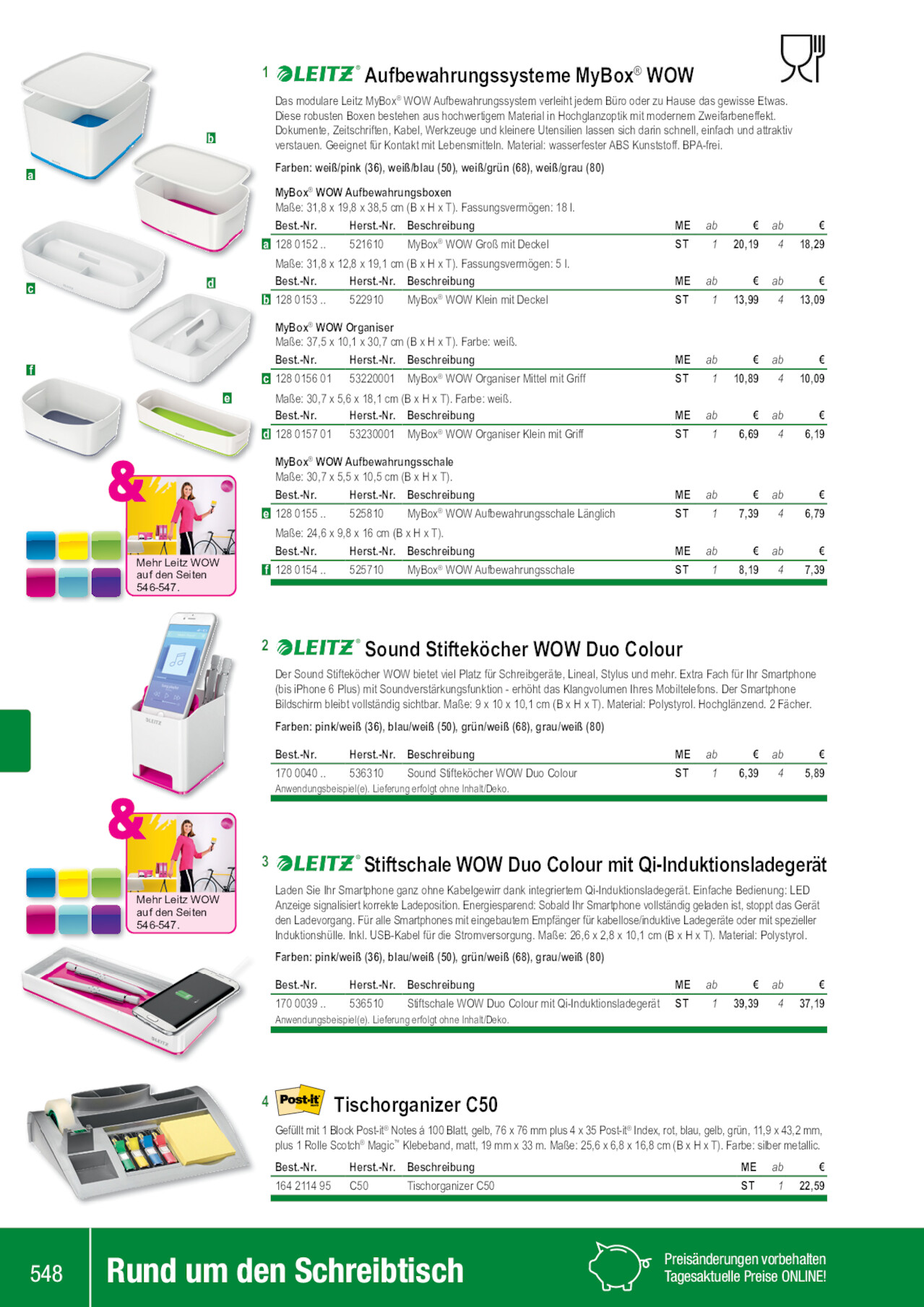 1 Aufbewahrungssysteme MyBox® WOW Das modulare Leitz MyBox® WOW Aufbewahrungssystem verleiht jedem Büro oder zu Hause das gewisse Etwas. Diese robusten Boxen bestehen aus hochwertigem Material in Hochglanzoptik mit modernem Zweifarbeneffekt. b Dokumente, Zeitschriften, Kabel, Werkzeuge und kleinere Utensilien lassen sich darin schnell, einfach und attraktiv verstauen. Geeignet für Kontakt mit Lebensmitteln. Material: wasserfester ABS Kunststoff. BPA-frei. a Farben: weiß/pink (36), weiß/blau (50), weiß/grün (68), weiß/grau (80) MyBox® WOW Aufbewahrungsboxen Maße: 31,8 x 19,8 x 38,5 cm (B x H x T). Fassungsvermögen: 18 l. Best.-Nr. Herst.-Nr. Beschreibung ME ab € ab € a 128 0152 .. 521610 MyBox® WOW Groß mit Deckel ST 1 20,19 4 18,29 Maße: 31,8 x 12,8 x 19,1 cm (B x H x T). Fassungsvermögen: 5 l. c d Best.-Nr. Herst.-Nr. Beschreibung ME ab € ab € b 128 0153 .. 522910 MyBox® WOW Klein mit Deckel ST 1 13,99 4 13,09 MyBox® WOW Organiser Maße: 37,5 x 10,1 x 30,7 cm (B x H x T). Farbe: weiß. Best.-Nr. Herst.-Nr. Beschreibung ME ab € ab € f c 128 0156 01 53220001 MyBox® WOW Organiser Mittel mit Griff ST 1 10,89 4 10,09 e Maße: 30,7 x 5,6 x 18,1 cm (B x H x T). Farbe: weiß. Best.-Nr. Herst.-Nr. Beschreibung ME ab € ab € d 128 0157 01 53230001 MyBox® WOW Organiser Klein mit Griff ST 1 6,69 4 6,19 Mehr Leitz WOW auf den Seiten 546-547. MyBox® WOW Aufbewahrungsschale Maße: 30,7 x 5,5 x 10,5 cm (B x H x T). Best.-Nr. Herst.-Nr. Beschreibung e 128 0155 .. 525810 MyBox® WOW Aufbewahrungsschale Länglich Maße: 24,6 x 9,8 x 16 cm (B x H x T). Best.-Nr. Herst.-Nr. Beschreibung f 128 0154 .. 525710 MyBox® WOW Aufbewahrungsschale ME ab € ab € ST 1 7,39 4 6,79 ME ab € ab € ST 1 8,19 4 7,39 2 Sound Stifteköcher WOW Duo Colour Der Sound Stifteköcher WOW bietet viel Platz für Schreibgeräte, Lineal, Stylus und mehr. Extra Fach für Ihr Smartphone (bis iPhone 6 Plus) mit Soundverstärkungsfunktion - erhöht das Klangvolumen Ihres Mobiltelefons. Der Smartphone Bildschirm bleibt vollständig sichtbar. Maße: 9 x 10 x 10,1 cm (B x H x T). Material: Polystyrol. Hochglänzend. 2 Fächer. Farben: pink/weiß (36), blau/weiß (50), grün/weiß (68), grau/weiß (80) Best.-Nr. Herst.-Nr. Beschreibung 170 0040 .. 536310 Sound Stifteköcher WOW Duo Colour Anwendungsbeispiel(e). Lieferung erfolgt ohne Inhalt/Deko. ME ab € ab € ST 1 6,39 4 5,89 Mehr Leitz WOW auf den Seiten 546-547. 3 Stiftschale WOW Duo Colour mit Qi-Induktionsladegerät Laden Sie Ihr Smartphone ganz ohne Kabelgewirr dank integriertem Qi-Induktionsladegerät. Einfache Bedienung: LED Anzeige signalisiert korrekte Ladeposition. Energiesparend: Sobald Ihr Smartphone vollständig geladen ist, stoppt das Gerät den Ladevorgang. Für alle Smartphones mit eingebautem Empfänger für kabellose/induktive Ladegeräte oder mit spezieller Induktionshülle. Inkl. USB-Kabel für die Stromversorgung. Maße: 26,6 x 2,8 x 10,1 cm (B x H x T). Material: Polystyrol. Farben: pink/weiß (36), blau/weiß (50), grün/weiß (68), grau/weiß (80) Best.-Nr. Herst.-Nr. Beschreibung ME ab € ab € 170 0039 .. 536510 Stiftschale WOW Duo Colour mit Qi-Induktionsladegerät ST 1 39,39 4 37,19 Anwendungsbeispiel(e). Lieferung erfolgt ohne Inhalt/Deko. 4 Tischorganizer C50 Gefüllt mit 1 Block Post-it® Notes á 100 Blatt, gelb, 76 x 76 mm plus 4 x 35 Post-it® Index, rot, blau, gelb, grün, 11,9 x 43,2 mm, plus 1 Rolle Scotch® Magic™ Klebeband, matt, 19 mm x 33 m. Maße: 25,6 x 6,8 x 16,8 cm (B x H x T). Farbe: silber metallic. Best.-Nr. Herst.-Nr. Beschreibung 164 2114 95 C50 Tischorganizer C50 ME ab € ST 1 22,59 548 Rund um den Schreibtisch Preisänderungen vorbehalten Tagesaktuelle Preise ONLINE! 128015336 128015236 128015368 128015550 128015450 128015380 128015250 170003950 128015568 164211495 128015701 128015350 128015268 128015468 128015480 128015436 128015580 128015536