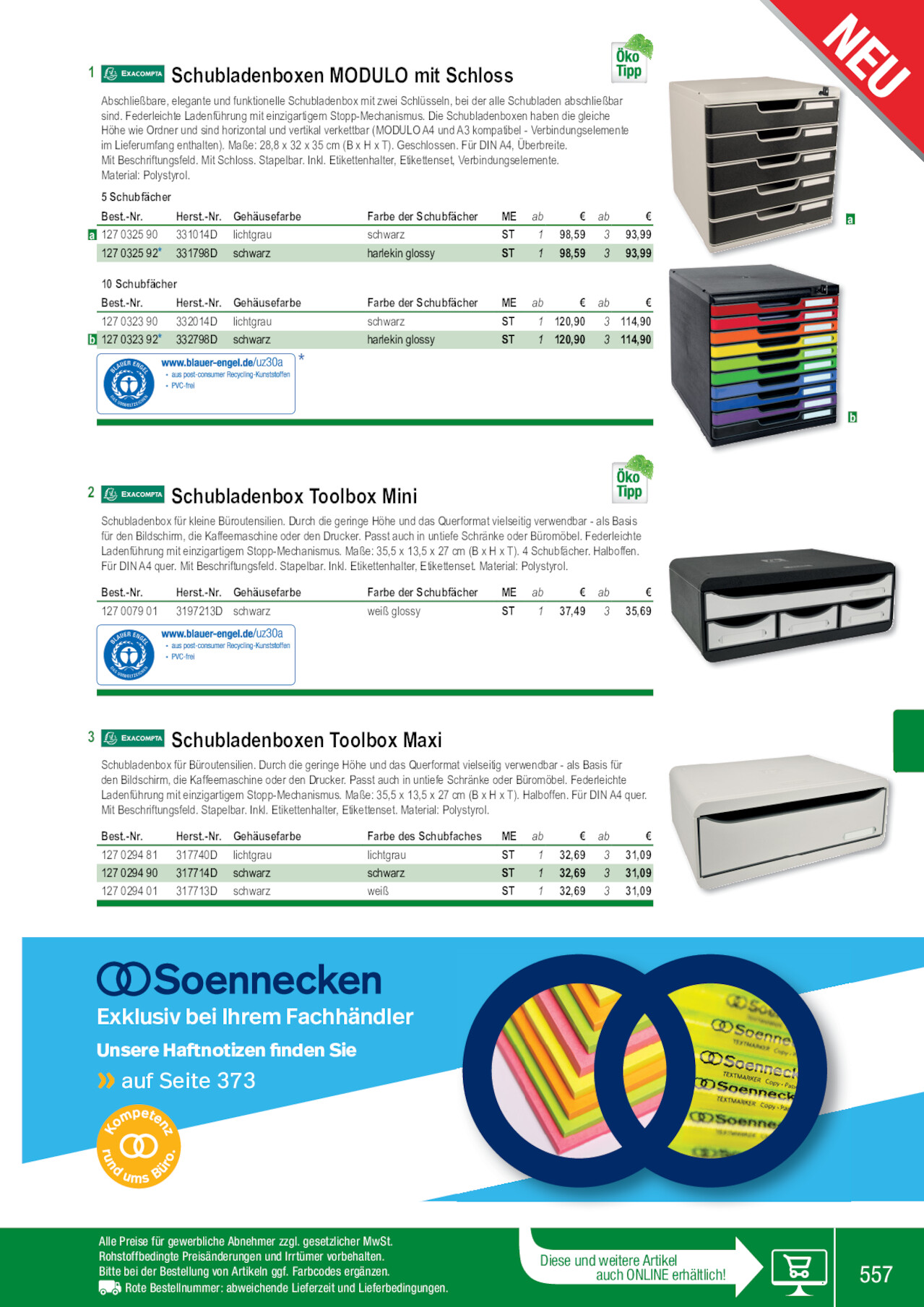 1 Schubladenboxen MODULO mit Schloss Abschließbare, elegante und funktionelle Schubladenbox mit zwei Schlüsseln, bei der alle Schubladen abschließbar sind. Federleichte Ladenführung mit einzigartigem Stopp-Mechanismus. Die Schubladenboxen haben die gleiche Höhe wie Ordner und sind horizontal und vertikal verkettbar (MODULO A4 und A3 kompatibel - Verbindungselemente im Lieferumfang enthalten). Maße: 28,8 x 32 x 35 cm (B x H x T). Geschlossen. Für DIN A4, Überbreite. Mit Beschriftungsfeld. Mit Schloss. Stapelbar. Inkl. Etikettenhalter, Etikettenset, Verbindungselemente. Material: Polystyrol. 5 Schubfächer Best.-Nr. Herst.-Nr. Gehäusefarbe a 127 0325 90 331014D lichtgrau 127 0325 92* 331798D schwarz Farbe der Schubfächer schwarz harlekin glossy ME ab € ab € ST 1 98,59 3 93,99 ST 1 98,59 3 93,99 10 Schubfächer Best.-Nr. Herst.-Nr. 127 0323 90 332014D b 127 0323 92* 332798D Gehäusefarbe lichtgrau schwarz * Farbe der Schubfächer schwarz harlekin glossy ME ab € ab € ST 1 120,90 3 114,90 ST 1 120,90 3 114,90 2 Schubladenbox Toolbox Mini Schubladenbox für kleine Büroutensilien. Durch die geringe Höhe und das Querformat vielseitig verwendbar - als Basis für den Bildschirm, die Kaffeemaschine oder den Drucker. Passt auch in untiefe Schränke oder Büromöbel. Federleichte Ladenführung mit einzigartigem Stopp-Mechanismus. Maße: 35,5 x 13,5 x 27 cm (B x H x T). 4 Schubfächer. Halboffen. Für DIN A4 quer. Mit Beschriftungsfeld. Stapelbar. Inkl. Etikettenhalter, Etikettenset. Material: Polystyrol. Best.-Nr. Herst.-Nr. Gehäusefarbe 127 0079 01 3197213D schwarz Farbe der Schubfächer weiß glossy ME ab € ab € ST 1 37,49 3 35,69 3 Schubladenboxen Toolbox Maxi Schubladenbox für Büroutensilien. Durch die geringe Höhe und das Querformat vielseitig verwendbar - als Basis für den Bildschirm, die Kaffeemaschine oder den Drucker. Passt auch in untiefe Schränke oder Büromöbel. Federleichte Ladenführung mit einzigartigem Stopp-Mechanismus. Maße: 35,5 x 13,5 x 27 cm (B x H x T). Halboffen. Für DIN A4 quer. Mit Beschriftungsfeld. Stapelbar. Inkl. Etikettenhalter, Etikettenset. Material: Polystyrol. Best.-Nr. 127 0294 81 127 0294 90 127 0294 01 Herst.-Nr. 317740D 317714D 317713D Gehäusefarbe lichtgrau schwarz schwarz Farbe des Schubfaches lichtgrau schwarz weiß ME ab € ab € ST 1 32,69 3 31,09 ST 1 32,69 3 31,09 ST 1 32,69 3 31,09 Exklusiv bei Ihrem Fachhändler »Unsere Haftnotizen finden Sie auf Seite 373 a b Alle Preise für gewerbliche Abnehmer zzgl. gesetzlicher MwSt. Rohstoffbedingte Preisänderungen und Irrtümer vorbehalten. Bitte bei der Bestellung von Artikeln ggf. Farbcodes ergänzen. Rote Bestellnummer: abweichende Lieferzeit und Lieferbedingungen. Diese und weitere Artikel auch ONLINE erhältlich! 557 127029481 127032392 127029401 127032592 127032590 127007901 127029490 127032390