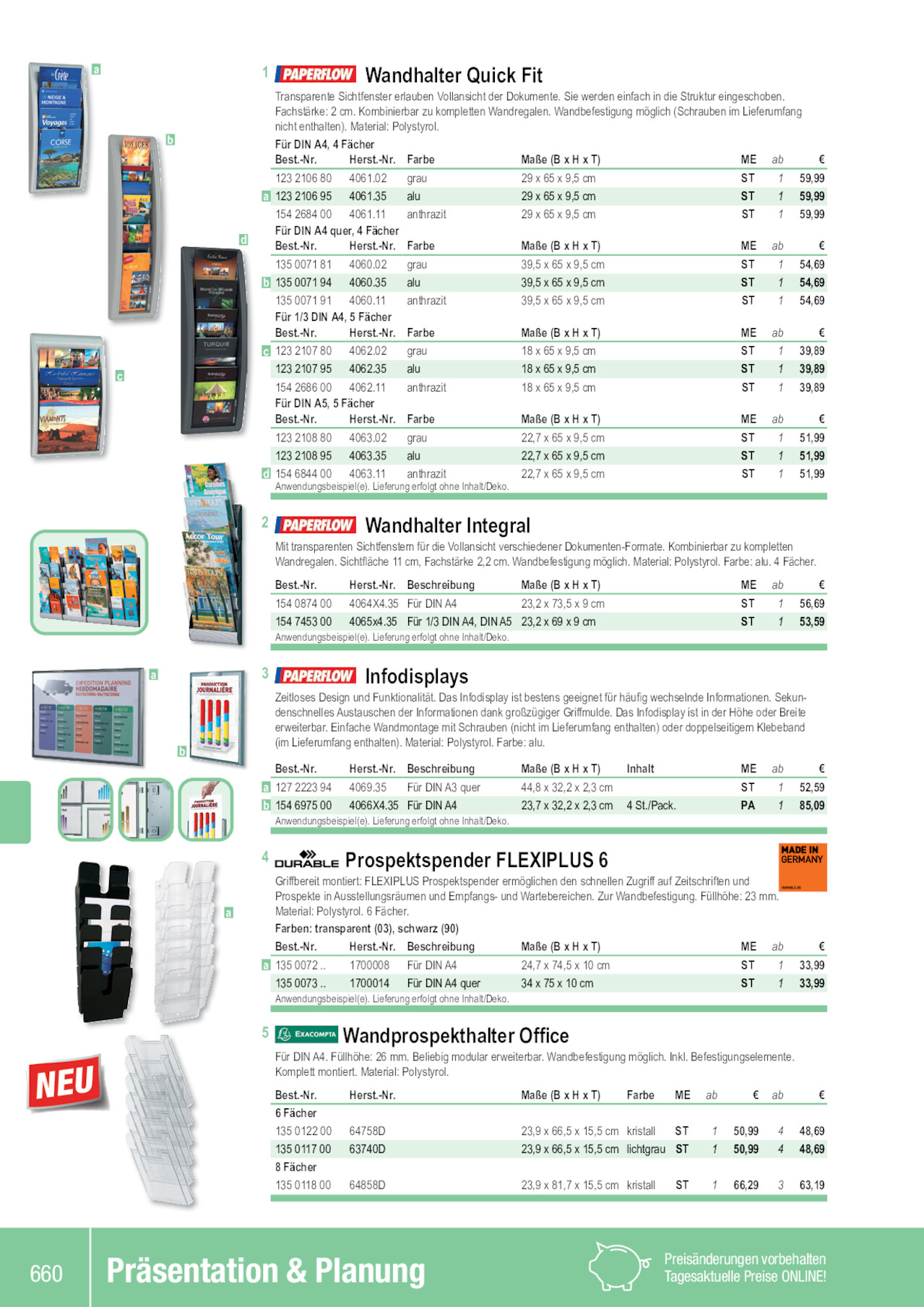 a b c a b 1 Wandhalter Quick Fit Transparente Sichtfenster erlauben Vollansicht der Dokumente. Sie werden einfach in die Struktur eingeschoben. Fachstärke: 2 cm. Kombinierbar zu kompletten Wandregalen. Wandbefestigung möglich (Schrauben im Lieferumfang nicht enthalten). Material: Polystyrol. Für DIN A4, 4 Fächer Best.-Nr. Herst.-Nr. Farbe Maße (B x H x T) ME ab € 123 2106 80 4061.02 grau 29 x 65 x 9,5 cm ST 1 59,99 a 123 2106 95 4061.35 alu 29 x 65 x 9,5 cm ST 1 59,99 154 2684 00 4061.11 anthrazit 29 x 65 x 9,5 cm ST 1 59,99 d Für DIN A4 quer, 4 Fächer Best.-Nr. Herst.-Nr. Farbe Maße (B x H x T) ME ab € 135 0071 81 4060.02 grau 39,5 x 65 x 9,5 cm ST 1 54,69 b 135 0071 94 4060.35 alu 39,5 x 65 x 9,5 cm ST 1 54,69 135 0071 91 4060.11 anthrazit 39,5 x 65 x 9,5 cm ST 1 54,69 Für 1/3 DIN A4, 5 Fächer Best.-Nr. Herst.-Nr. Farbe Maße (B x H x T) ME ab € c 123 2107 80 4062.02 grau 18 x 65 x 9,5 cm ST 1 39,89 123 2107 95 4062.35 alu 18 x 65 x 9,5 cm ST 1 39,89 154 2686 00 4062.11 anthrazit 18 x 65 x 9,5 cm ST 1 39,89 Für DIN A5, 5 Fächer Best.-Nr. Herst.-Nr. Farbe Maße (B x H x T) ME ab € 123 2108 80 4063.02 grau 22,7 x 65 x 9,5 cm ST 1 51,99 123 2108 95 4063.35 alu 22,7 x 65 x 9,5 cm ST 1 51,99 d 154 6844 00 4063.11 anthrazit 22,7 x 65 x 9,5 cm Anwendungsbeispiel(e). Lieferung erfolgt ohne Inhalt/Deko. ST 1 51,99 2 Wandhalter Integral Mit transparenten Sichtfenstern für die Vollansicht verschiedener Dokumenten-Formate. Kombinierbar zu kompletten Wandregalen. Sichtfläche 11 cm, Fachstärke 2,2 cm. Wandbefestigung möglich. Material: Polystyrol. Farbe: alu. 4 Fächer. Best.-Nr. Herst.-Nr. Beschreibung Maße (B x H x T) 154 0874 00 4064X4.35 Für DIN A4 23,2 x 73,5 x 9 cm 154 7453 00 4065x4.35 Für 1/3 DIN A4, DIN A5 23,2 x 69 x 9 cm Anwendungsbeispiel(e). Lieferung erfolgt ohne Inhalt/Deko. ME ab € ST 1 56,69 ST 1 53,59 3 Infodisplays Zeitloses Design und Funktionalität. Das Infodisplay ist bestens geeignet für häufig wechselnde Informationen. Sekundenschnelles Austauschen der Informationen dank großzügiger Griffmulde. Das Infodisplay ist in der Höhe oder Breite erweiterbar. Einfache Wandmontage mit Schrauben (nicht im Lieferumfang enthalten) oder doppelseitigem Klebeband (im Lieferumfang enthalten). Material: Polystyrol. Farbe: alu. Best.-Nr. Herst.-Nr. Beschreibung a 127 2223 94 4069.35 Für DIN A3 quer b 154 6975 00 4066X4.35 Für DIN A4 Anwendungsbeispiel(e). Lieferung erfolgt ohne Inhalt/Deko. Maße (B x H x T) 44,8 x 32,2 x 2,3 cm 23,7 x 32,2 x 2,3 cm Inhalt 4 St./Pack. ME ab € ST 1 52,59 PA 1 85,09 4 Prospektspender FLEXIPLUS 6 Griffbereit montiert: FLEXIPLUS Prospektspender ermöglichen den schnellen Zugriff auf Zeitschriften und Prospekte in Ausstellungsräumen und Empfangs- und Wartebereichen. Zur Wandbefestigung. Füllhöhe: 23 mm. a Material: Polystyrol. 6 Fächer. Farben: transparent (03), schwarz (90) Best.-Nr. Herst.-Nr. Beschreibung Maße (B x H x T) ME ab € a 135 0072 .. 1700008 Für DIN A4 24,7 x 74,5 x 10 cm ST 1 33,99 135 0073 .. 1700014 Für DIN A4 quer 34 x 75 x 10 cm Anwendungsbeispiel(e). Lieferung erfolgt ohne Inhalt/Deko. ST 1 33,99 5 Wandprospekthalter Office Für DIN A4. Füllhöhe: 26 mm. Beliebig modular erweiterbar. Wandbefestigung möglich. Inkl. Befestigungselemente. Komplett montiert. Material: Polystyrol. Best.-Nr. 6 Fächer 135 0122 00 135 0117 00 8 Fächer 135 0118 00 Herst.-Nr. 64758D 63740D 64858D Maße (B x H x T) Farbe ME ab € ab € 23,9 x 66,5 x 15,5 cm kristall ST 23,9 x 66,5 x 15,5 cm lichtgrau ST 1 50,99 4 48,69 1 50,99 4 48,69 23,9 x 81,7 x 15,5 cm kristall ST 1 66,29 3 63,19 660 Präsentation & Planung Preisänderungen vorbehalten Tagesaktuelle Preise ONLINE! 123210795 154684400 123210880 135007203 135007194 123210780 123210895 135007303 127222394 154087400 135007290 135007390 135012200 154268400 135011700 123210680 123210695 154745300 135011800 135007181 154268600 135007191 154697500