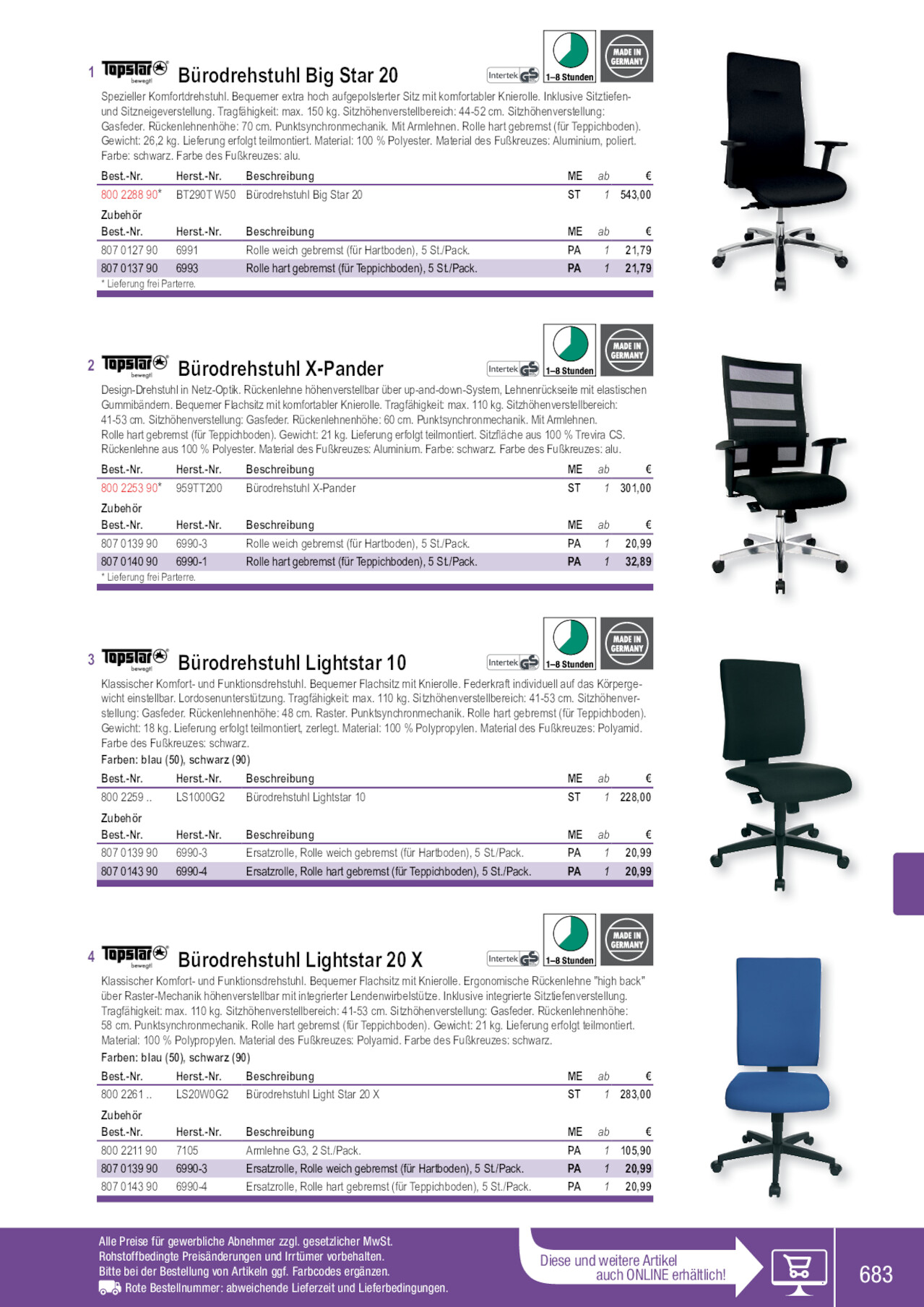 1 Bürodrehstuhl Big Star 20 Spezieller Komfortdrehstuhl. Bequemer extra hoch aufgepolsterter Sitz mit komfortabler Knierolle. Inklusive Sitztiefenund Sitzneigeverstellung. Tragfähigkeit: max. 150 kg. Sitzhöhenverstellbereich: 44-52 cm. Sitzhöhenverstellung: Gasfeder. Rückenlehnenhöhe: 70 cm. Punktsynchronmechanik. Mit Armlehnen. Rolle hart gebremst (für Teppichboden). Gewicht: 26,2 kg. Lieferung erfolgt teilmontiert. Material: 100 % Polyester. Material des Fußkreuzes: Aluminium, poliert. Farbe: schwarz. Farbe des Fußkreuzes: alu. Best.-Nr. Herst.-Nr. Beschreibung 800 2288 90* BT290T W50 Bürodrehstuhl Big Star 20 ME ab € ST 1 543,00 Zubehör Best.-Nr. Herst.-Nr. Beschreibung ME ab € 807 0127 90 6991 Rolle weich gebremst (für Hartboden), 5 St./Pack. PA 1 21,79 807 0137 90 6993 * Lieferung frei Parterre. Rolle hart gebremst (für Teppichboden), 5 St./Pack. PA 1 21,79 2 Bürodrehstuhl X-Pander Design-Drehstuhl in Netz-Optik. Rückenlehne höhenverstellbar über up-and-down-System, Lehnenrückseite mit elastischen Gummibändern. Bequemer Flachsitz mit komfortabler Knierolle. Tragfähigkeit: max. 110 kg. Sitzhöhenverstellbereich: 41-53 cm. Sitzhöhenverstellung: Gasfeder. Rückenlehnenhöhe: 60 cm. Punktsynchronmechanik. Mit Armlehnen. Rolle hart gebremst (für Teppichboden). Gewicht: 21 kg. Lieferung erfolgt teilmontiert. Sitzfläche aus 100 % Trevira CS. Rückenlehne aus 100 % Polyester. Material des Fußkreuzes: Aluminium. Farbe: schwarz. Farbe des Fußkreuzes: alu. Best.-Nr. Herst.-Nr. 800 2253 90* 959TT200 Beschreibung Bürodrehstuhl X-Pander ME ab € ST 1 301,00 Zubehör Best.-Nr. Herst.-Nr. Beschreibung ME ab € 807 0139 90 6990-3 Rolle weich gebremst (für Hartboden), 5 St./Pack. PA 1 20,99 807 0140 90 6990-1 * Lieferung frei Parterre. Rolle hart gebremst (für Teppichboden), 5 St./Pack. PA 1 32,89 3 Bürodrehstuhl Lightstar 10 Klassischer Komfort- und Funktionsdrehstuhl. Bequemer Flachsitz mit Knierolle. Federkraft individuell auf das Körpergewicht einstellbar. Lordosenunterstützung. Tragfähigkeit: max. 110 kg. Sitzhöhenverstellbereich: 41-53 cm. Sitzhöhenverstellung: Gasfeder. Rückenlehnenhöhe: 48 cm. Raster. Punktsynchronmechanik. Rolle hart gebremst (für Teppichboden). Gewicht: 18 kg. Lieferung erfolgt teilmontiert, zerlegt. Material: 100 % Polypropylen. Material des Fußkreuzes: Polyamid. Farbe des Fußkreuzes: schwarz. Farben: blau (50), schwarz (90) Best.-Nr. Herst.-Nr. Beschreibung ME ab € 800 2259 .. LS1000G2 Bürodrehstuhl Lightstar 10 ST 1 228,00 Zubehör Best.-Nr. Herst.-Nr. Beschreibung ME ab € 807 0139 90 6990-3 Ersatzrolle, Rolle weich gebremst (für Hartboden), 5 St./Pack. PA 1 20,99 807 0143 90 6990-4 Ersatzrolle, Rolle hart gebremst (für Teppichboden), 5 St./Pack. PA 1 20,99 4 Bürodrehstuhl Lightstar 20 X Klassischer Komfort- und Funktionsdrehstuhl. Bequemer Flachsitz mit Knierolle. Ergonomische Rückenlehne "high back" über Raster-Mechanik höhenverstellbar mit integrierter Lendenwirbelstütze. Inklusive integrierte Sitztiefenverstellung. Tragfähigkeit: max. 110 kg. Sitzhöhenverstellbereich: 41-53 cm. Sitzhöhenverstellung: Gasfeder. Rückenlehnenhöhe: 58 cm. Punktsynchronmechanik. Rolle hart gebremst (für Teppichboden). Gewicht: 21 kg. Lieferung erfolgt teilmontiert. Material: 100 % Polypropylen. Material des Fußkreuzes: Polyamid. Farbe des Fußkreuzes: schwarz. Farben: blau (50), schwarz (90) Best.-Nr. Herst.-Nr. Beschreibung ME ab € 800 2261 .. LS20W0G2 Bürodrehstuhl Light Star 20 X ST 1 283,00 Zubehör Best.-Nr. Herst.-Nr. Beschreibung ME ab € 800 2211 90 7105 Armlehne G3, 2 St./Pack. PA 1 105,90 807 0139 90 6990-3 Ersatzrolle, Rolle weich gebremst (für Hartboden), 5 St./Pack. PA 1 20,99 807 0143 90 6990-4 Ersatzrolle, Rolle hart gebremst (für Teppichboden), 5 St./Pack. PA 1 20,99 Alle Preise für gewerbliche Abnehmer zzgl. gesetzlicher MwSt. Rohstoffbedingte Preisänderungen und Irrtümer vorbehalten. Bitte bei der Bestellung von Artikeln ggf. Farbcodes ergänzen. Rote Bestellnummer: abweichende Lieferzeit und Lieferbedingungen. Diese und weitere Artikel auch ONLINE erhältlich! 683 800226190 800226150 800225990 800225950 800228890 800221190