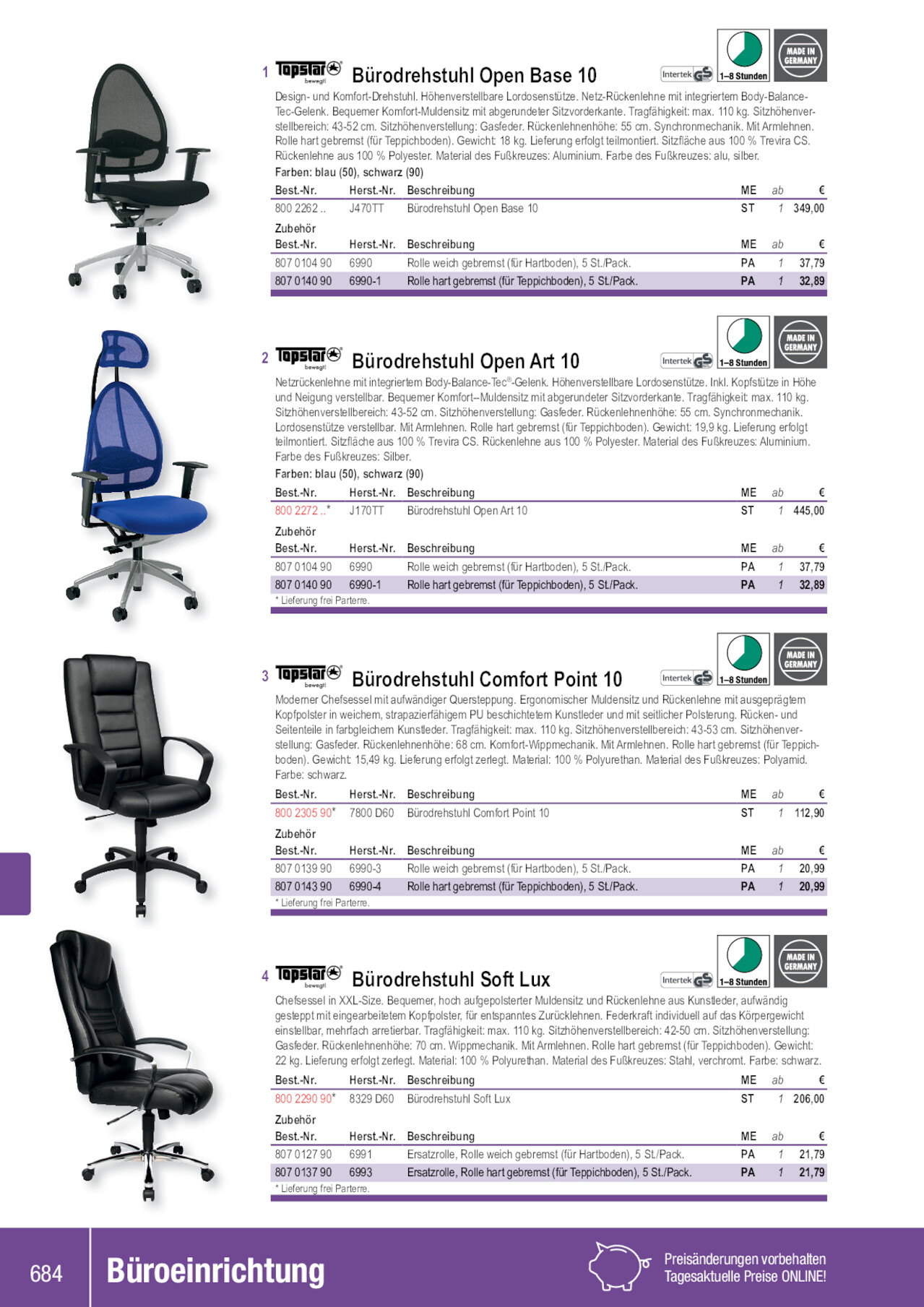 1 Bürodrehstuhl Open Base 10 Design- und Komfort-Drehstuhl. Höhenverstellbare Lordosenstütze. Netz-Rückenlehne mit integriertem Body-BalanceTec-Gelenk. Bequemer Komfort-Muldensitz mit abgerundeter Sitzvorderkante. Tragfähigkeit: max. 110 kg. Sitzhöhenverstellbereich: 43-52 cm. Sitzhöhenverstellung: Gasfeder. Rückenlehnenhöhe: 55 cm. Synchronmechanik. Mit Armlehnen. Rolle hart gebremst (für Teppichboden). Gewicht: 18 kg. Lieferung erfolgt teilmontiert. Sitzfläche aus 100 % Trevira CS. Rückenlehne aus 100 % Polyester. Material des Fußkreuzes: Aluminium. Farbe des Fußkreuzes: alu, silber. Farben: blau (50), schwarz (90) Best.-Nr. Herst.-Nr. Beschreibung ME ab € 800 2262 .. J470TT Bürodrehstuhl Open Base 10 ST 1 349,00 Zubehör Best.-Nr. Herst.-Nr. Beschreibung ME ab € 807 0104 90 6990 Rolle weich gebremst (für Hartboden), 5 St./Pack. PA 1 37,79 807 0140 90 6990-1 Rolle hart gebremst (für Teppichboden), 5 St./Pack. PA 1 32,89 2 Bürodrehstuhl Open Art 10 Netzrückenlehne mit integriertem Body-Balance-Tec®-Gelenk. Höhenverstellbare Lordosenstütze. Inkl. Kopfstütze in Höhe und Neigung verstellbar. Bequemer Komfort--Muldensitz mit abgerundeter Sitzvorderkante. Tragfähigkeit: max. 110 kg. Sitzhöhenverstellbereich: 43-52 cm. Sitzhöhenverstellung: Gasfeder. Rückenlehnenhöhe: 55 cm. Synchronmechanik. Lordosenstütze verstellbar. Mit Armlehnen. Rolle hart gebremst (für Teppichboden). Gewicht: 19,9 kg. Lieferung erfolgt teilmontiert. Sitzfläche aus 100 % Trevira CS. Rückenlehne aus 100 % Polyester. Material des Fußkreuzes: Aluminium. Farbe des Fußkreuzes: Silber. Farben: blau (50), schwarz (90) Best.-Nr. Herst.-Nr. Beschreibung 800 2272 ..* J170TT Bürodrehstuhl Open Art 10 ME ab € ST 1 445,00 Zubehör Best.-Nr. Herst.-Nr. Beschreibung ME ab € 807 0104 90 6990 807 0140 90 6990-1 * Lieferung frei Parterre. Rolle weich gebremst (für Hartboden), 5 St./Pack. Rolle hart gebremst (für Teppichboden), 5 St./Pack. PA 1 37,79 PA 1 32,89 3 Bürodrehstuhl Comfort Point 10 Moderner Chefsessel mit aufwändiger Quersteppung. Ergonomischer Muldensitz und Rückenlehne mit ausgeprägtem Kopfpolster in weichem, strapazierfähigem PU beschichtetem Kunstleder und mit seitlicher Polsterung. Rücken- und Seitenteile in farbgleichem Kunstleder. Tragfähigkeit: max. 110 kg. Sitzhöhenverstellbereich: 43-53 cm. Sitzhöhenverstellung: Gasfeder. Rückenlehnenhöhe: 68 cm. Komfort-Wippmechanik. Mit Armlehnen. Rolle hart gebremst (für Teppichboden). Gewicht: 15,49 kg. Lieferung erfolgt zerlegt. Material: 100 % Polyurethan. Material des Fußkreuzes: Polyamid. Farbe: schwarz. Best.-Nr. Herst.-Nr. Beschreibung 800 2305 90* 7800 D60 Bürodrehstuhl Comfort Point 10 ME ab € ST 1 112,90 Zubehör Best.-Nr. Herst.-Nr. Beschreibung ME ab € 807 0139 90 6990-3 807 0143 90 6990-4 * Lieferung frei Parterre. Rolle weich gebremst (für Hartboden), 5 St./Pack. Rolle hart gebremst (für Teppichboden), 5 St./Pack. PA 1 20,99 PA 1 20,99 4 Bürodrehstuhl Soft Lux Chefsessel in XXL-Size. Bequemer, hoch aufgepolsterter Muldensitz und Rückenlehne aus Kunstleder, aufwändig gesteppt mit eingearbeitetem Kopfpolster, für entspanntes Zurücklehnen. Federkraft individuell auf das Körpergewicht einstellbar, mehrfach arretierbar. Tragfähigkeit: max. 110 kg. Sitzhöhenverstellbereich: 42-50 cm. Sitzhöhenverstellung: Gasfeder. Rückenlehnenhöhe: 70 cm. Wippmechanik. Mit Armlehnen. Rolle hart gebremst (für Teppichboden). Gewicht: 22 kg. Lieferung erfolgt zerlegt. Material: 100 % Polyurethan. Material des Fußkreuzes: Stahl, verchromt. Farbe: schwarz. Best.-Nr. Herst.-Nr. Beschreibung 800 2290 90* 8329 D60 Bürodrehstuhl Soft Lux ME ab € ST 1 206,00 Zubehör Best.-Nr. Herst.-Nr. Beschreibung ME ab € 807 0127 90 6991 807 0137 90 6993 * Lieferung frei Parterre. Ersatzrolle, Rolle weich gebremst (für Hartboden), 5 St./Pack. Ersatzrolle, Rolle hart gebremst (für Teppichboden), 5 St./Pack. PA 1 21,79 PA 1 21,79 684 Büroeinrichtung Preisänderungen vorbehalten Tagesaktuelle Preise ONLINE! 800226250 800230590 800229090 800227250 800226290 800227290
