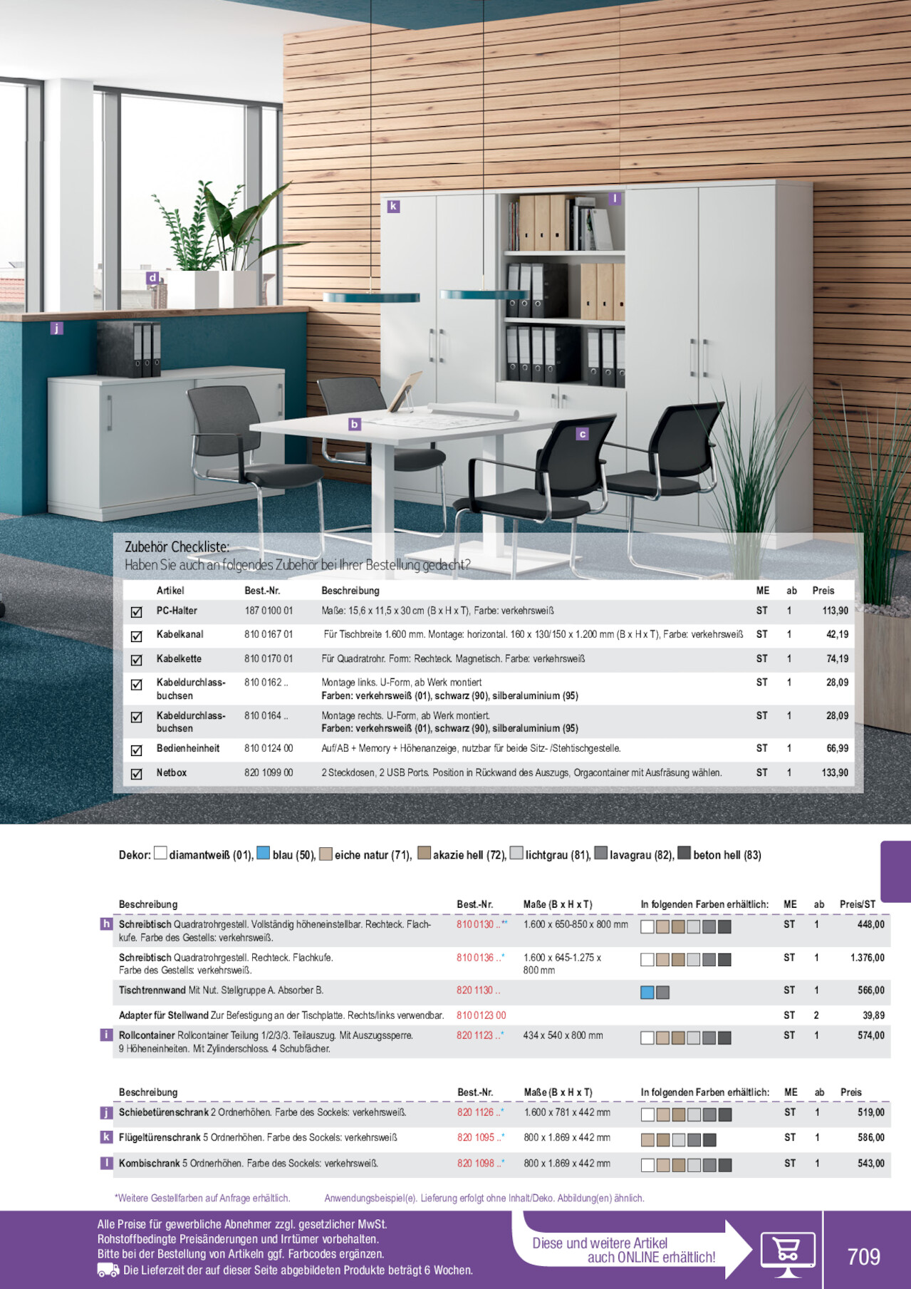 d j kl b c Zubehör Checkliste: Haben Sie auch an folgendes Zubehör bei Ihrer Bestellung gedacht? Artikel  PC-Halter  Kabelkanal  Kabelkette  Kabeldurchlass- buchsen  Kabeldurchlass- buchsen  Bedienheinheit  Netbox Best.-Nr. 187 0100 01 810 0167 01 810 0170 01 810 0162 .. 810 0164 .. 810 0124 00 820 1099 00 Beschreibung Maße: 15,6 x 11,5 x 30 cm (B x H x T), Farbe: verkehrsweiß ME ab Preis ST 1 113,90 Für Tischbreite 1.600 mm. Montage: horizontal. 160 x 130/150 x 1.200 mm (B x H x T), Farbe: verkehrsweiß ST 1 42,19 Für Quadratrohr. Form: Rechteck. Magnetisch. Farbe: verkehrsweiß ST 1 74,19 Montage links. U -Form, ab Werk montiert Farben: verkehrsweiß (01), schwarz (90), silberaluminium (95) Montage rechts. U -Form, ab Werk montiert. Farben: verkehrsweiß (01), schwarz (90), silberaluminium (95) Auf/AB + Memory + Höhenanzeige, nutzbar für beide Sitz- /Stehtischgestelle. ST 1 ST 1 ST 1 28,09 28,09 66,99 2 Steckdosen, 2 U SB Ports. Position in Rückwand des Auszugs, Orgacontainer mit Ausfräsung wählen. ST 1 133,90 Dekor: diamantweiß (01), blau (50), eiche natur (71), akazie hell (72), lichtgrau (81), lavagrau (82), beton hell (83) Beschreibung h Schreibtisch Quadratrohrgestell. V ollständig höheneinstellbar. Rechteck. Flachkufe. Farbe des Gestells: verkehrsweiß. Schreibtisch Quadratrohrgestell. Rechteck. Flachkufe. Farbe des Gestells: verkehrsweiß. Tischtrennwand Mit Nut. Stellgruppe A. Absorber B. Best.-Nr. Maße (B x H x T) In folgenden Farben erhältlich: ME ab Preis/ST 810 0130 ..** 1.600 x 650-850 x 800 mm ST 1 448,00 810 0136 ..* 820 1130 .. 1.600 x 645-1.275 x 800 mm ST 1 ST 1 1.376,00 566,00 Adapter für Stellwand Zur Befestigung an der Tischplatte. Rechts/links verwendbar. 810 0123 00 i Rollcontainer Rollcontainer Teilung 1/2/3/3. Teilauszug. Mit Auszugssperre. 9 Höheneinheiten. Mit Zy linderschloss. 4 Schubfächer. 820 1123 ..* 434 x 540 x 800 mm ST 2 ST 1 39,89 574,00 Beschreibung j Schiebetürenschrank 2 Ordnerhöhen. Farbe des Sockels: verkehrsweiß. k Flügeltürenschrank 5 Ordnerhöhen. Farbe des Sockels: verkehrsweiß l Kombischrank 5 Ordnerhöhen. Farbe des Sockels: verkehrsweiß. Best.-Nr. 820 1126 ..* 820 1095 ..* 820 1098 ..* Maße (B x H x T) 1.600 x 781 x 442 mm 800 x 1.869 x 442 mm 800 x 1.869 x 442 mm In folgenden Farben erhältlich: ME ab Preis ST 1 519,00 ST 1 586,00 ST 1 543,00 *Weitere Gestellfarben auf Anfrage erhältlich. Anwendungsbeispiel(e). Lieferung erfolgt ohne Inhalt/Deko. Abbildung(en) ähnlich. Alle Preise für gewerbliche Abnehmer zzgl. gesetzlicher MwSt. Rohstoffbedingte Preisänderungen und Irrtümer vorbehalten. Bitte bei der Bestellung von Artikeln ggf. Farbcodes ergänzen. Die Lieferzeit der auf dieser Seite abgebildeten Produkte beträgt 6 Wochen. Diese und weitere Artikel auch ONLINE erhältlich! 709 820112301 810013001 810012400 820112383 820109583 820109801 820109900 810013671 820112672 820113082 810013682 810016701 820112381 820112682 820112683 810016495 820109872 810016401 810013601 820109572 820112671 820109571 820109883 820112382 820109882 810013071 810016295 187010001 810017001 820112601 820109881 810013082 820109871 810016290 820109581 820112371 810013083 810013681 820109582 810013672 810016490 820113050 810013081 810013072 810013683 820112372 820112681 810016201