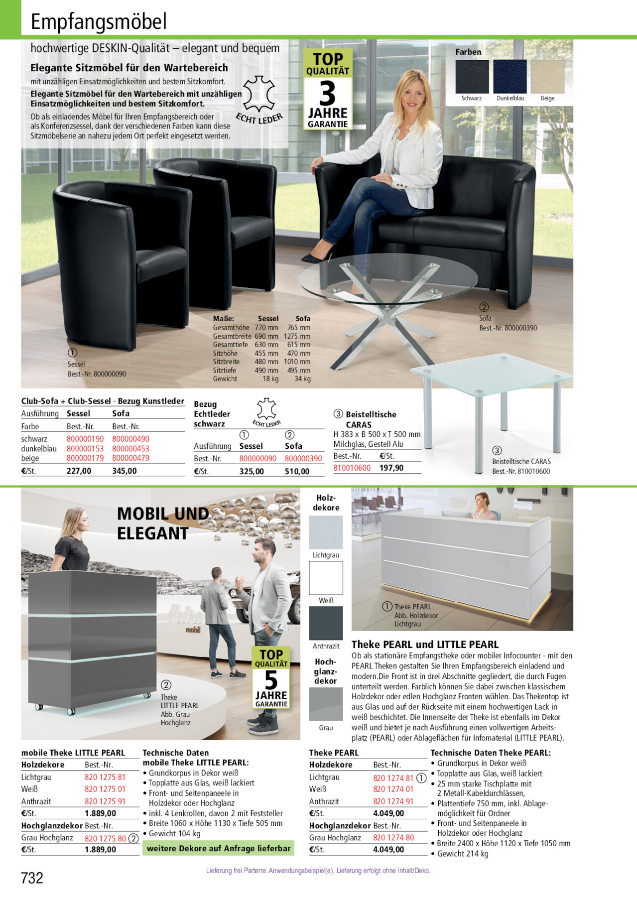 Empfangsmöbel hochwertige DESKIN-Qualität – elegant und bequem Elegante Sitzmöbel für den Wartebereich mit unzähligen Einsatzmöglichkeiten und bestem Sitzkomfort. Elegante Sitzmöbel für den Wartebereich mit unzähligen Einsatzmöglichkeiten und bestem Sitzkomfort. Ob als einladendes Möbel für Ihren Empfangsbereich oder als Konferenzsessel, dank der verschiedenen Farben kann diese Sitzmöbelserie an nahezu jedem Ort perfekt eingesetzt werden. TOP 3QUALITÄT JAHRE GARANTIE Farben Schwarz Dunkelblau Beige ቢ Sessel Best.-Nr. 800000090 Maße: Sessel Sofa Gesamthöhe 770 mm 765 mm Gesamtbreite 690 mm 1275 mm Gesamttiefe 630 mm 615 mm Sitzhöhe 455 mm 470 mm Sitzbreite 480 mm 1010 mm Sitztiefe 490 mm 495 mm Gewicht 18 kg 34 kg Club-Sofa + Club-Sessel - Bezug Kunstleder Ausführung Sessel Sofa Farbe Best.-Nr. Best.-Nr. schwarz 800000190 800000490 dunkelblau 800000153 800000453 beige 800000179 800000479 €/St. 227,00 345,00 Bezug Echtleder schwarz Ausführung Best.-Nr. €/St. ቢ Sessel 800000090 325,00 ባ Sofa 800000390 510,00 ቤ Beistelltische CARAS H 383 x B 500 x T 500 mm Milchglas, Gestell Alu Best.-Nr. €/St. 810010600 197,90 MOBIL UND ELEGANT Holzdekore Lichtgrau ባ Sofa Best.-Nr. 800000390 ቤ Beistelltische CARAS Best.-Nr. 810010600 Weiß ቢ Theke PEARL Abb. Holzdekor Lichtgrau ባ Theke LITTLE PEARL Abb. Grau Hochglanz TOP 5QUALITÄT JAHRE GARANTIE mobile Theke LITTLE PEARL Technische Daten Holzdekore Lichtgrau Weiß Anthrazit Best.-Nr. 820 1275 81 820 1275 01 820 1275 91 mobile Theke LITTLE PEARL: • Grundkorpus in Dekor weiß • Topplatte aus Glas, weiß lackiert • Front- und Seitenpaneele in Holzdekor oder Hochglanz €/St. 1.889,00 • inkl. 4 Lenkrollen, davon 2 mit Feststeller Hochglanzdekor Best.-Nr. • Breite 1060 x Höhe 1130 x Tiefe 505 mm Grau Hochglanz 820 1275 80 ባ • Gewicht 104 kg €/St. 1.889,00 weitere Dekore auf Anfrage lieferbar Anthrazit Hochglanzdekor Grau Theke PEARL und LITTLE PEARL Ob als stationäre Empfangstheke oder mobiler Infocounter - mit den PEARL Theken gestalten Sie Ihren Empfangsbereich einladend und modern.Die Front ist in drei Abschnitte gegliedert, die durch Fugen unterteilt werden. Farblich können Sie dabei zwischen klassischem Holzdekor oder edlen Hochglanz Fronten wählen. Das Thekentop ist aus Glas und auf der Rückseite mit einem hochwertigen Lack in weiß beschichtet. Die Innenseite der Theke ist ebenfalls im Dekor weiß und bietet je nach Ausführung einen vollwertigen Arbeitsplatz (PEARL) oder Ablageflächen für Infomaterial (LITTLE PEARL). Theke PEARL Technische Daten Theke PEARL: Holzdekore Best.-Nr. • Grundkorpus in Dekor weiß Lichtgrau Weiß Anthrazit 820 820 1274 1274 81 01 ቢ • Topplatte aus Glas, weiß lackiert • 25 mm starke Tischplatte mit 2 Metall-Kabeldurchlässen, 820 1274 91 • Plattentiefe 750 mm, inkl. Ablage- €/St. 4.049,00 möglichkeit für Ordner Hochglanzdekor Best.-Nr. Grau Hochglanz 820 1274 80 €/St. 4.049,00 • Front- und Seitenpaneele in Holzdekor oder Hochglanz • Breite 2400 x Höhe 1120 x Tiefe 1050 mm • Gewicht 214 kg 732 Lieferung frei Parterre. Anwendungsbeispiel(e). Lieferung erfolgt ohne Inhalt/Deko. 820127401 800000390 810010600 820127581 820127580 800000190 820127481 800000453 800000153 820127501 820127491 820127480 800000090 800000179 820127591 800000490 800000479