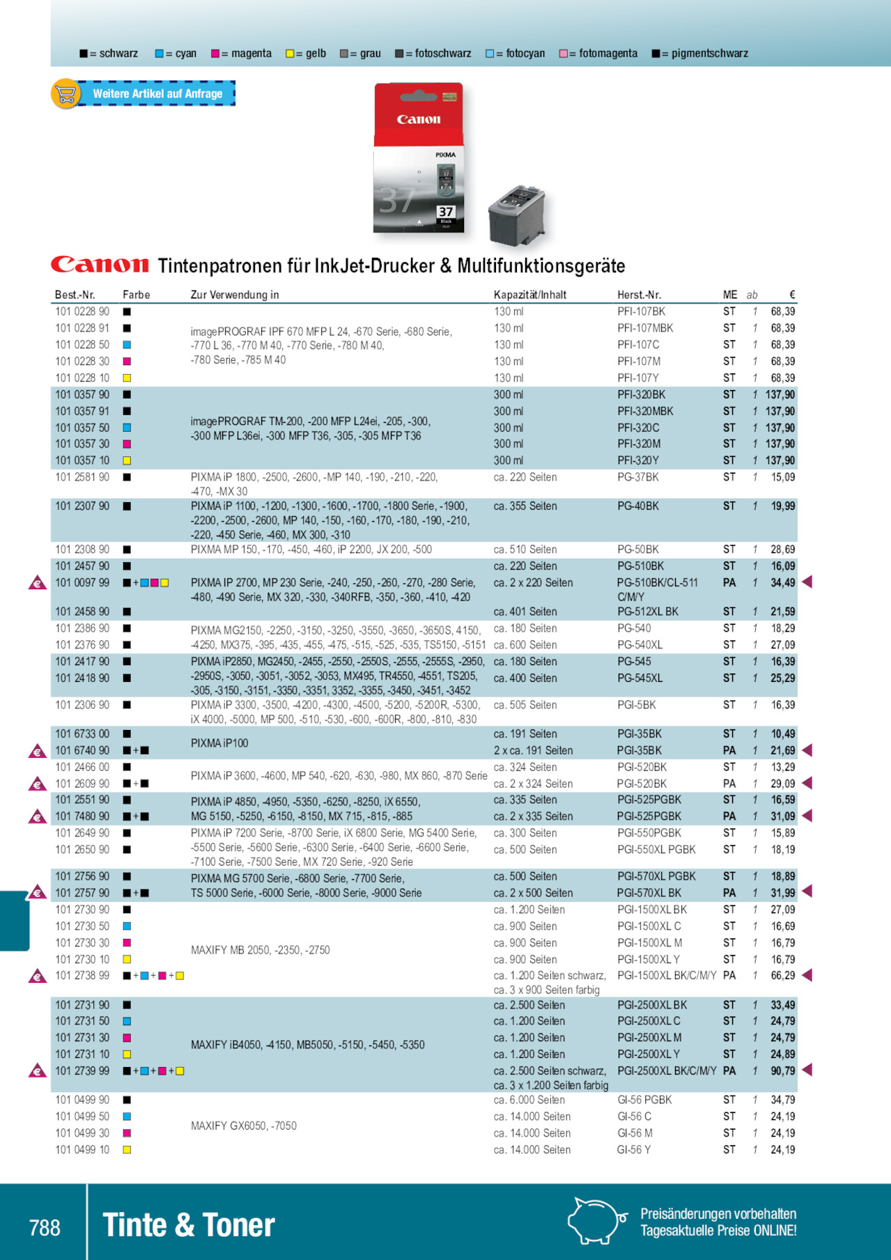 = schwarz = cyan = magenta = gelb = grau = fotoschwarz = fotocyan = fotomagenta = pigmentschwarz Weitere Artikel auf Anfrage Tintenpatronen für InkJet-Drucker & Multifunktionsgeräte Best.-Nr. 101 0228 90 101 0228 91 101 0228 50 101 0228 30 101 0228 10 101 0357 90 101 0357 91 101 0357 50 101 0357 30 101 0357 10 101 2581 90 Farbe 101 2307 90 101 2308 90 101 2457 90 101 0097 99 101 2458 90 101 2386 90 101 2376 90 101 2417 90 101 2418 90 101 2306 90 101 6733 00 101 6740 90 101 2466 00 101 2609 90 101 2551 90 101 7480 90 101 2649 90 101 2650 90 101 2756 90 101 2757 90 101 2730 90 101 2730 50 101 2730 30 101 2730 10 101 2738 99 101 2731 90 101 2731 50 101 2731 30 101 2731 10 101 2739 99 101 0499 90 101 0499 50 101 0499 30 101 0499 10 + + + + + +++ +++ Zur Verwendung in Kapazität/Inhalt Herst.-Nr. ME ab € 130 ml PFI-107BK ST 1 68,39 imagePROGRAF IPF 670 MFP L 24, -670 Serie, -680 Serie, -770 L 36, -770 M 40, -770 Serie, -780 M 40, -780 Serie, -785 M 40 130 ml 130 ml 130 ml PFI-107MBK PFI-107C PFI-107M ST 1 68,39 ST 1 68,39 ST 1 68,39 130 ml PFI-107Y ST 1 68,39 300 ml PFI-320BK ST 1 137,90 imagePROGRAF TM-200, -200 MFP L24ei, -205, -300, -300 MFP L36ei, -300 MFP T36, -305, -305 MFP T36 300 ml 300 ml 300 ml PFI-320MBK PFI-320C PFI-320M ST 1 137,90 ST 1 137,90 ST 1 137,90 300 ml PFI-320Y ST 1 137,90 PIXMA iP 1800, -2500, -2600, -MP 140, -190, -210, -220, -470, -MX 30 PIXMA iP 1100, -1200, -1300, -1600, -1700, -1800 Serie, -1900, -2200, -2500, -2600, MP 140, -150, -160, -170, -180, -190, -210, -220, -450 Serie, -460, MX 300, -310 PIXMA MP 150, -170, -450, -460, iP 2200, JX 200, -500 ca. 220 Seiten ca. 355 Seiten ca. 510 Seiten PG-37BK PG-40BK PG-50BK ST 1 15,09 ST 1 19,99 ST 1 28,69 ca. 220 Seiten PG-510BK ST 1 16,09 PIXMA IP 2700, MP 230 Serie, -240, -250, -260, -270, -280 Serie, -480, -490 Serie, MX 320, -330, -340RFB, -350, -360, -410, -420 ca. 2 x 220 Seiten ca. 401 Seiten PG-510BK/CL-511 C/M/Y PG-512XL BK PA 1 34,49 ST 1 21,59 PIXMA MG2150, -2250, -3150, -3250, -3550, -3650, -3650S, 4150, ca. 180 Seiten -4250, MX375, -395, -435, -455, -475, -515, -525, -535, TS5150, -5151 ca. 600 Seiten PG-540 PG-540XL ST 1 18,29 ST 1 27,09 PIXMA iP2850, MG2450, -2455, -2550, -2550S, -2555, -2555S, -2950, ca. 180 Seiten -2950S, -3050, -3051, -3052, -3053, MX495, TR4550, -4551, TS205, ca. 400 Seiten -305, -3150, -3151, -3350, -3351, 3352, -3355, -3450, -3451, -3452 PIXMA iP 3300, -3500, -4200, -4300, -4500, -5200, -5200R, -5300, ca. 505 Seiten iX 4000, -5000, MP 500, -510, -530, -600, -600R, -800, -810, -830 PIXMA iP100 ca. 191 Seiten 2 x ca. 191 Seiten PG-545 PG-545XL PGI-5BK PGI-35BK PGI-35BK ST 1 16,39 ST 1 25,29 ST 1 16,39 ST 1 10,49 PA 1 21,69 ca. 324 Seiten PIXMA iP 3600, -4600, MP 540, -620, -630, -980, MX 860, -870 Serie ca. 2 x 324 Seiten PGI-520BK PGI-520BK ST 1 13,29 PA 1 29,09 PIXMA iP 4850, -4950, -5350, -6250, -8250, iX 6550, MG 5150, -5250, -6150, -8150, MX 715, -815, -885 ca. 335 Seiten ca. 2 x 335 Seiten PGI-525PGBK PGI-525PGBK ST 1 16,59 PA 1 31,09 PIXMA iP 7200 Serie, -8700 Serie, iX 6800 Serie, MG 5400 Serie, -5500 Serie, -5600 Serie, -6300 Serie, -6400 Serie, -6600 Serie, -7100 Serie, -7500 Serie, MX 720 Serie, -920 Serie PIXMA MG 5700 Serie, -6800 Serie, -7700 Serie, TS 5000 Serie, -6000 Serie, -8000 Serie, -9000 Serie ca. 300 Seiten ca. 500 Seiten ca. 500 Seiten ca. 2 x 500 Seiten PGI-550PGBK PGI-550XL PGBK PGI-570XL PGBK PGI-570XL BK ST 1 15,89 ST 1 18,19 ST 1 18,89 PA 1 31,99 ca. 1.200 Seiten PGI-1500XL BK ST 1 27,09 ca. 900 Seiten PGI-1500XL C ST 1 16,69 MAXIFY MB 2050, -2350, -2750 ca. 900 Seiten ca. 900 Seiten PGI-1500XL M PGI-1500XL Y ST 1 16,79 ST 1 16,79 ca. 1.200 Seiten schwarz, PGI-1500XL BK/C/M/Y PA 1 66,29 ca. 3 x 900 Seiten farbig ca. 2.500 Seiten PGI-2500XL BK ST 1 33,49 ca. 1.200 Seiten PGI-2500XL C ST 1 24,79 MAXIFY iB4050, -4150, MB5050, -5150, -5450, -5350 ca. 1.200 Seiten ca. 1.200 Seiten PGI-2500XL M PGI-2500XL Y ST 1 24,79 ST 1 24,89 ca. 2.500 Seiten schwarz, PGI-2500XL BK/C/M/Y PA 1 90,79 ca. 3 x 1.200 Seiten farbig ca. 6.000 Seiten GI-56 PGBK ST 1 34,79 MAXIFY GX6050, -7050 ca. 14.000 Seiten ca. 14.000 Seiten GI-56 C GI-56 M ST 1 24,19 ST 1 24,19 ca. 14.000 Seiten GI-56 Y ST 1 24,19 788 Tinte & Toner Preisänderungen vorbehalten Tagesaktuelle Preise ONLINE! 101241790 101009799 101673300 101245890 101273090 101022810 101049990 101273110 101273050 101035790 101275790 101265090 101748090 101273999 101245790 101260990 101264990 101273030 101035750 101035791 101022890 101035710 101230690 101241890 101255190 101273190 101273899 101230890 101237690 101273010 101035730 101230790 101022850 101049950 101238690 101049910 101246600 101049930 101258190 101273130 101273150 101275690 101674090 101022830 101022891