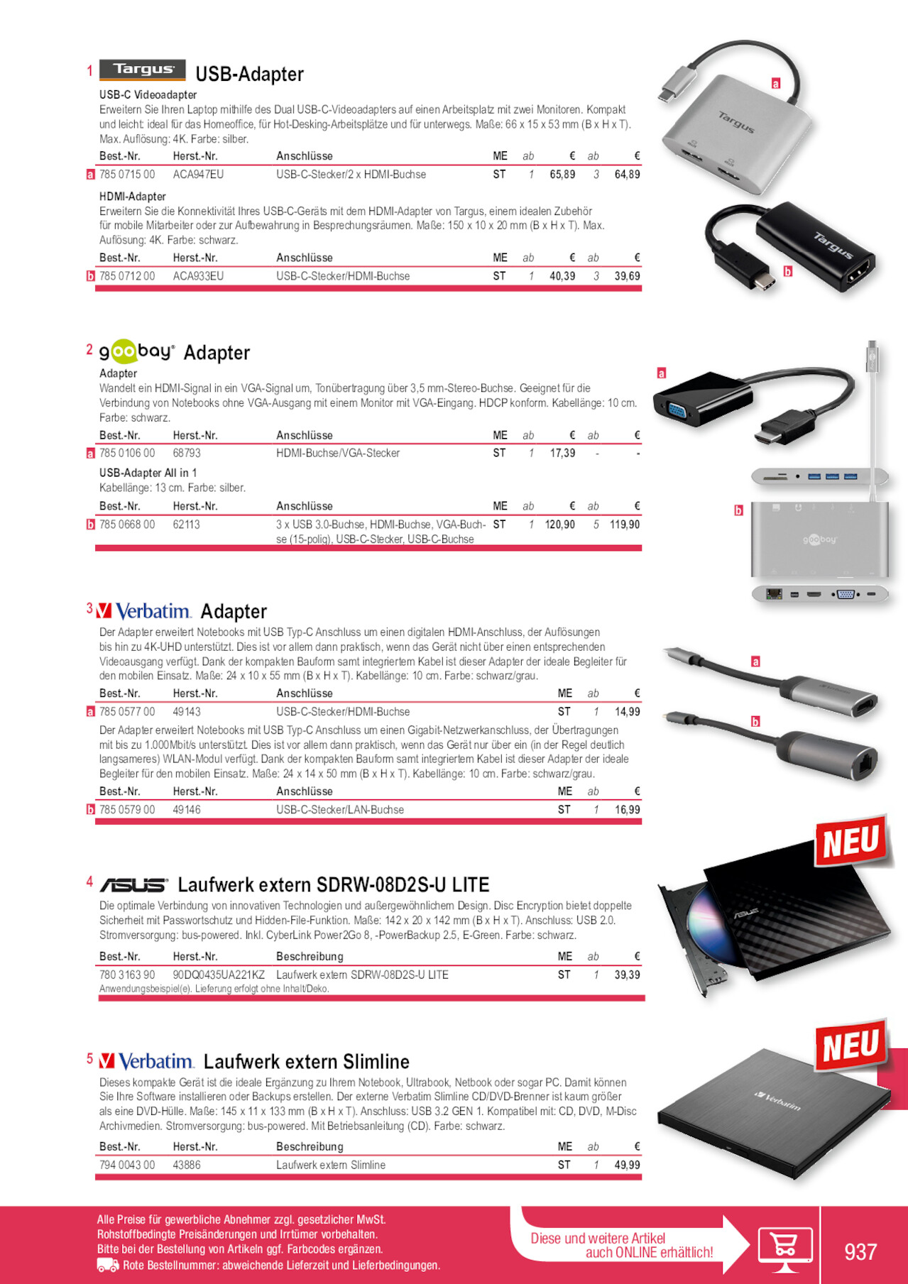 1 USB-Adapter USB-C Videoadapter Erweitern Sie Ihren Laptop mithilfe des Dual USB-C-Videoadapters auf einen Arbeitsplatz mit zwei Monitoren. Kompakt und leicht: ideal für das Homeoffice, für Hot-Desking-Arbeitsplätze und für unterwegs. Maße: 66 x 15 x 53 mm (B x H x T). Max. Auflösung: 4K. Farbe: silber. Best.-Nr. Herst.-Nr. Anschlüsse ME ab € ab € a 785 0715 00 ACA947EU USB-C-Stecker/2 x HDMI-Buchse ST 1 65,89 3 64,89 HDMI-Adapter Erweitern Sie die Konnektivität Ihres USB-C-Geräts mit dem HDMI-Adapter von Targus, einem idealen Zubehör für mobile Mitarbeiter oder zur Aufbewahrung in Besprechungsräumen. Maße: 150 x 10 x 20 mm (B x H x T). Max. Auflösung: 4K. Farbe: schwarz. Best.-Nr. Herst.-Nr. Anschlüsse ME ab € ab € b 785 0712 00 ACA933EU USB-C-Stecker/HDMI-Buchse ST 1 40,39 3 39,69 a b 2 Adapter Adapter Wandelt ein HDMI-Signal in ein VGA-Signal um, Tonübertragung über 3,5 mm-Stereo-Buchse. Geeignet für die Verbindung von Notebooks ohne VGA-Ausgang mit einem Monitor mit VGA-Eingang. HDCP konform. Kabellänge: 10 cm. Farbe: schwarz. Best.-Nr. Herst.-Nr. Anschlüsse ME ab € ab € a 785 0106 00 68793 HDMI-Buchse/VGA-Stecker ST 1 17,39 - - USB-Adapter All in 1 Kabellänge: 13 cm. Farbe: silber. Best.-Nr. Herst.-Nr. Anschlüsse ME ab € ab € b 785 0668 00 62113 3 x USB 3.0-Buchse, HDMI-Buchse, VGA-Buch- ST 1 120,90 5 119,90 se (15-polig), USB-C-Stecker, USB-C-Buchse a 3 Adapter Der Adapter erweitert Notebooks mit USB Typ-C Anschluss um einen digitalen HDMI-Anschluss, der Auflösungen bis hin zu 4K-UHD unterstützt. Dies ist vor allem dann praktisch, wenn das Gerät nicht über einen entsprechenden Videoausgang verfügt. Dank der kompakten Bauform samt integriertem Kabel ist dieser Adapter der ideale Begleiter für den mobilen Einsatz. Maße: 24 x 10 x 55 mm (B x H x T). Kabellänge: 10 cm. Farbe: schwarz/grau. Best.-Nr. Herst.-Nr. Anschlüsse ME ab € a 785 0577 00 49143 USB-C-Stecker/HDMI-Buchse ST 1 14,99 Der Adapter erweitert Notebooks mit USB Typ-C Anschluss um einen Gigabit-Netzwerkanschluss, der Übertragungen mit bis zu 1.000Mbit/s unterstützt. Dies ist vor allem dann praktisch, wenn das Gerät nur über ein (in der Regel deutlich langsameres) WLAN-Modul verfügt. Dank der kompakten Bauform samt integriertem Kabel ist dieser Adapter der ideale Begleiter für den mobilen Einsatz. Maße: 24 x 14 x 50 mm (B x H x T). Kabellänge: 10 cm. Farbe: schwarz/grau. Best.-Nr. Herst.-Nr. Anschlüsse ME ab € b 785 0579 00 49146 USB-C-Stecker/LAN-Buchse ST 1 16,99 b a b 4 Laufwerk extern SDRW-08D2S-U LITE Die optimale Verbindung von innovativen Technologien und außergewöhnlichem Design. Disc Encryption bietet doppelte Sicherheit mit Passwortschutz und Hidden-File-Funktion. Maße: 142 x 20 x 142 mm (B x H x T). Anschluss: USB 2.0. Stromversorgung: bus-powered. Inkl. CyberLink Power2Go 8, -PowerBackup 2.5, E-Green. Farbe: schwarz. Best.-Nr. Herst.-Nr. Beschreibung 780 3163 90 90DQ0435UA221KZ Laufwerk extern SDRW-08D2S-U LITE Anwendungsbeispiel(e). Lieferung erfolgt ohne Inhalt/Deko. ME ab € ST 1 39,39 5 Laufwerk extern Slimline Dieses kompakte Gerät ist die ideale Ergänzung zu Ihrem Notebook, Ultrabook, Netbook oder sogar PC. Damit können Sie Ihre Software installieren oder Backups erstellen. Der externe Verbatim Slimline CD/DVD-Brenner ist kaum größer als eine DVD-Hülle. Maße: 145 x 11 x 133 mm (B x H x T). Anschluss: USB 3.2 GEN 1. Kompatibel mit: CD, DVD, M-Disc Archivmedien. Stromversorgung: bus-powered. Mit Betriebsanleitung (CD). Farbe: schwarz. Best.-Nr. Herst.-Nr. Beschreibung ME ab € 794 0043 00 43886 Laufwerk extern Slimline ST 1 49,99 Alle Preise für gewerbliche Abnehmer zzgl. gesetzlicher MwSt. Rohstoffbedingte Preisänderungen und Irrtümer vorbehalten. Bitte bei der Bestellung von Artikeln ggf. Farbcodes ergänzen. Rote Bestellnummer: abweichende Lieferzeit und Lieferbedingungen. Diese und weitere Artikel auch ONLINE erhältlich! 937 785071200 794004300 785057900 785071500 785010600 780316390 785057700 785066800